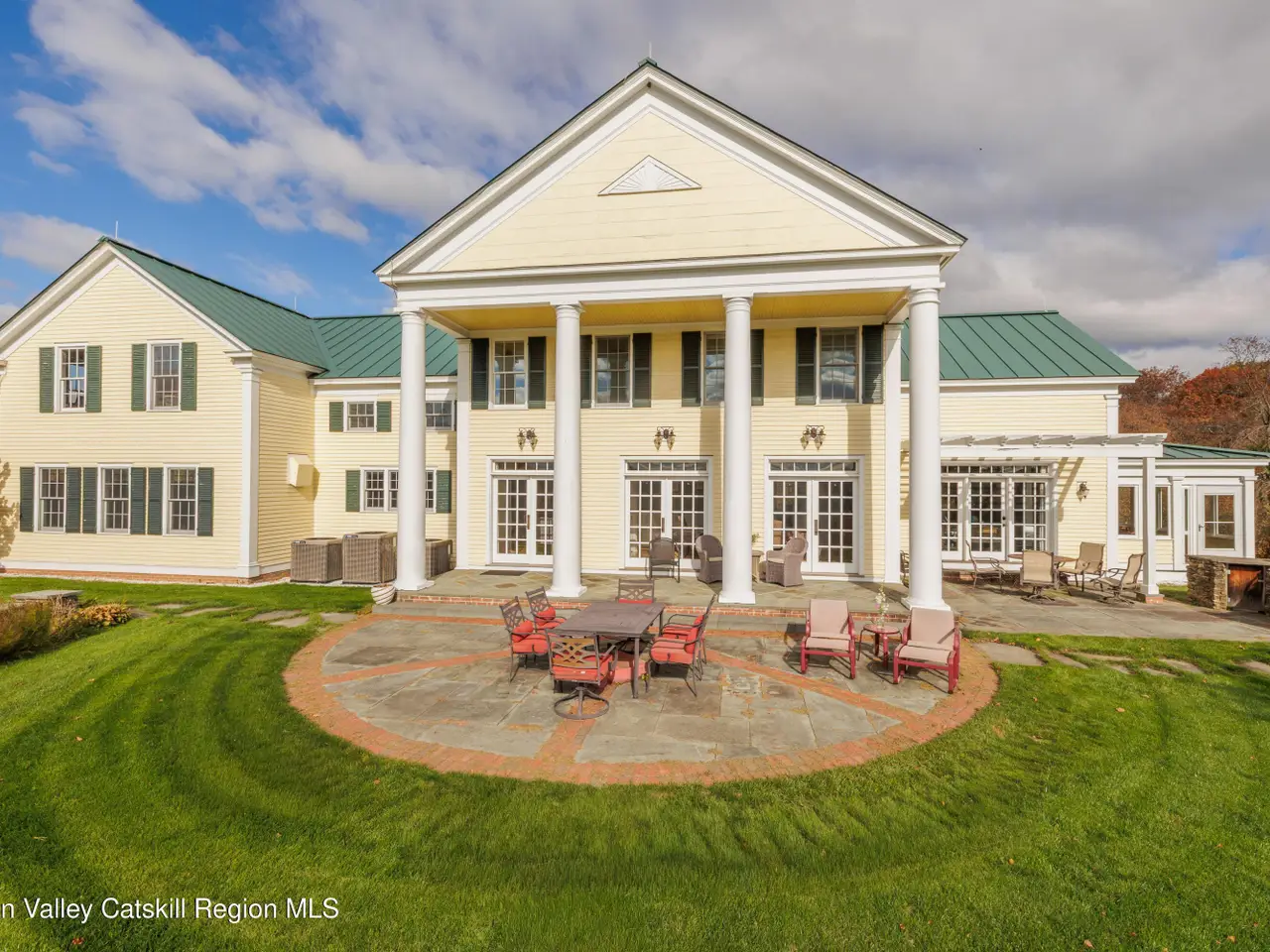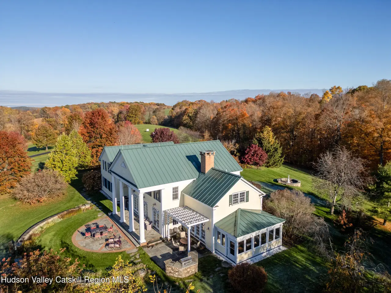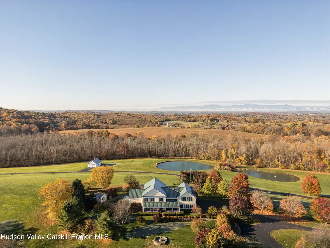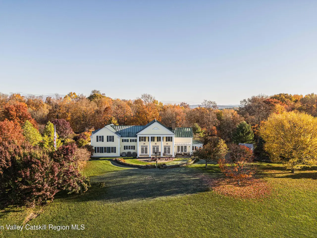 Welcome to Notre Colline Estate, a private country compound set on more than 56 acres of rolling meadows, gardens, ponds, and Catskill Mountain views. French for ''Our Hill,'' Notre Colline has an easy sense of belonging to its landscape. A long-paved drive leads to this elegantly designed 5,760 square-foot home, inspired by classic Greek Revival architecture. Built in 2005 for comfort, entertaining, and longevity, it features a standing-seam metal roof, radiant heated floors, energy-efficient heat pumps, and a fully integrated smart home system that manages lighting, temperature, security, video, and sound. The main level opens to bright, connected gathering spaces centered around a modern chef's kitchen with a large custom island, a counter depth paneled fridge, and professional-grade appliances. French doors from the dining area and breakfast nook open to a wide stone patio with an outdoor kitchen framed by landscaped gardens and open lawns, creating an easy indoor-outdoor flow. A paneled cherry wood office with built-in cabinetry and a wood-burning stove offers a quiet workspace beside a three-season sunroom, and a spacious living room with a gas fireplace invites relaxed evenings with friends and family. Upstairs, the grand primary suite feels like a private retreat, complete with a gas fireplace, two walk-in closets and a luxurious bath with a soaking tub and steam shower. Three additional bedrooms, a guest living room, two full bathrooms and a laundry room complete the second floor. The finished lower level adds generous additional living space with a recreation room, billiards area, kitchenette, sauna and full bath, ideal for guests or wellness use. An attached three-car heated garage features a porcelain tile floor and plenty of space for storage. Outdoors, a peaceful aerated pond lies at the center of the property, crossed by a charming footbridge and bordered by open lawns and walking paths. The grounds also include raised-bed gardens with irrigation, a potting shed, and a newly constructed insulated 26x34 foot outbuilding with water, electric, and space for six or more vehicles. Every detail has been considered for efficiency and ease, from spray-foam insulation and upgraded hydronic systems to improved drainage and a generator. Located minutes from Chatham village, Notre Colline Estate offers refined country living in beautiful Columbia County.
