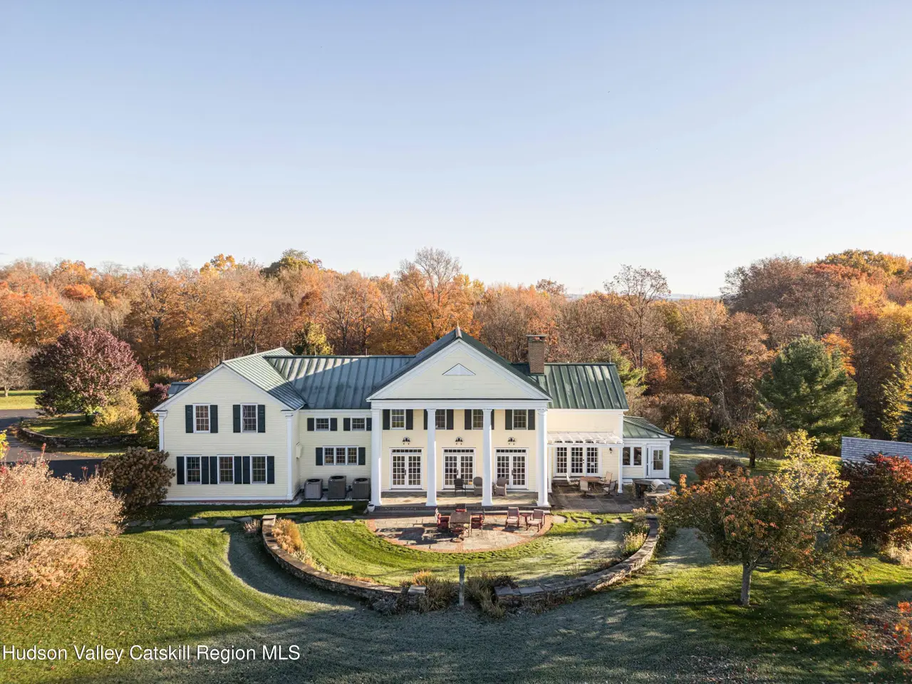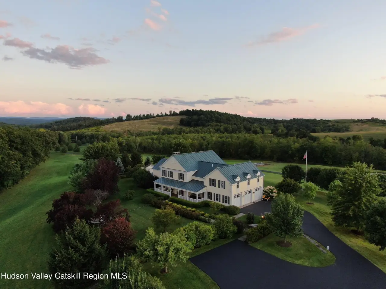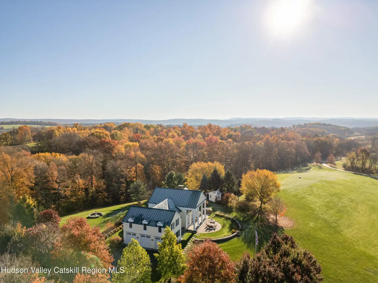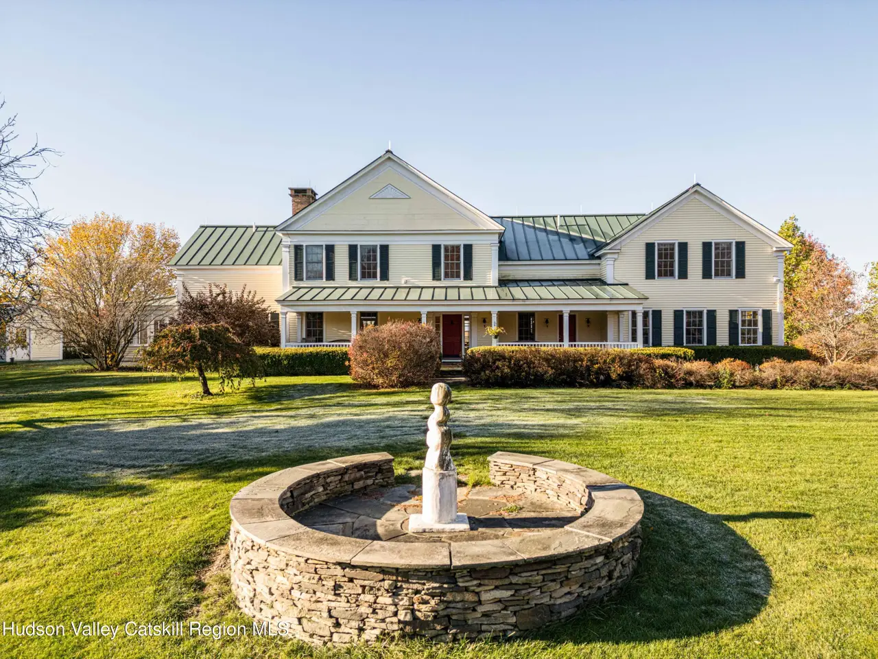 Welcome to Notre Colline Estate, a private country compound set on more than 56 acres of rolling meadows, gardens, ponds, and Catskill Mountain views. French for ''Our Hill,'' Notre Colline has an easy sense of belonging to its landscape. A long-paved drive leads to this elegantly designed 5,760 square-foot home, inspired by classic Greek Revival architecture. Built in 2005 for comfort, entertaining, and longevity, it features a standing-seam metal roof, radiant heated floors, energy-efficient heat pumps, and a fully integrated smart home system that manages lighting, temperature, security, video, and sound. The main level opens to bright, connected gathering spaces centered around a modern chef's kitchen with a large custom island, a counter depth paneled fridge, and professional-grade appliances. French doors from the dining area and breakfast nook open to a wide stone patio with an outdoor kitchen framed by landscaped gardens and open lawns, creating an easy indoor-outdoor flow. A paneled cherry wood office with built-in cabinetry and a wood-burning stove offers a quiet workspace beside a three-season sunroom, and a spacious living room with a gas fireplace invites relaxed evenings with friends and family. Upstairs, the grand primary suite feels like a private retreat, complete with a gas fireplace, two walk-in closets and a luxurious bath with a soaking tub and steam shower. Three additional bedrooms, a guest living room, two full bathrooms and a laundry room complete the second floor. The finished lower level adds generous additional living space with a recreation room, billiards area, kitchenette, sauna and full bath, ideal for guests or wellness use. An attached three-car heated garage features a porcelain tile floor and plenty of space for storage. Outdoors, a peaceful aerated pond lies at the center of the property, crossed by a charming footbridge and bordered by open lawns and walking paths. The grounds also include raised-bed gardens with irrigation, a potting shed, and a newly constructed insulated 26x34 foot outbuilding with water, electric, and space for six or more vehicles. Every detail has been considered for efficiency and ease, from spray-foam insulation and upgraded hydronic systems to improved drainage and a generator. Located minutes from Chatham village, Notre Colline Estate offers refined country living in beautiful Columbia County.