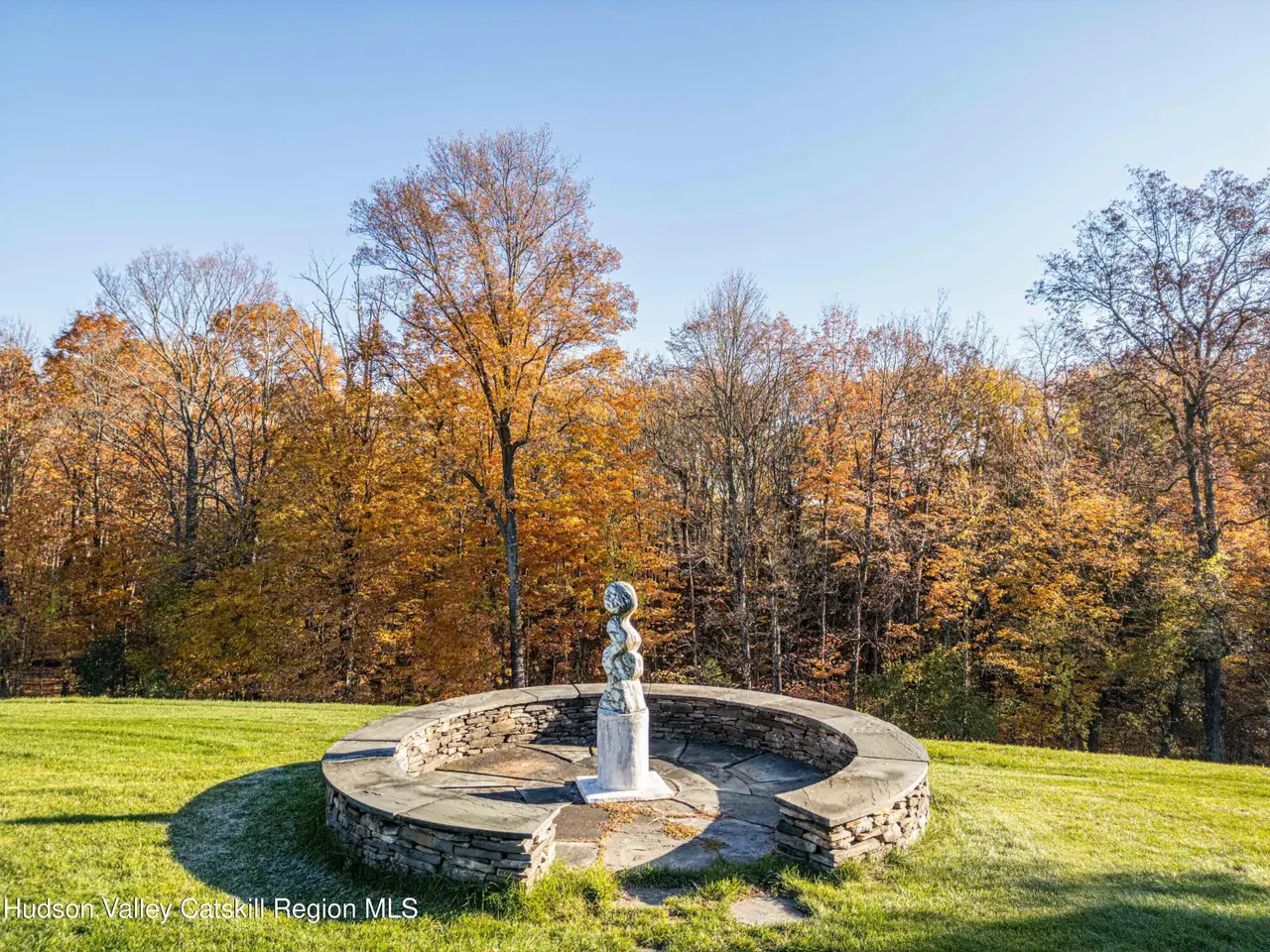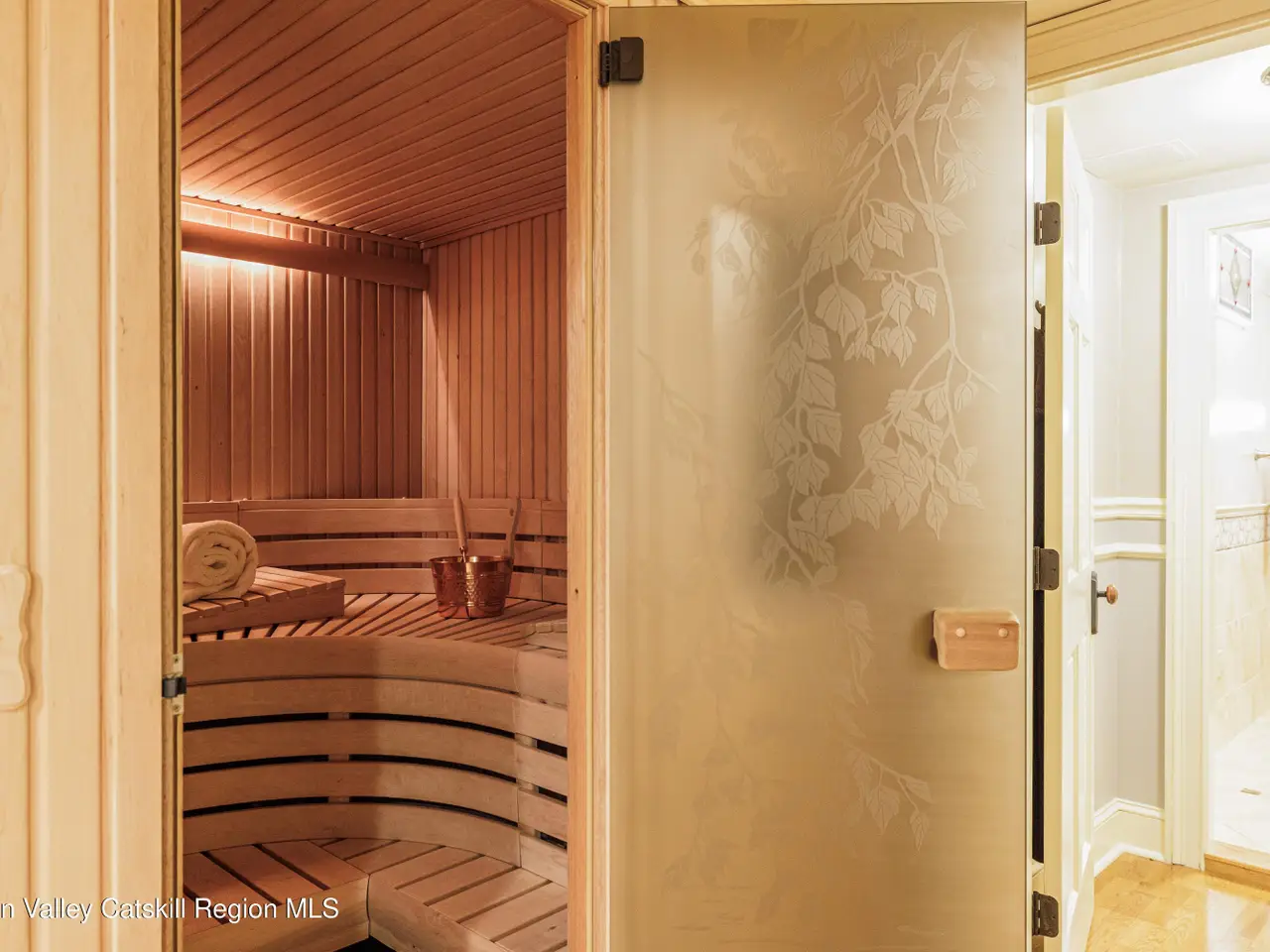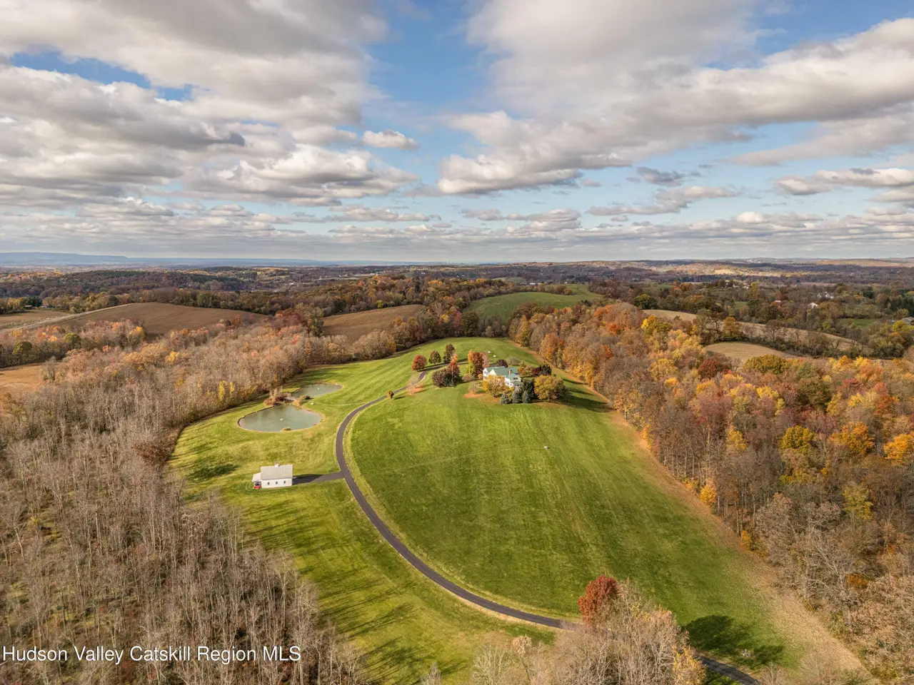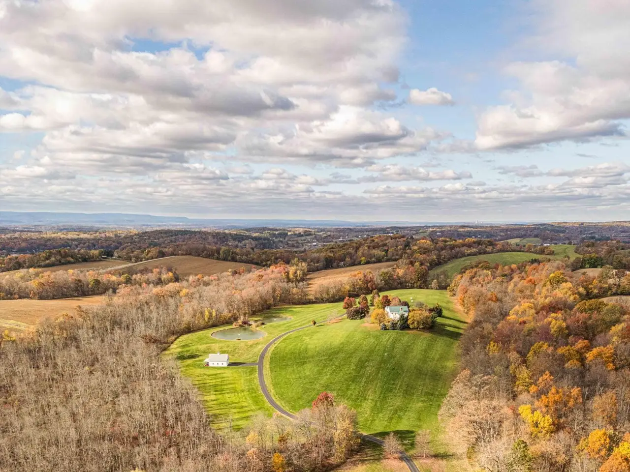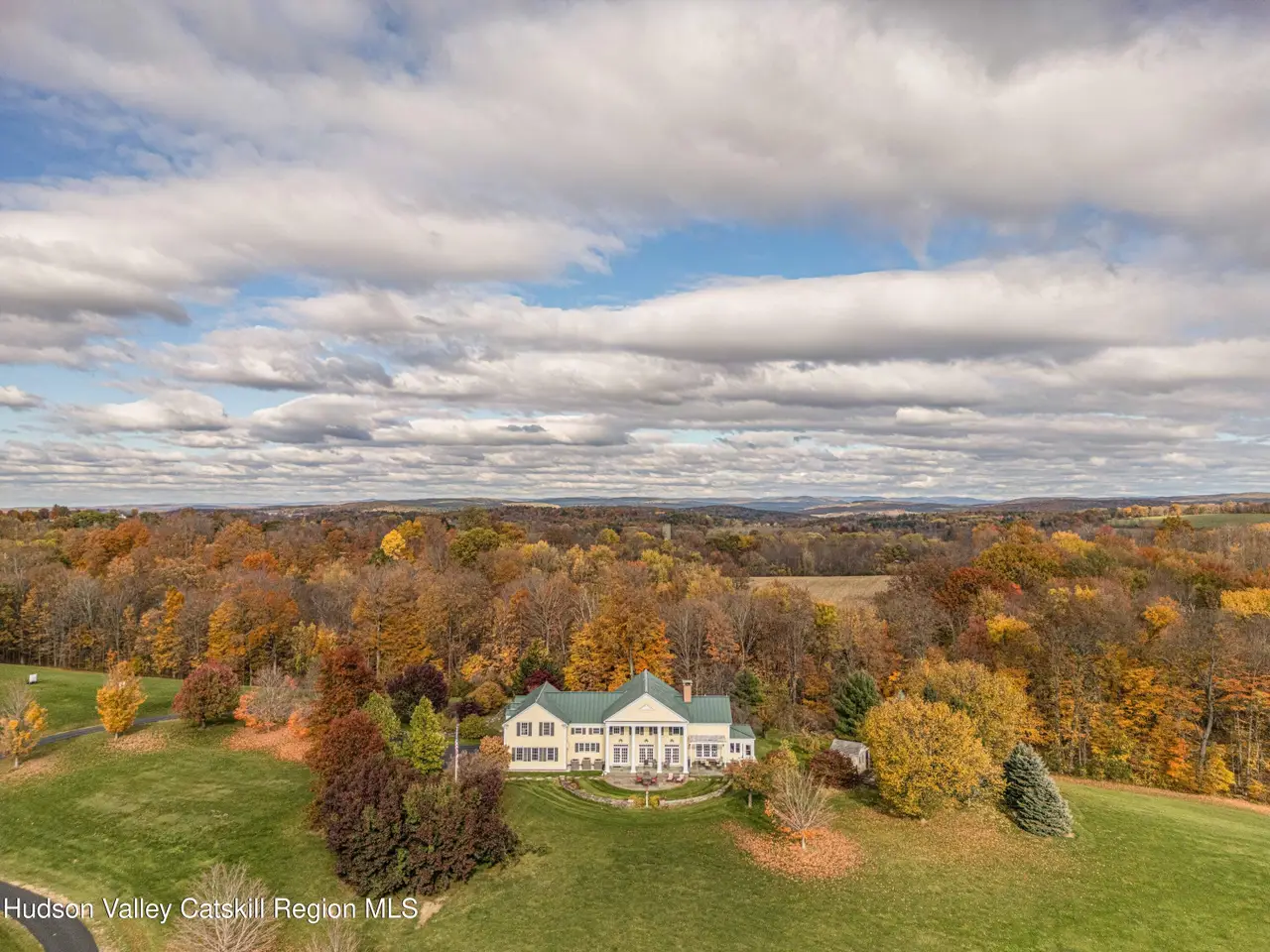 Welcome to Notre Colline Estate, a private country compound set on more than 56 acres of rolling meadows, gardens, ponds, and Catskill Mountain views. French for ''Our Hill,'' Notre Colline has an easy sense of belonging to its landscape. A long-paved drive leads to this elegantly designed 5,760 square-foot home, inspired by classic Greek Revival architecture. Built in 2005 for comfort, entertaining, and longevity, it features a standing-seam metal roof, radiant heated floors, energy-efficient heat pumps, and a fully integrated smart home system that manages lighting, temperature, security, video, and sound. The main level opens to bright, connected gathering spaces centered around a modern chef's kitchen with a large custom island, a counter depth paneled fridge, and professional-grade appliances. French doors from the dining area and breakfast nook open to a wide stone patio with an outdoor kitchen framed by landscaped gardens and open lawns, creating an easy indoor-outdoor flow. A paneled cherry wood office with built-in cabinetry and a wood-burning stove offers a quiet workspace beside a three-season sunroom, and a spacious living room with a gas fireplace invites relaxed evenings with friends and family. Upstairs, the grand primary suite feels like a private retreat, complete with a gas fireplace, two walk-in closets and a luxurious bath with a soaking tub and steam shower. Three additional bedrooms, a guest living room, two full bathrooms and a laundry room complete the second floor. The finished lower level adds generous additional living space with a recreation room, billiards area, kitchenette, sauna and full bath, ideal for guests or wellness use. An attached three-car heated garage features a porcelain tile floor and plenty of space for storage. Outdoors, a peaceful aerated pond lies at the center of the property, crossed by a charming footbridge and bordered by open lawns and walking paths. The grounds also include raised-bed gardens with irrigation, a potting shed, and a newly constructed insulated 26x34 foot outbuilding with water, electric, and space for six or more vehicles. Every detail has been considered for efficiency and ease, from spray-foam insulation and upgraded hydronic systems to improved drainage and a generator. Located minutes from Chatham village, Notre Colline Estate offers refined country living in beautiful Columbia County.