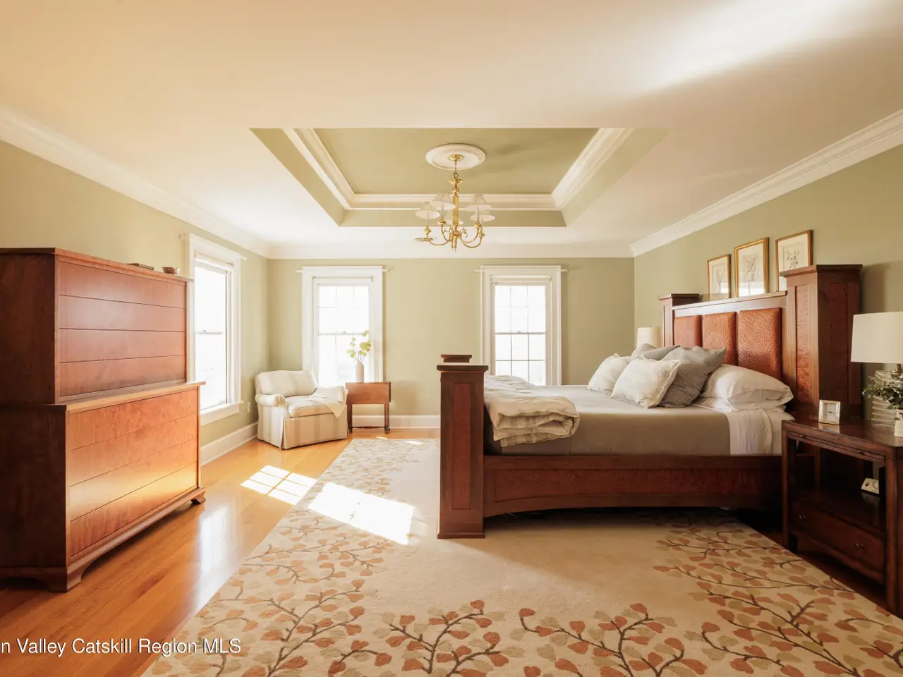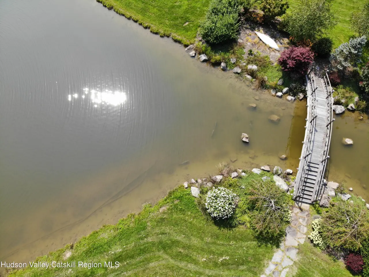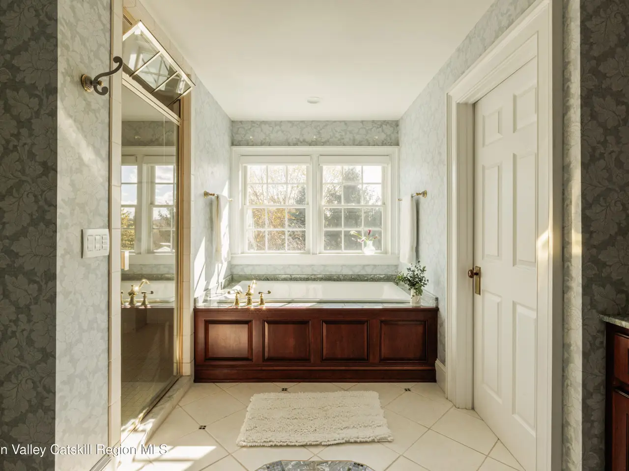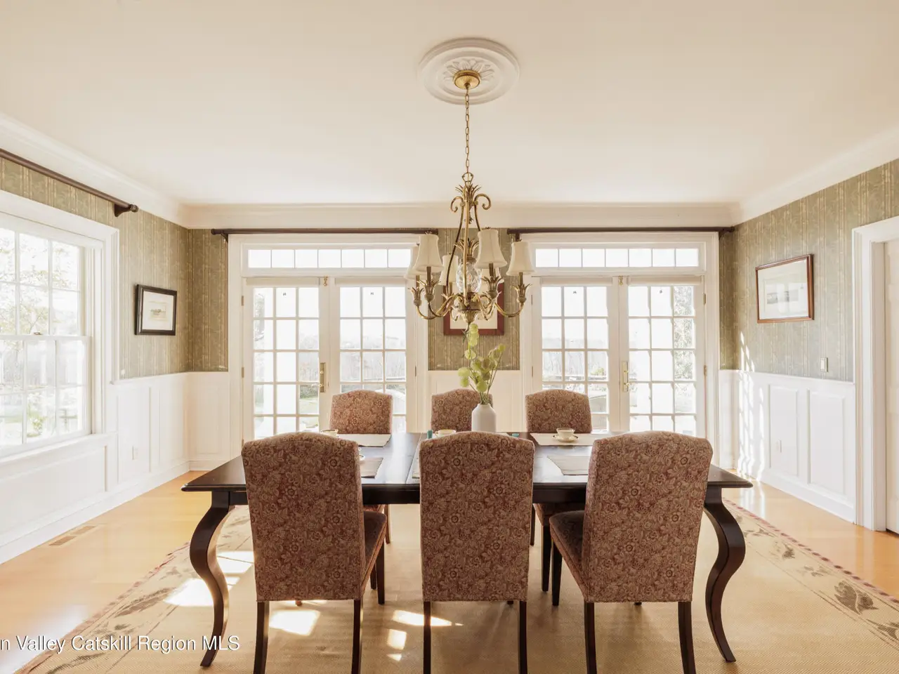 Welcome to Notre Colline Estate, a private country compound set on more than 56 acres of rolling meadows, gardens, ponds, and Catskill Mountain views. French for ''Our Hill,'' Notre Colline has an easy sense of belonging to its landscape. A long-paved drive leads to this elegantly designed 5,760 square-foot home, inspired by classic Greek Revival architecture. Built in 2005 for comfort, entertaining, and longevity, it features a standing-seam metal roof, radiant heated floors, energy-efficient heat pumps, and a fully integrated smart home system that manages lighting, temperature, security, video, and sound. The main level opens to bright, connected gathering spaces centered around a modern chef's kitchen with a large custom island, a counter depth paneled fridge, and professional-grade appliances. French doors from the dining area and breakfast nook open to a wide stone patio with an outdoor kitchen framed by landscaped gardens and open lawns, creating an easy indoor-outdoor flow. A paneled cherry wood office with built-in cabinetry and a wood-burning stove offers a quiet workspace beside a three-season sunroom, and a spacious living room with a gas fireplace invites relaxed evenings with friends and family. Upstairs, the grand primary suite feels like a private retreat, complete with a gas fireplace, two walk-in closets and a luxurious bath with a soaking tub and steam shower. Three additional bedrooms, a guest living room, two full bathrooms and a laundry room complete the second floor. The finished lower level adds generous additional living space with a recreation room, billiards area, kitchenette, sauna and full bath, ideal for guests or wellness use. An attached three-car heated garage features a porcelain tile floor and plenty of space for storage. Outdoors, a peaceful aerated pond lies at the center of the property, crossed by a charming footbridge and bordered by open lawns and walking paths. The grounds also include raised-bed gardens with irrigation, a potting shed, and a newly constructed insulated 26x34 foot outbuilding with water, electric, and space for six or more vehicles. Every detail has been considered for efficiency and ease, from spray-foam insulation and upgraded hydronic systems to improved drainage and a generator. Located minutes from Chatham village, Notre Colline Estate offers refined country living in beautiful Columbia County.