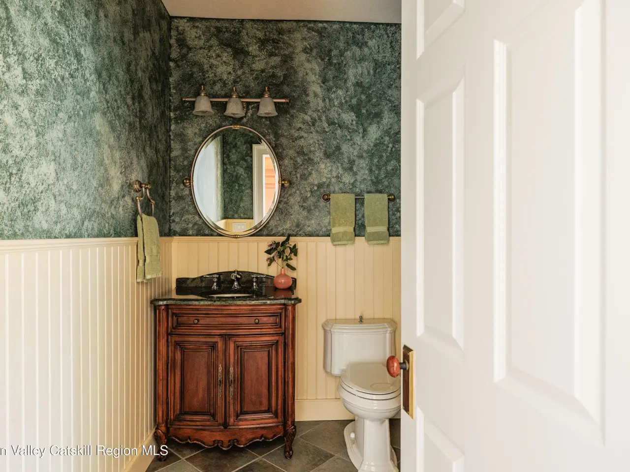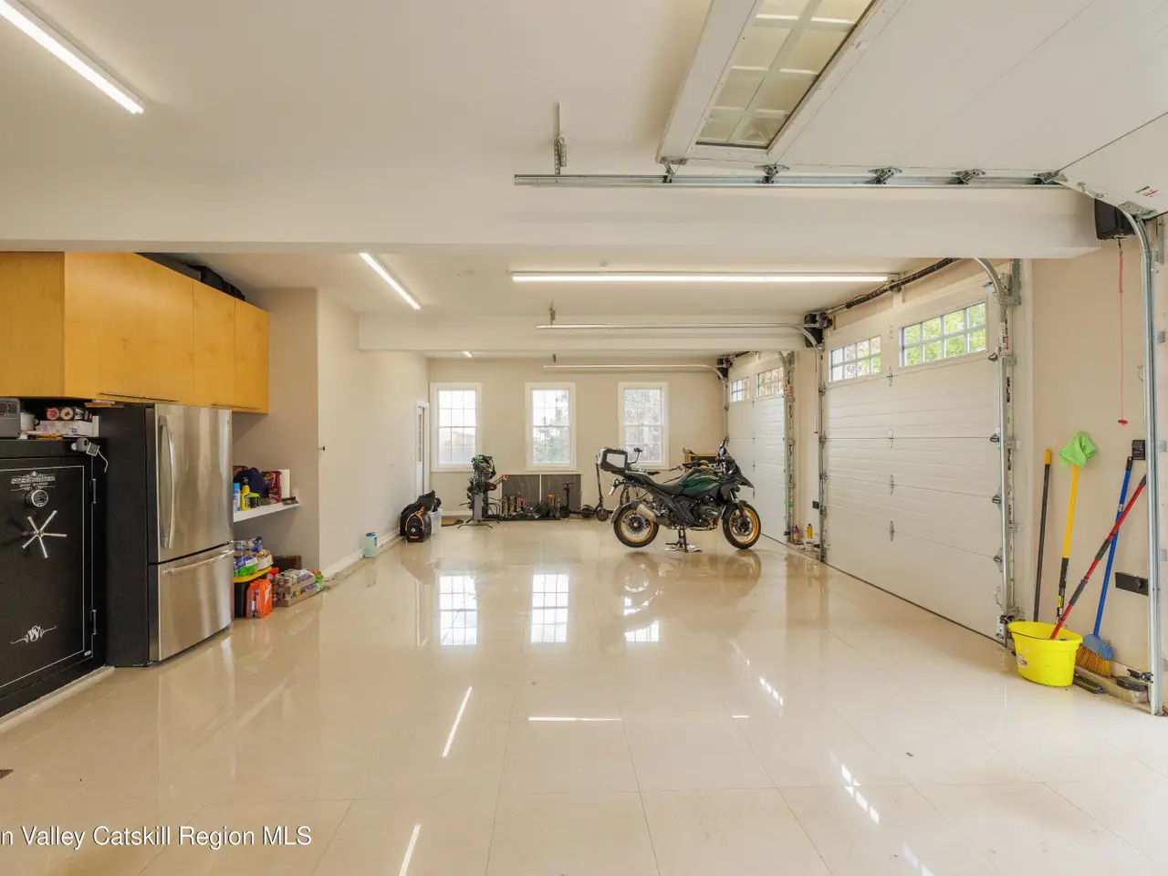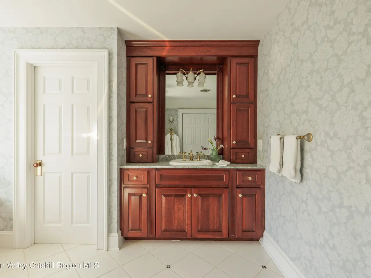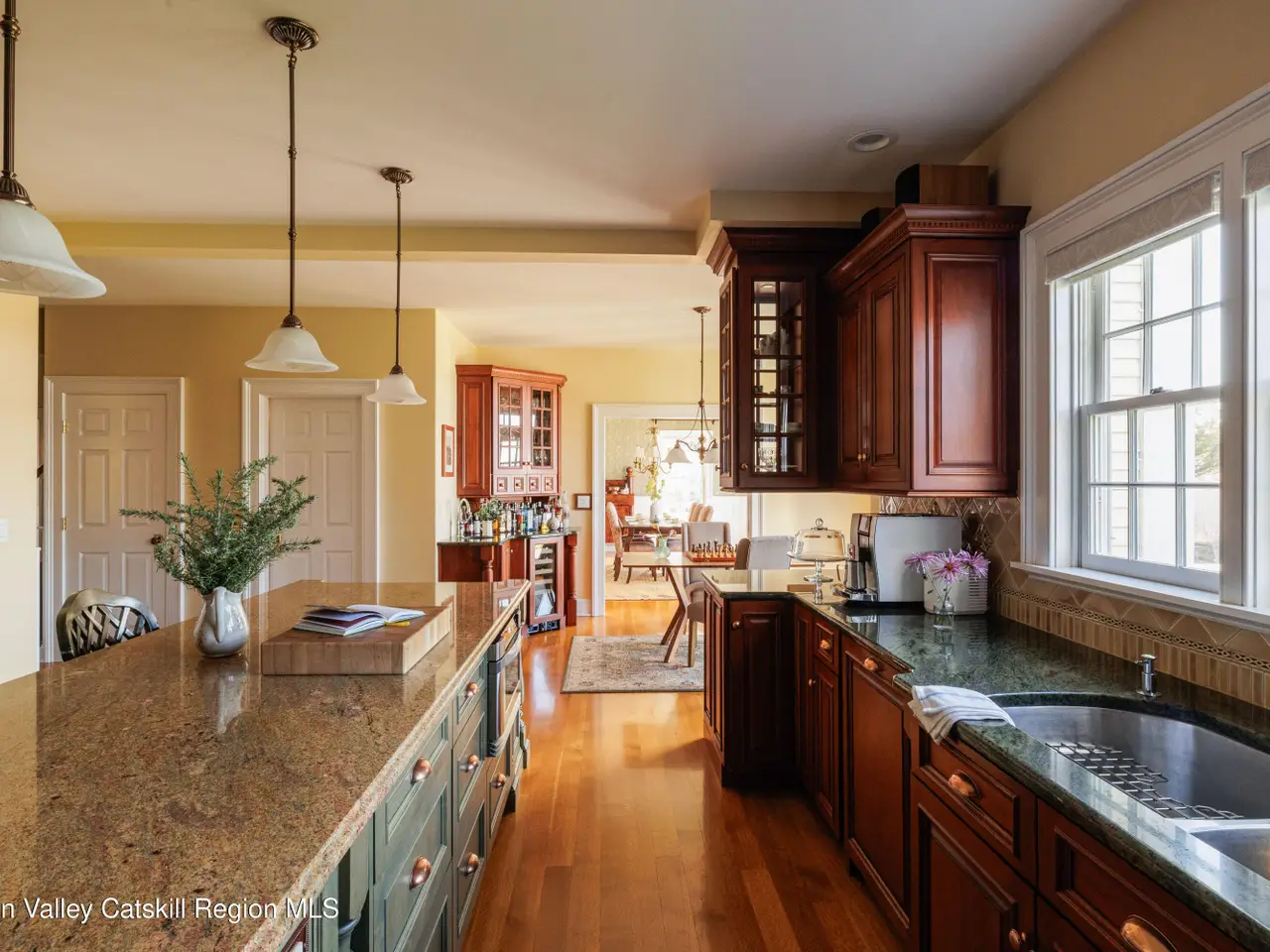 Welcome to Notre Colline Estate, a private country compound set on more than 56 acres of rolling meadows, gardens, ponds, and Catskill Mountain views. French for ''Our Hill,'' Notre Colline has an easy sense of belonging to its landscape. A long-paved drive leads to this elegantly designed 5,760 square-foot home, inspired by classic Greek Revival architecture. Built in 2005 for comfort, entertaining, and longevity, it features a standing-seam metal roof, radiant heated floors, energy-efficient heat pumps, and a fully integrated smart home system that manages lighting, temperature, security, video, and sound. The main level opens to bright, connected gathering spaces centered around a modern chef's kitchen with a large custom island, a counter depth paneled fridge, and professional-grade appliances. French doors from the dining area and breakfast nook open to a wide stone patio with an outdoor kitchen framed by landscaped gardens and open lawns, creating an easy indoor-outdoor flow. A paneled cherry wood office with built-in cabinetry and a wood-burning stove offers a quiet workspace beside a three-season sunroom, and a spacious living room with a gas fireplace invites relaxed evenings with friends and family. Upstairs, the grand primary suite feels like a private retreat, complete with a gas fireplace, two walk-in closets and a luxurious bath with a soaking tub and steam shower. Three additional bedrooms, a guest living room, two full bathrooms and a laundry room complete the second floor. The finished lower level adds generous additional living space with a recreation room, billiards area, kitchenette, sauna and full bath, ideal for guests or wellness use. An attached three-car heated garage features a porcelain tile floor and plenty of space for storage. Outdoors, a peaceful aerated pond lies at the center of the property, crossed by a charming footbridge and bordered by open lawns and walking paths. The grounds also include raised-bed gardens with irrigation, a potting shed, and a newly constructed insulated 26x34 foot outbuilding with water, electric, and space for six or more vehicles. Every detail has been considered for efficiency and ease, from spray-foam insulation and upgraded hydronic systems to improved drainage and a generator. Located minutes from Chatham village, Notre Colline Estate offers refined country living in beautiful Columbia County.
