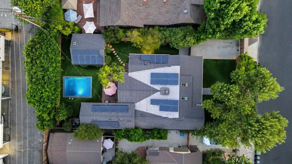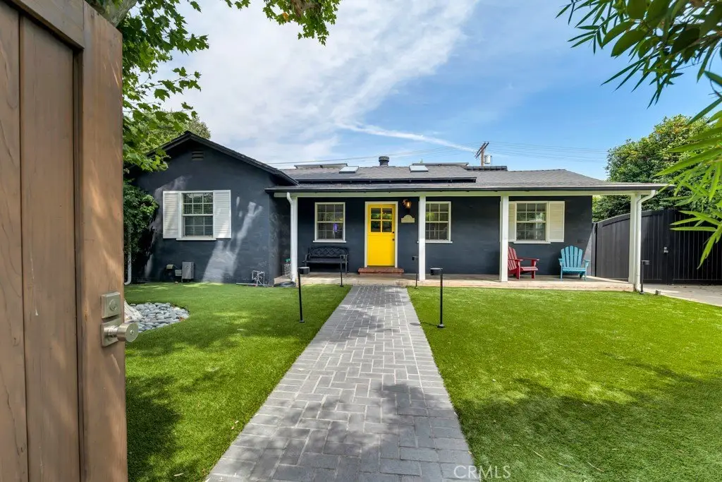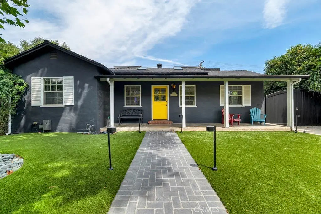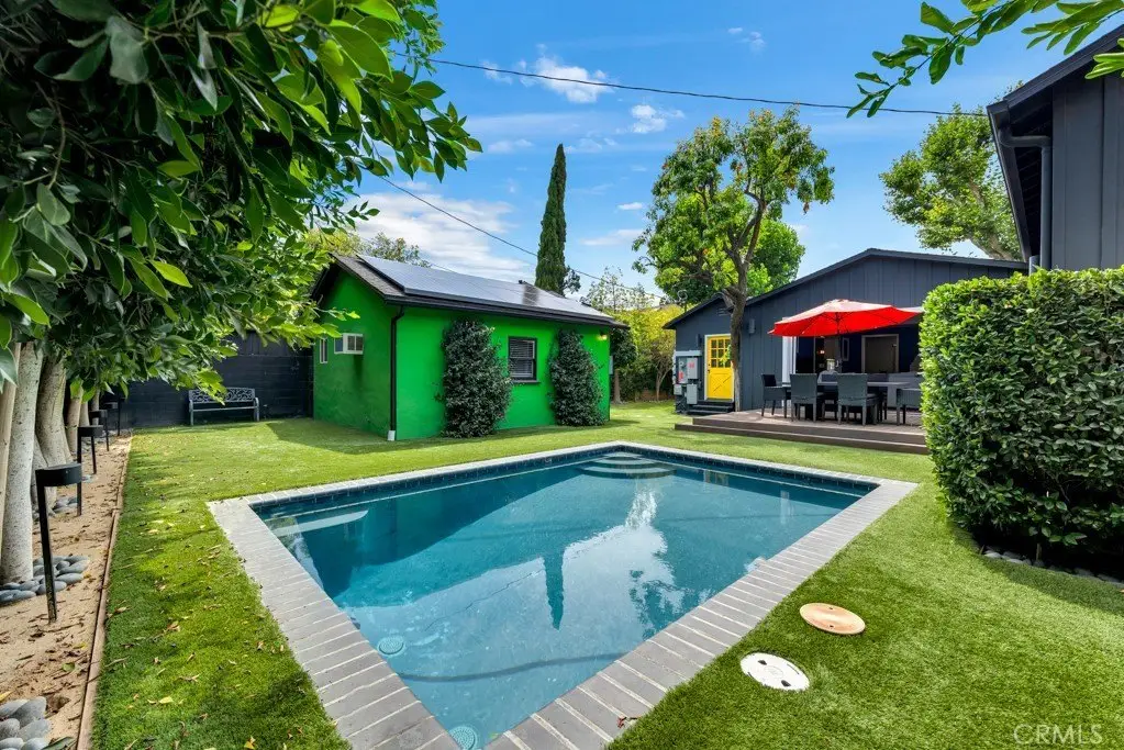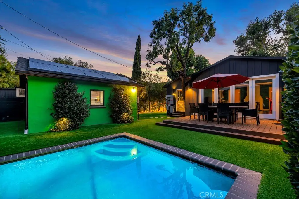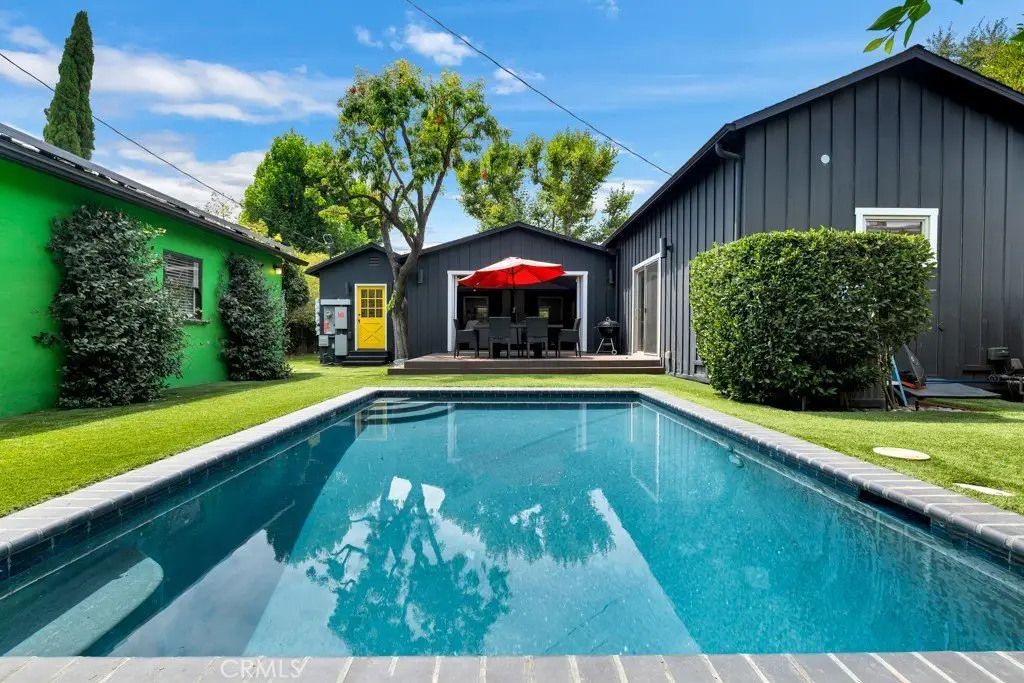 This stunningly renovated and expanded three bedroom, two bathroom home is a true masterpiece! With its soaring vaulted ceilings and open, airy layout, this residence showcases top-notch finishes and exceptional indoor/outdoor living. A charming Dutch door welcomes you into the cozy formal living room, featuring a sophisticated stone fireplace as its centerpiece. The seamless flow of the open-concept design leads you effortlessly into the dining area, which is beautifully highlighted by a striking architectural light fixture. The contemporary kitchen is a chef's dream, complete with custom cabinetry, quartz countertops, a Wolf range, and high-end stainless steel appliances. The newly designed master suite is a luxurious retreat, featuring a spacious walk-through closet and an ensuite bathroom adorned with premium finishes such as Waterworks tile, bespoke cabinetry, and elegant European fixtures. The airy great room is accentuated by large modern bi-fold doors that open up completely to reveal a brand-new deck and an exquisitely landscaped backyard. The outdoor space boasts a heated saltwater pool and a Studio ADU equipped with its own full kitchen. Additionally, the property is outfitted with fully paid-off Tesla solar panels and two Tesla batteries, enhancing its energy efficiency. This incredible opportunity is not to be missed!