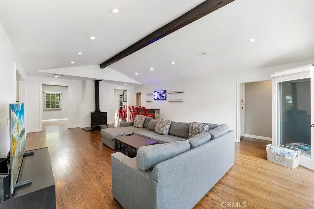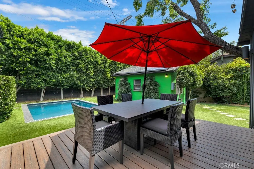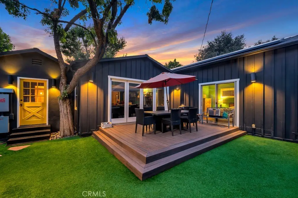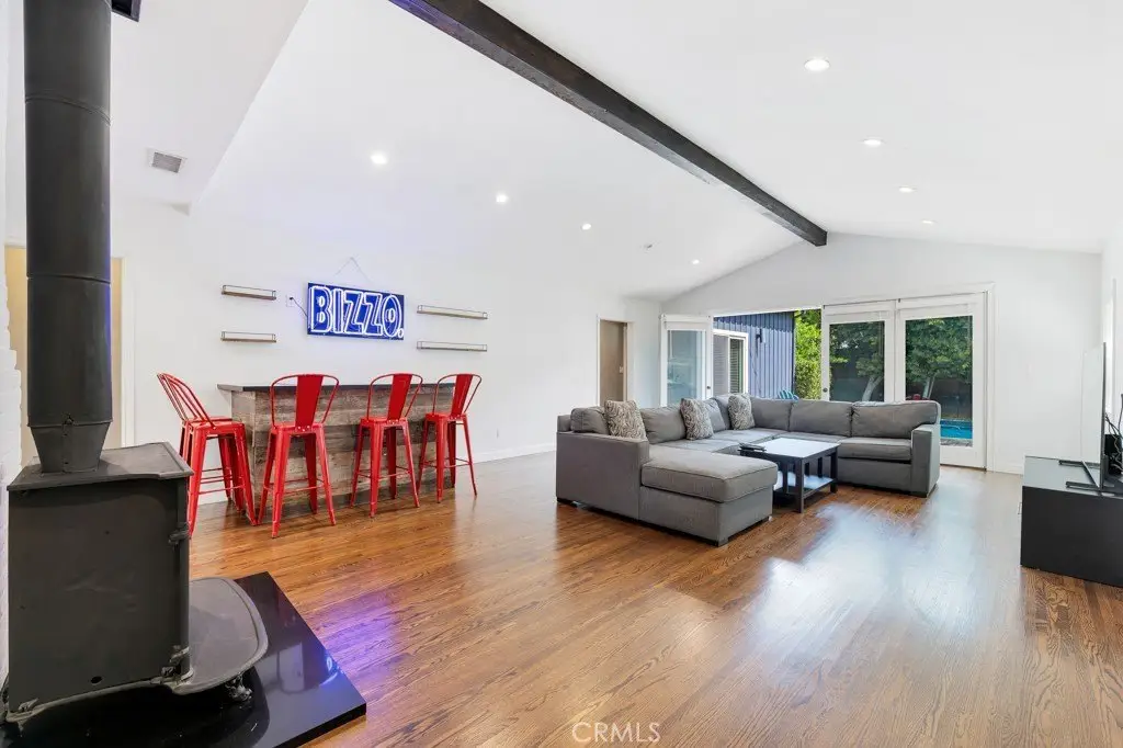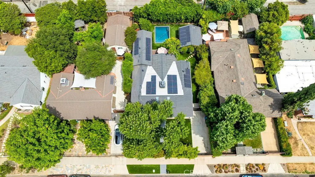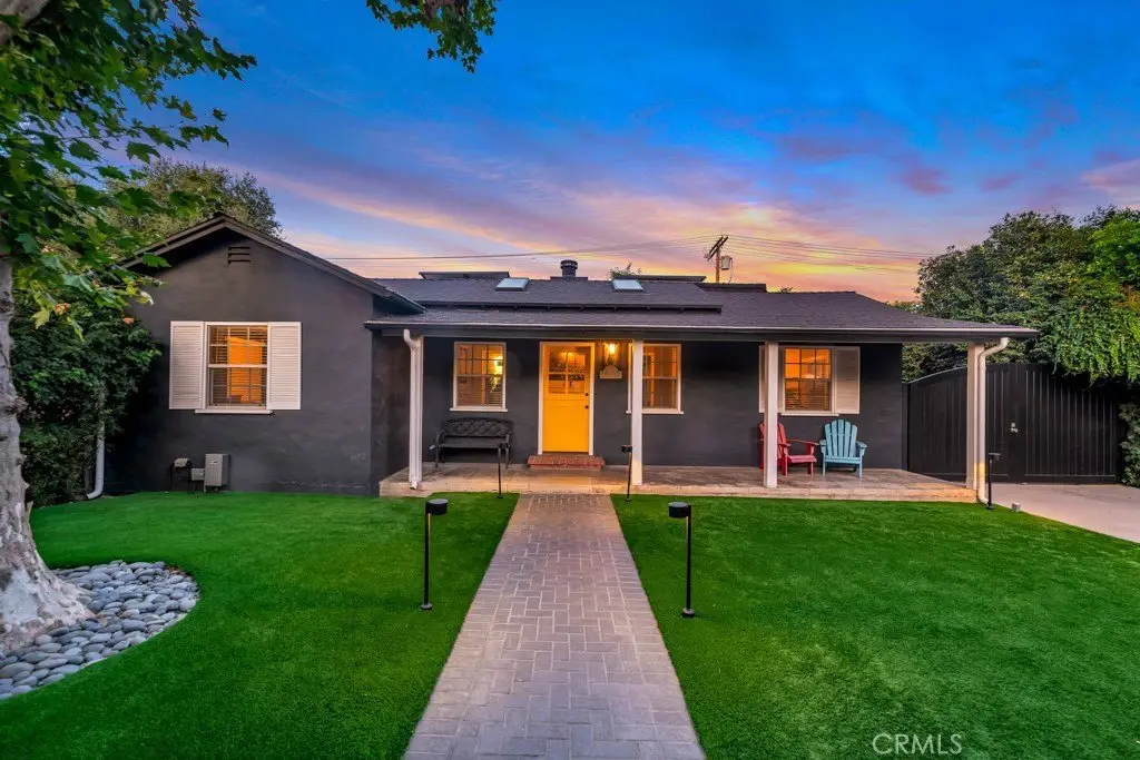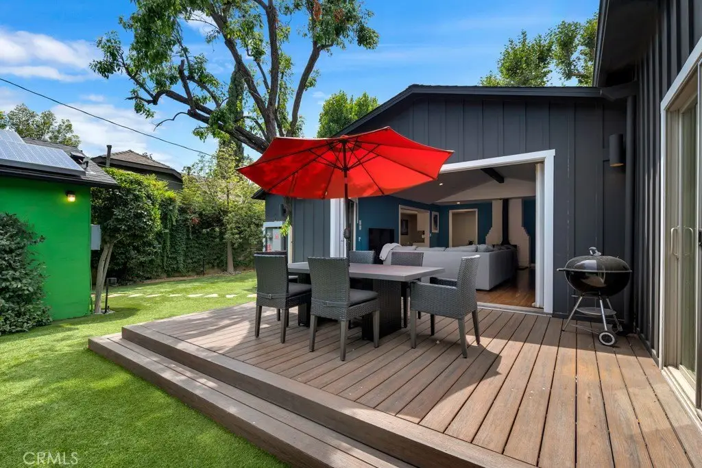 This stunningly renovated and expanded three bedroom, two bathroom home is a true masterpiece! With its soaring vaulted ceilings and open, airy layout, this residence showcases top-notch finishes and exceptional indoor/outdoor living. A charming Dutch door welcomes you into the cozy formal living room, featuring a sophisticated stone fireplace as its centerpiece. The seamless flow of the open-concept design leads you effortlessly into the dining area, which is beautifully highlighted by a striking architectural light fixture. The contemporary kitchen is a chef's dream, complete with custom cabinetry, quartz countertops, a Wolf range, and high-end stainless steel appliances. The newly designed master suite is a luxurious retreat, featuring a spacious walk-through closet and an ensuite bathroom adorned with premium finishes such as Waterworks tile, bespoke cabinetry, and elegant European fixtures. The airy great room is accentuated by large modern bi-fold doors that open up completely to reveal a brand-new deck and an exquisitely landscaped backyard. The outdoor space boasts a heated saltwater pool and a Studio ADU equipped with its own full kitchen. Additionally, the property is outfitted with fully paid-off Tesla solar panels and two Tesla batteries, enhancing its energy efficiency. This incredible opportunity is not to be missed!