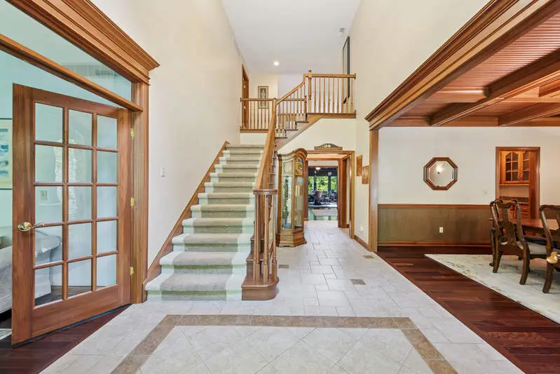 Discover this stunning one-owner home located in the prestigious Whitethorne Woods gated neighborhood. Nestled on a private, wooded cul-de-sac lot, this exceptional property offers over 8,000 square feet of luxury living space. The main floor features a spacious primary suite complete with his and hers walk-in closets, dual vanities, and a beautifully updated en-suite bath with a classic clawfoot tub, heated floors and heated towel racks. The heart of the home is a well-appointed eat-in kitchen, with two dishwashers, perfect for casual dining and entertaining. Designed with both comfort and functionality in mind, the home includes 5 bedrooms--each with its own en-suite bathroom--6 total baths, 2 fireplaces, and a finished basement featuring a workout room, dog wash station, custom pull-out shelving for easy storage, and an office that can be converted into a sixth bedroom. Outdoor living is made easy with a screened-in porch off the family room as well as access of the master suite and deck. Outside across a beautiful stone bridge is a fully screened in gazebo equipped with an electric lift, offering peaceful views and year-round enjoyment. Additional features include a 3-car garage, whole-house generator, double septic tanks, and a 3-year-old roof. Meticulously maintained and thoughtfully designed, this luxury home offers space, privacy, and elegance in one of the area's most sought-after communities.