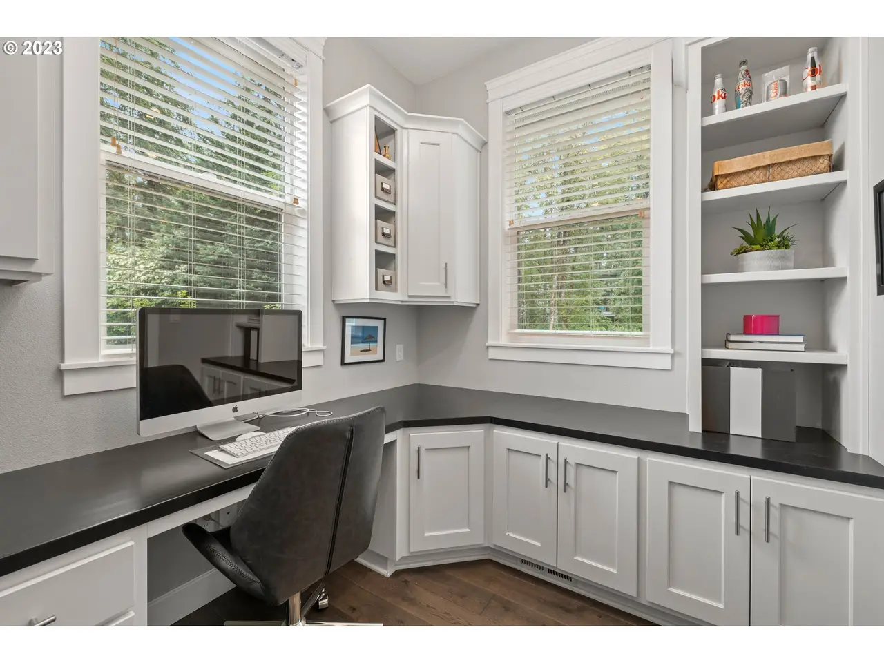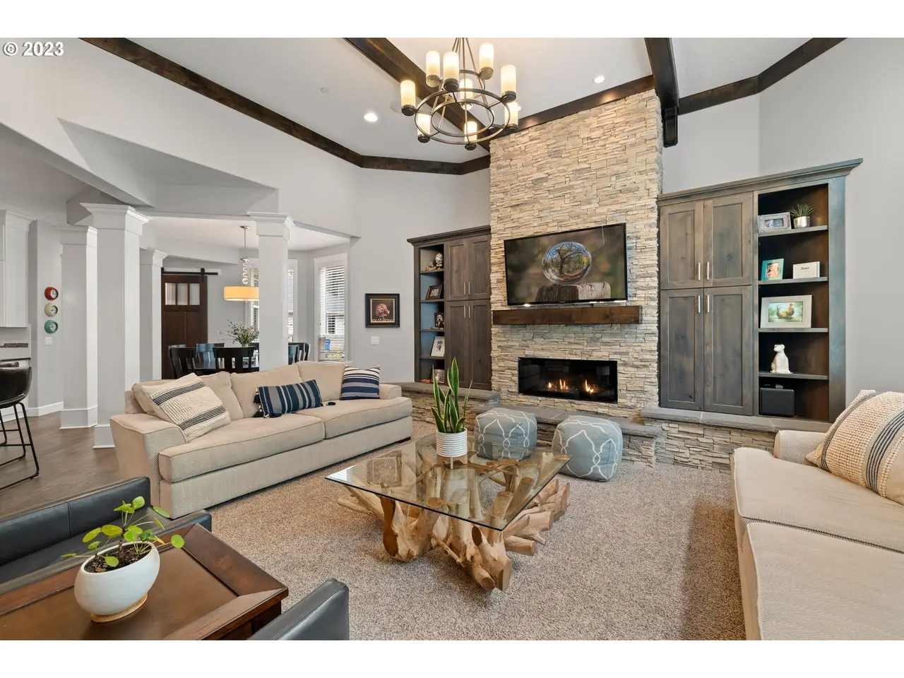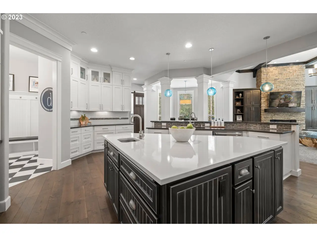 Close-in acreage on over one and a half acres. With five bedrooms, four full baths and two half baths, there is ample space for family and guests. The home spans 5,780 square feet and features a thoughtfully designed layout. No HOA or CCRs. The heart of the home, which has created many memories, is the gourmet kitchen, which is perfect for cooking enthusiasts. It boasts an oversized island with a prep sink, allowing for convenient meal preparation. The kitchen also includes a six-burner industrial range with a double oven and pot filler. A huge walk-in pantry provides plenty of storage space. The main level of the house features two offices, providing at-home work environments. Additionally, there is a designated exercise room allowing you to stay fit within the comfort of your own home. Convenience is key in this residence, with a mudroom including added storage. The laundry room is equipped with built-in features, a sewing nook and a sink area, making laundry tasks more efficient. The primary bedroom, situated on the main level, offers a retreat-like experience. It features a sitting area, allowing you to relax and unwind. The en-suite bathroom is a luxurious haven with double shower heads, providing a spa-like experience. The custom walk-in closet is a dream come true. The backyard of this home is truly an oasis. A covered patio and eating area provide the perfect setting for outdoor gatherings. You can relax and rejuvenate in the hot tub area or cozy up by the custom outdoor fireplace. For those who enjoy cooking outdoors, there is even an outdoor pizza oven. The yard is adorned with mature landscaping, and a water feature cascading into a pond. Also features a seasonal creek. Lastly, this property consists of a three-car attached garage and a three-car detached garage/shop with added RV parking. Shop is also big enough for your boat and added toys. Overall, this home offers a blend of luxury, functionality and outdoor beauty, providing an exceptional living experience.