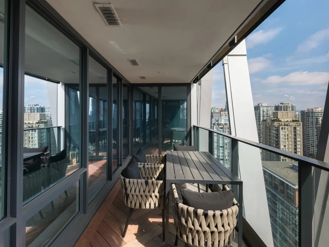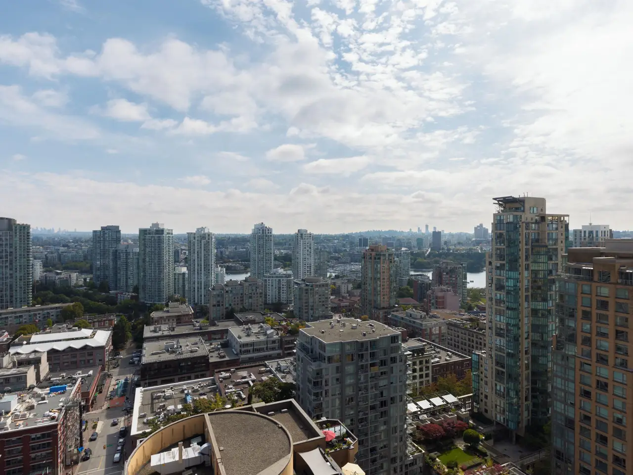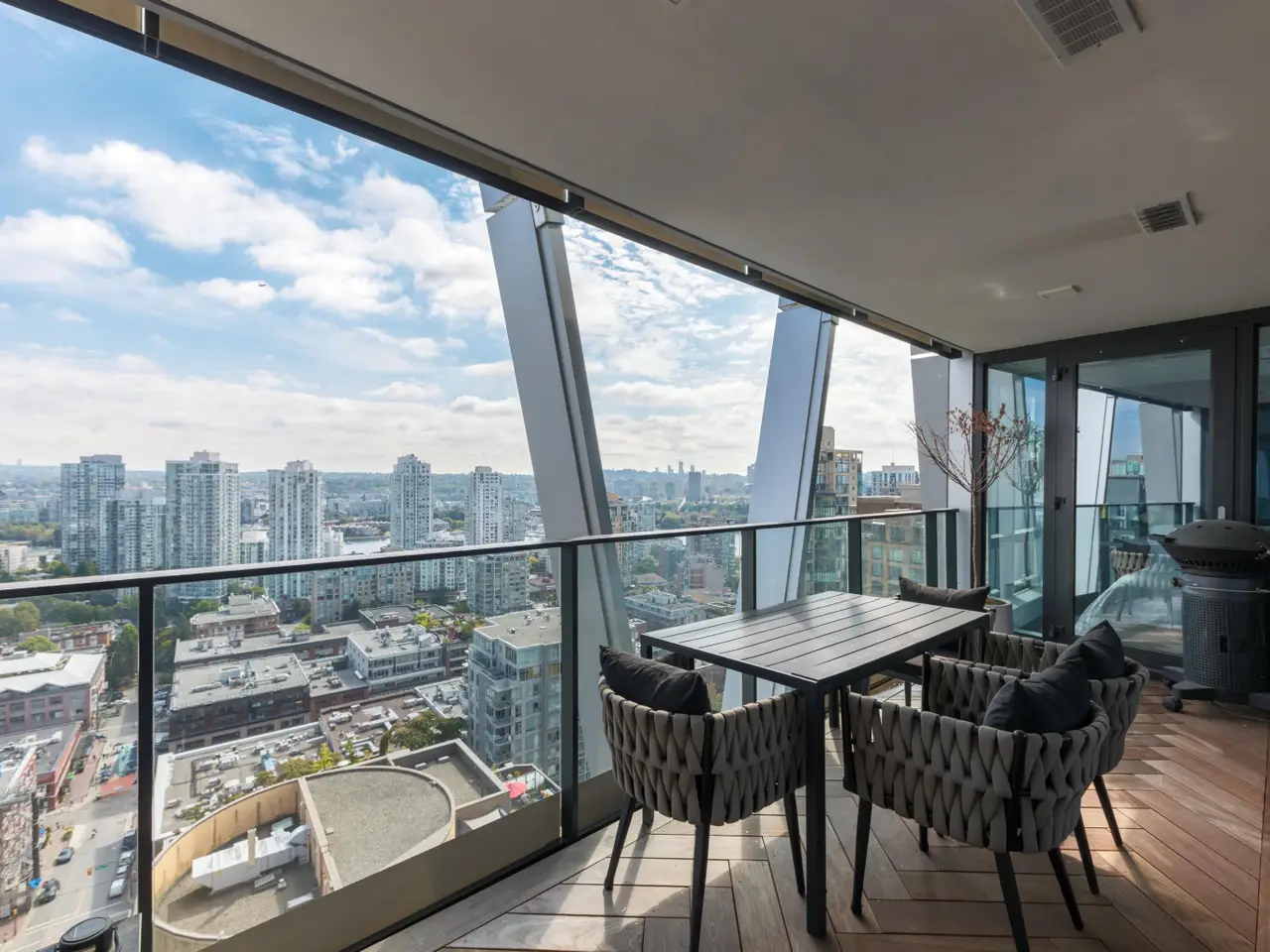 Elevated & updated corner home at 8X on the Park with panoramic views of False Creek, city, and mountains. This refined 3 bed, 2 bath residence features a 10ft natural stone island, integrated Miele appliances, custom millwork, powered blinds, and floor-to-ceiling windows. The open plan flows to an oversized covered patio with herringbone wood decking. Elegant bedrooms, a reimagined walk-in closet, engineered hardwood, natural tile, & A/C throughout complete the home. Includes 2 side-by-side parking, storage, and bike locker. Enjoy world-class amenities: concierge, fitness centre, and rooftop oasis. A rare, turnkey offering in one of Vancouver's premier buildings.