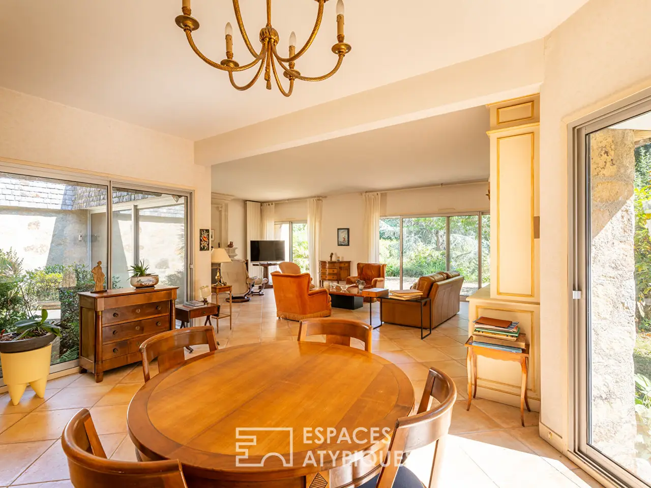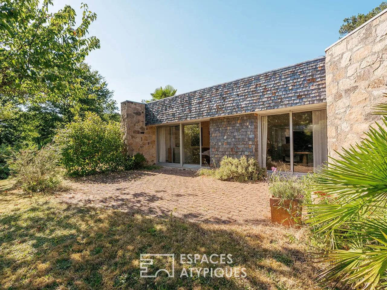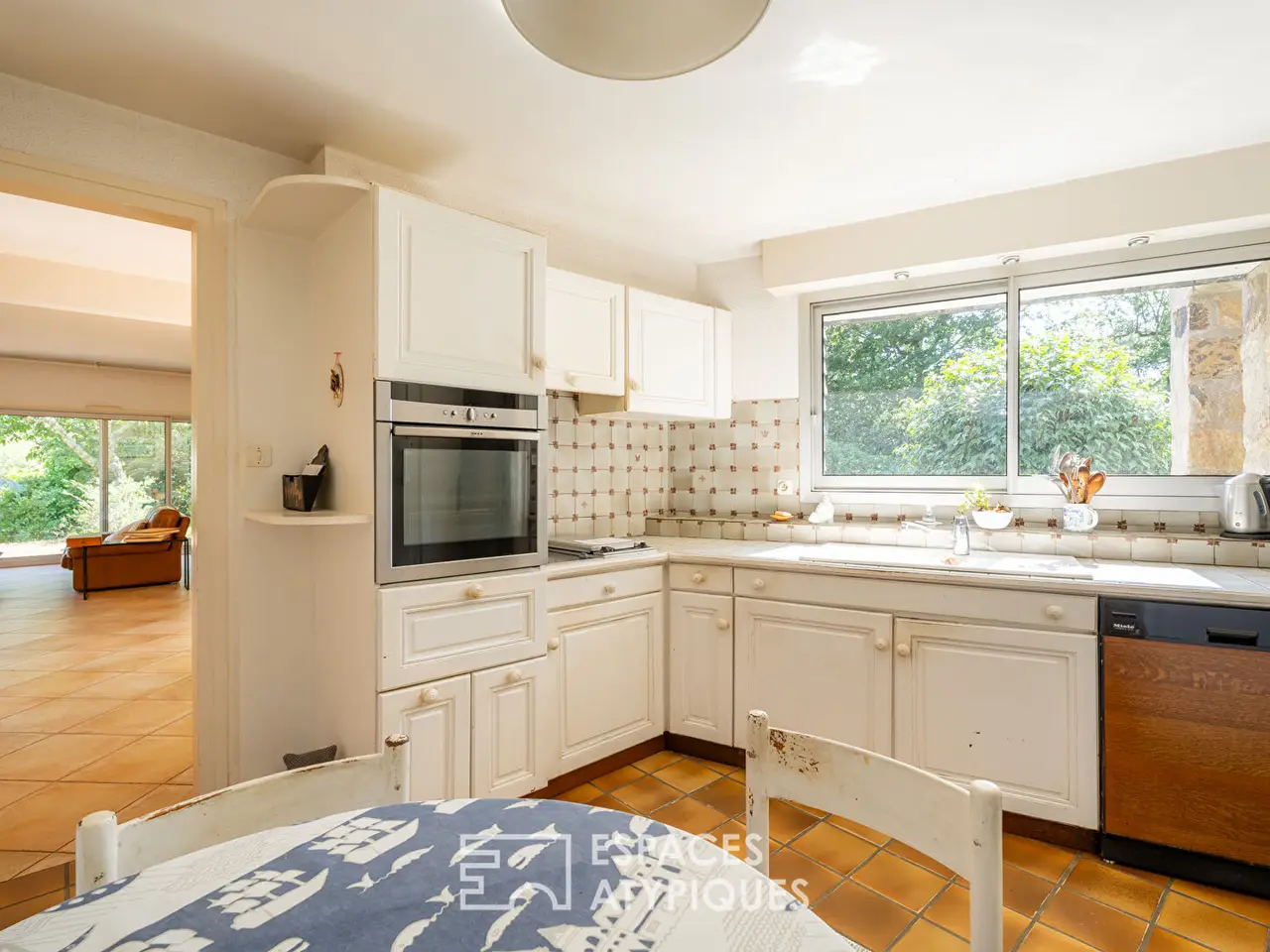 Located in Vannes, in the absolute calm of a private cul-de-sac, this single-story architect-designed house, designed by Yves Guillou, offers approximately 183 sqm of living space on a landscaped plot of over 6,000 sqm. Built in 1978, this property stands out for its harmonious integration into a privileged natural environment, on the edge of a river. Its architectural signature and clean lines give the whole a unique character. The whole is completed by a verdant garden, conducive to contemplation. Upon entering, the eye is drawn to a central planted patio, the true heart of the house around which the various living spaces are organized. The spacious and bright living room opens through large bay windows onto the wooded park. The fireplace structures the space while bringing warmth and conviviality. The separate, fully fitted and equipped kitchen is complemented by a dining area and naturally extends into a functional utility room providing access to the garage, a workshop, cellars, and a boiler room. On the sleeping side, the house offers an office, four bedrooms, two shower rooms, a bathroom, and three toilets, providing a fluid layout suited to family life. The carefully maintained landscaped park overlooks the river. Mature trees and a variety of species create a soothing and private atmosphere. This rare living environment, just minutes from downtown Vannes and the beaches of the Gulf of Morbihan, also benefits from the immediate proximity of schools, shops, and main roads. This house combines remarkable architecture, controlled volumes, and an exceptional environment. A unique property, at the crossroads of design and nature, designed for lovers of architecture and discreet elegance. ENERGY CLASS: E / CLIMATE CLASS: E Estimated average amount of annual energy expenditure for standard use, established from average energy prices indexed for the year 2021, 2022, 2023: between EUR4,400 and EUR6,010/year. Information on the risks to which this property is exposed is available on the Georisques website: www.georisques.gouv.fr Price including agency fees: EUR1,092,000 including 4% agency fees including tax payable by the purchaser. Contact: Anne-Cecile QUEMERAIS Telephone: 06 71 96 12 32 RSAC Vannes 834 522 773 RSACREF. 515EAMAdditional information* 6 rooms* 4 bedrooms* 2 bathrooms* 1 bathroom* Outdoor space : 6400 SQM* Property tax : 2 850 €Energy Performance CertificatePrimary energy consumptione : 193 kWh/m2.yearHigh performance housing*A*B*C*D*193kWh/m2.year57*kg CO2/m2.yearE*F*GExtremely poor housing performance* Of which greenhouse gas emissionse : 57 kg CO2/m2.yearLow CO2 emissions*A*B*C*D*57kg CO2/m2.yearE*F*GVery high CO2 emissionsEstimated average annual energy costs for standard use, indexed to specific years 2021, 2022, 2023 : between 4400 € and 6010 € Subscription IncludedAgency fees* Fees charged to the purchaser : 42 000 €MediatorMediation Franchise-Consommateurswww.mediation-franchise.com29 Boulevard de Courcelles 75008 ParisInformation on the risks to which this property is exposed is available on the Geohazards website : www.georisques.gouv.fr