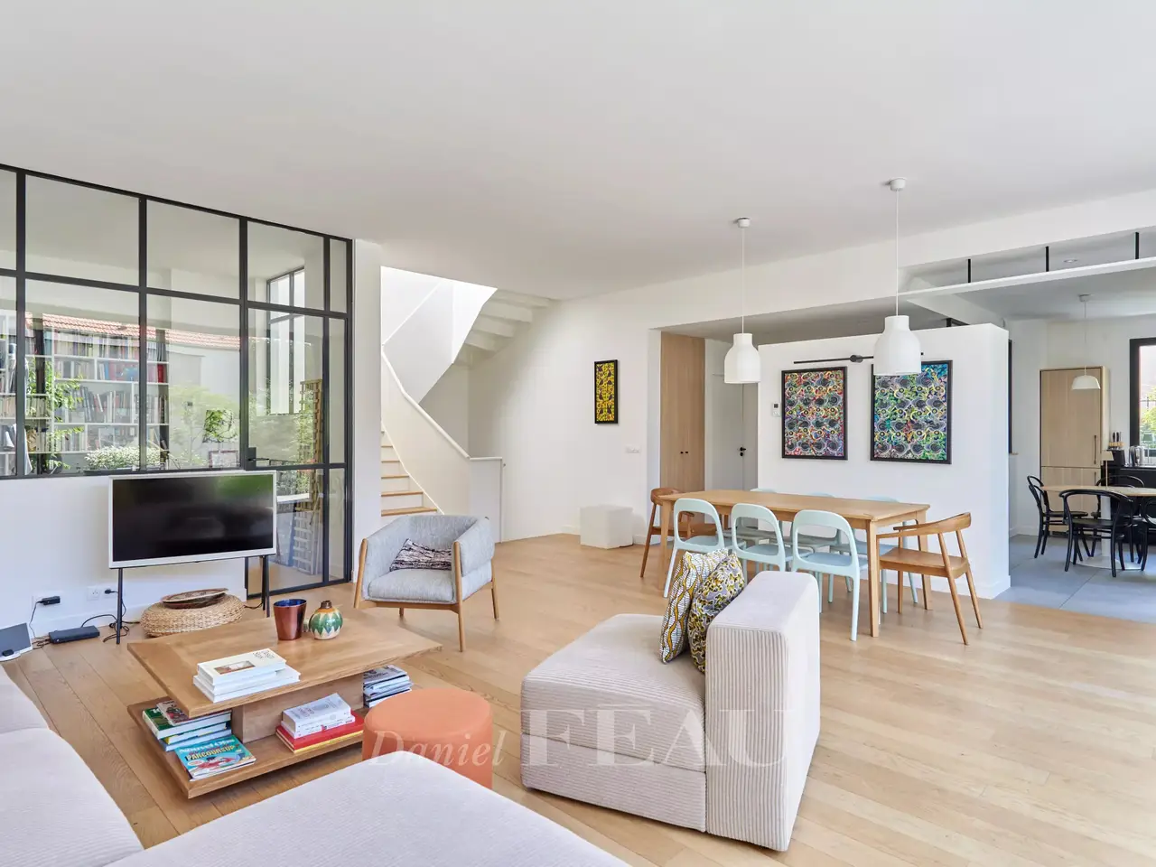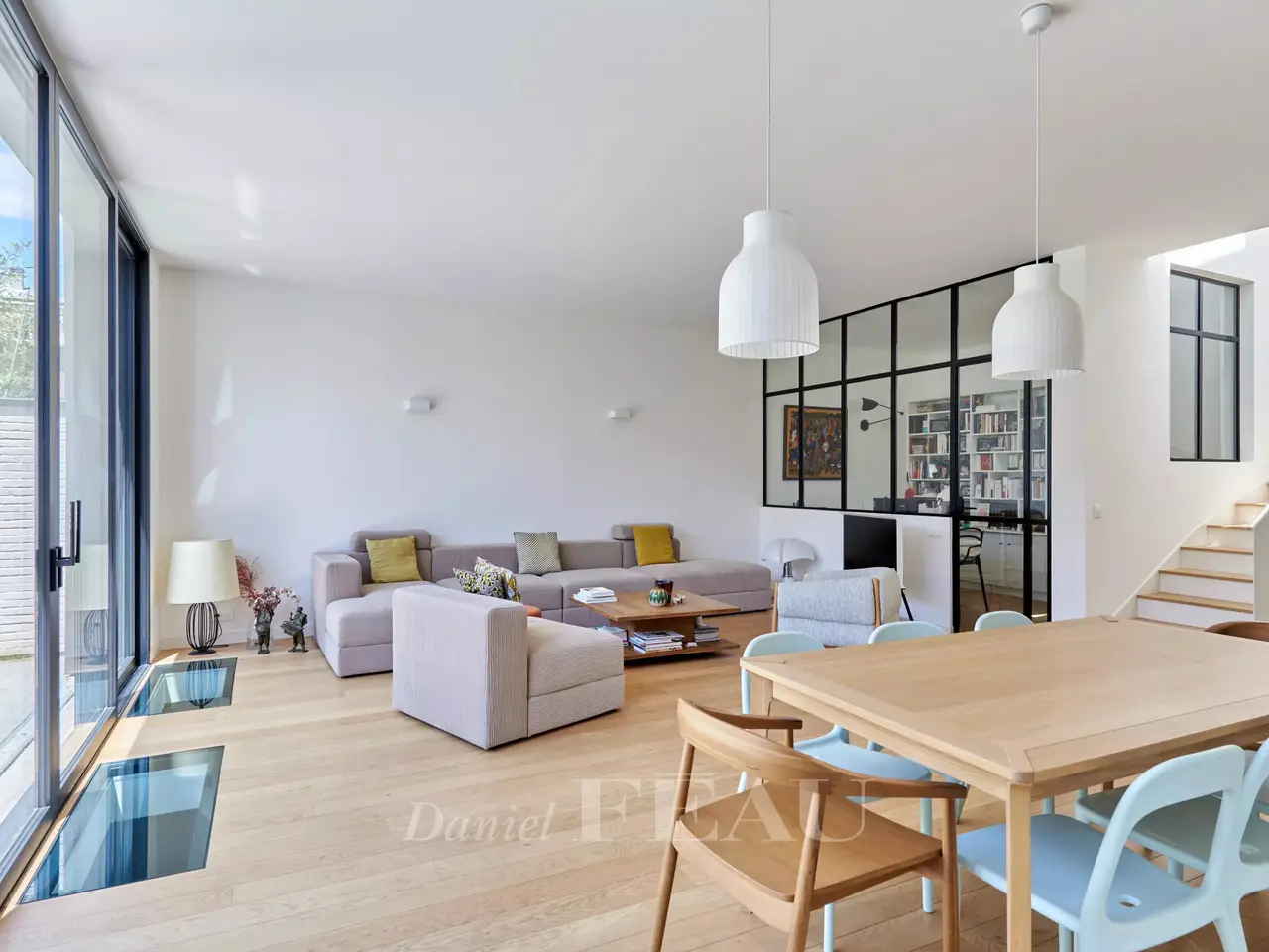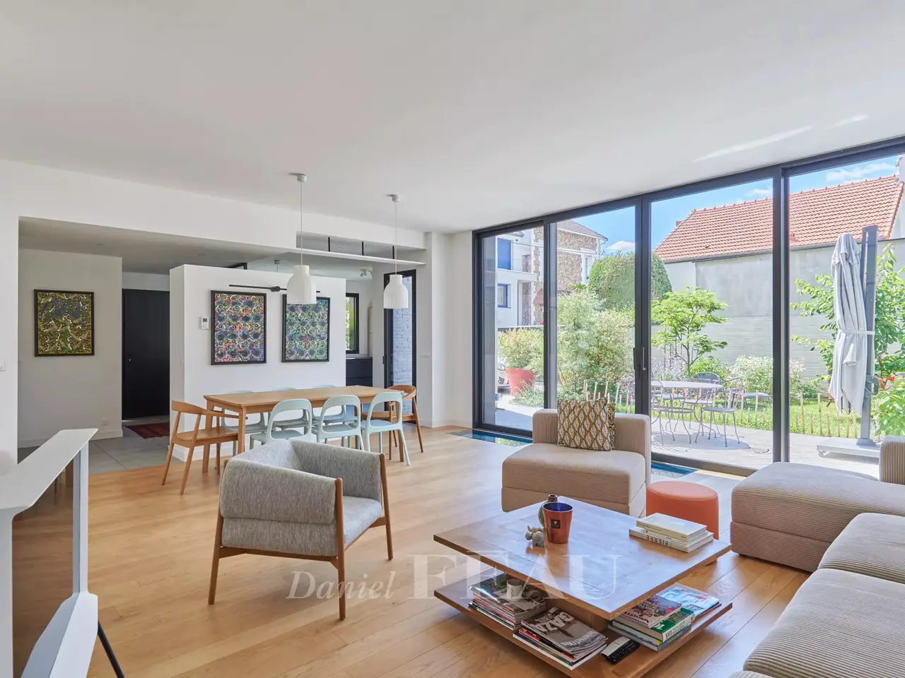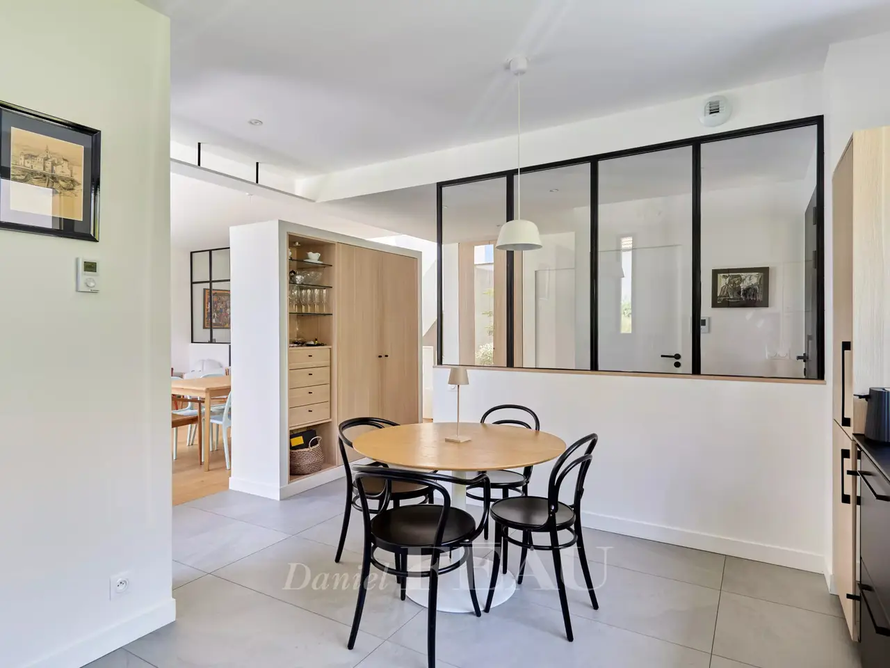 In a green bower, nearby Vanves train station, architect house dating from 2022, offering 284 sqm of living space and a garden-terrace space of 62 m². On ground floor, the entry leads to a separate and equipped kitchen, a spacious living room opening onto the garden, a suite and its shower room, a study and a separate wc ; on the upper floor, four bedrooms, three shower rooms and a separate wc on the landing. In the basement, a utility room, a living room, a fitness room, a pantry and a technical space.