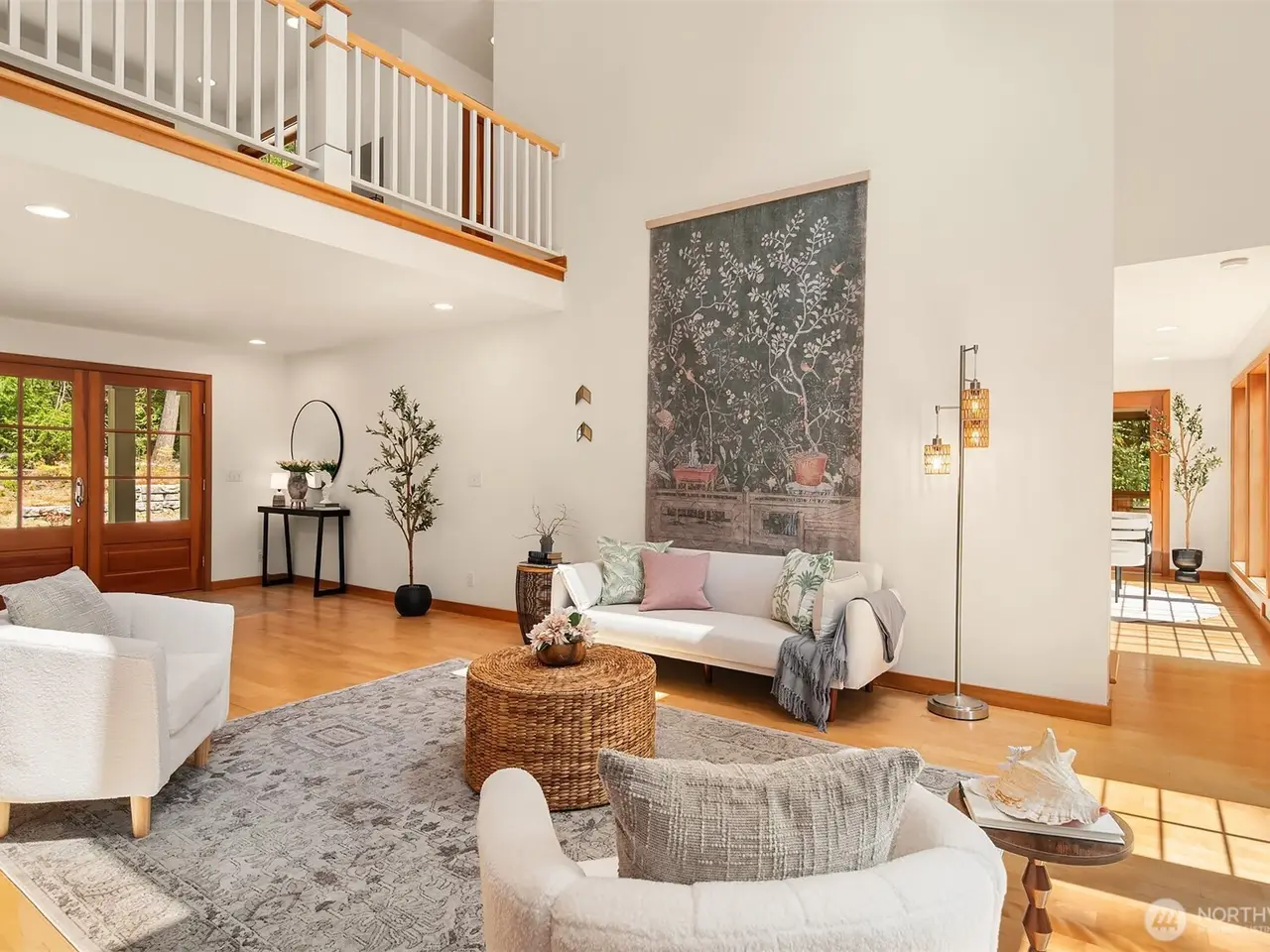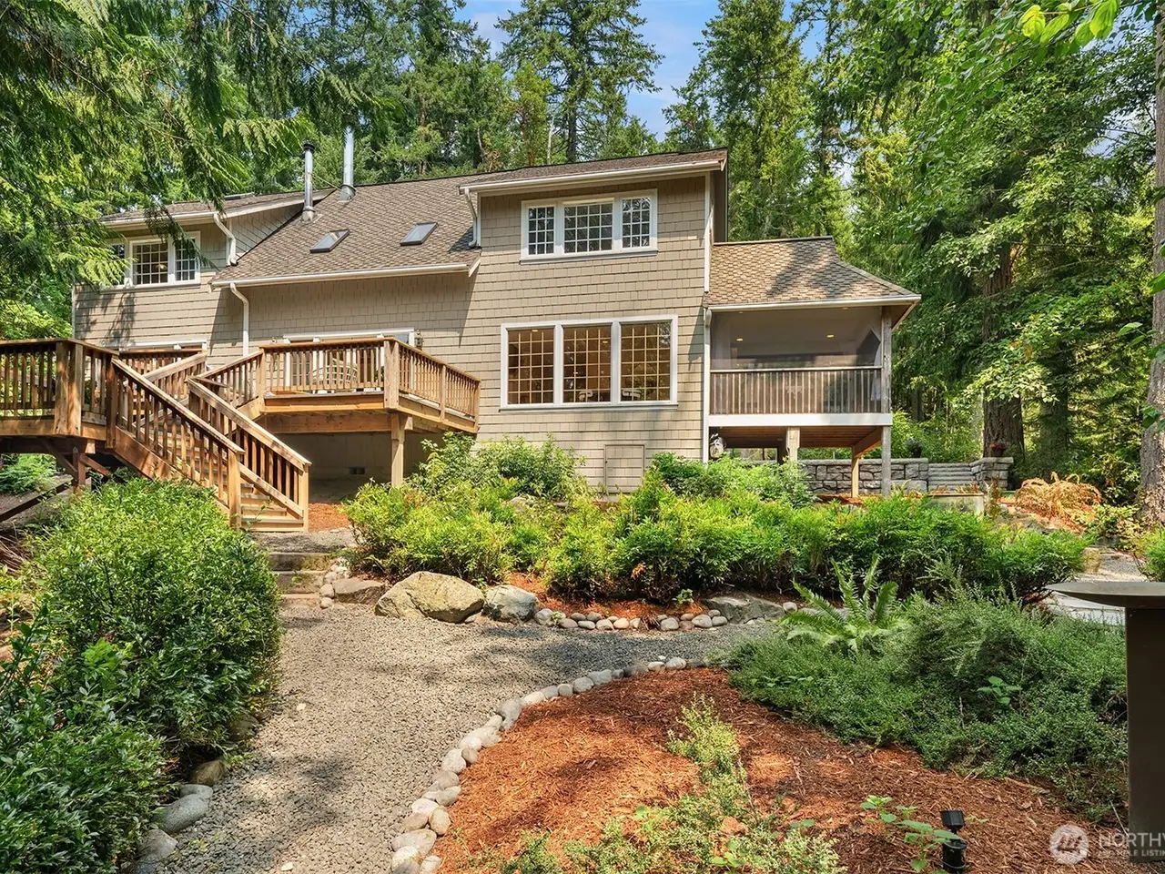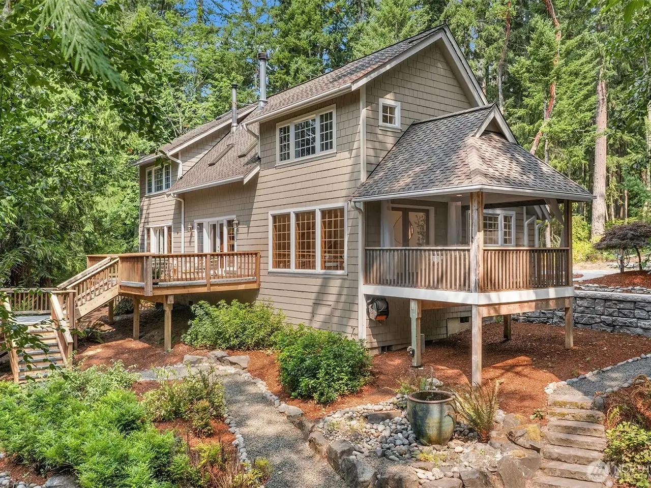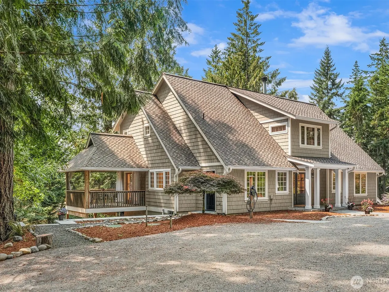 Tucked away on 5 serene acres along Vashon's west side, this retreat-like home blends elegance w/ privacy. Enjoy the sun-filled LR where madrone floors, a cozy fireplace,& soaring vaulted ceilings create a warm, welcoming ambiance. A hidden door reveals the primary suite w/ dual walk-ins, tiled bathroom & FR doors to the deck. A kitchen designed for both beauty & function, showcasing quartz counters, custom cabinetry, & premium appliances including a Liebherr fridge & Bertazzoni range. Upstairs boasts spacious bedrooms, a bonus room & full bath. Radiant floor heating runs throughout for comfort in every season. A 2-car garage & EV charging completes this peaceful island sanctuary--an inspiring place to live, entertain & recharge.