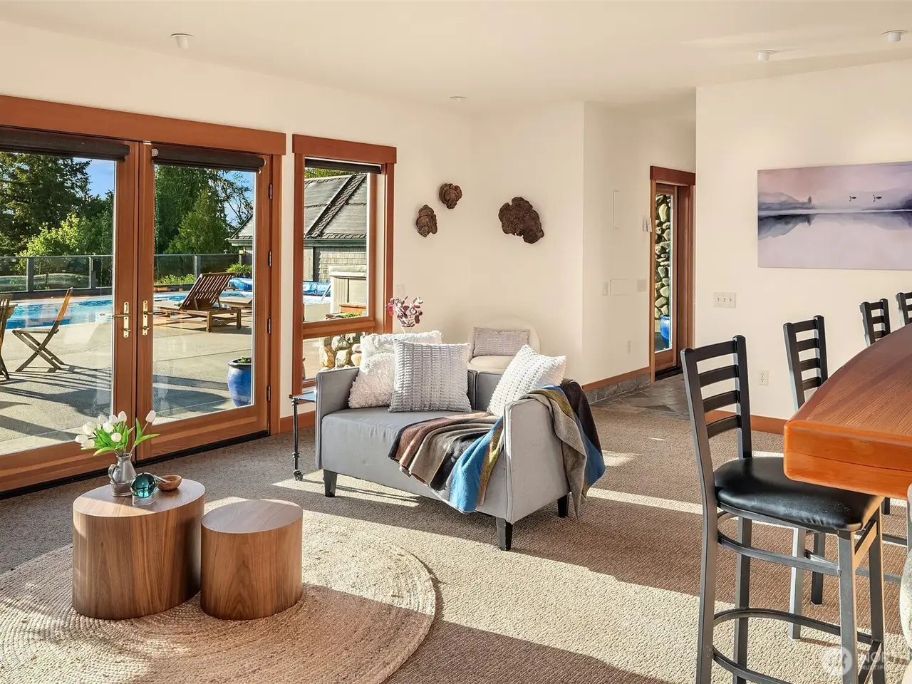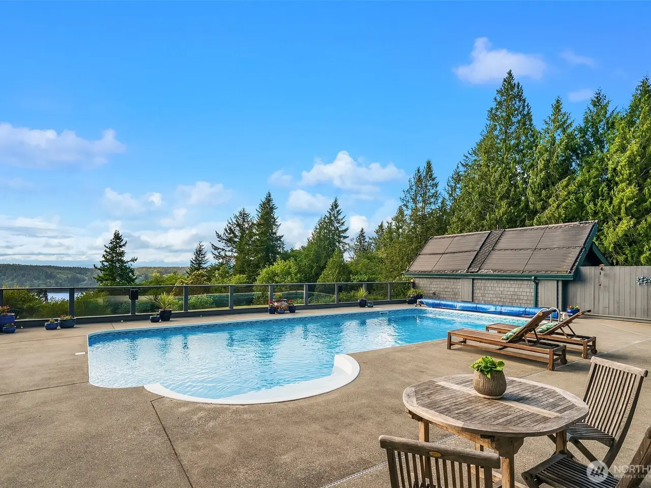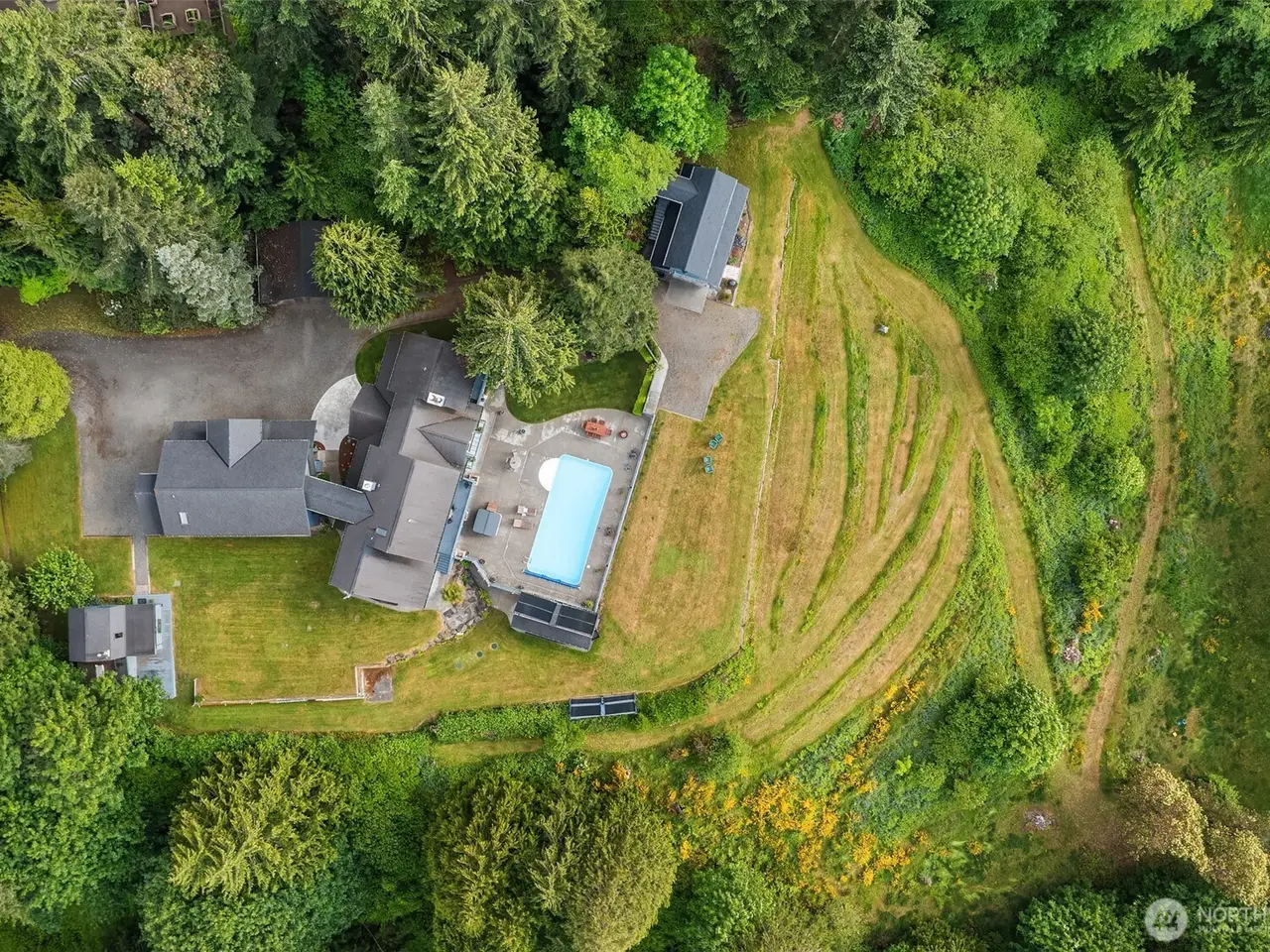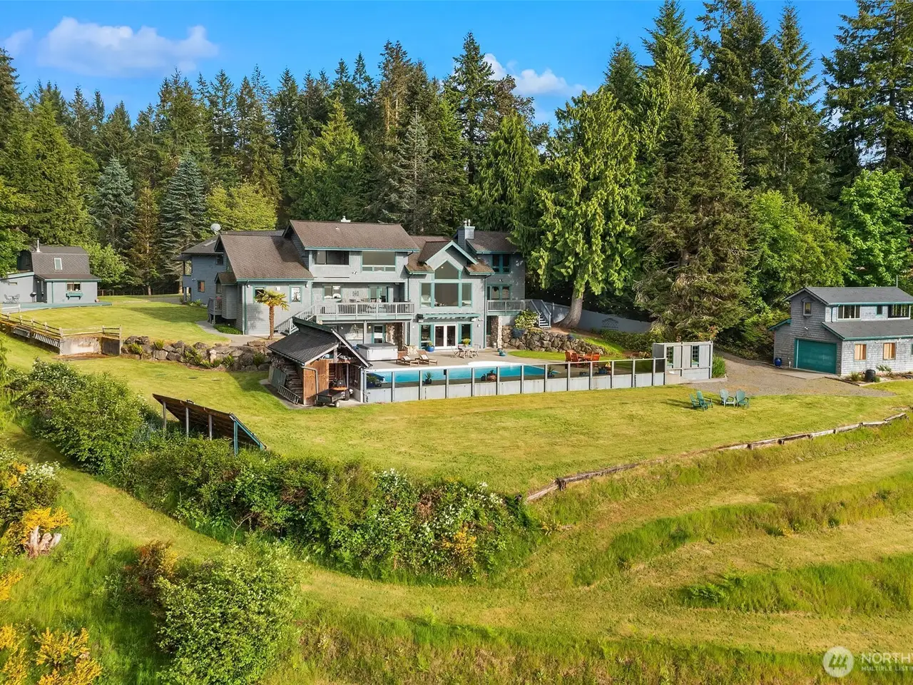 Experience the best of Pacific Northwest living in this stunning 4,000 + sq ft Mountain & Sound view retreat on nearly 5 private acres. This 3 bedroom, 5 bath custom home offers expansive living spaces, soaring ceilings, and breathtaking views from nearly every room. Clear Fir trim & custom cabinetry, stone fireplaces, lower level game/rec room with wet bar & wine cellar. Primary suite has its own access stair & balcony. Enjoy summer entertaining with a large in-ground pool and spacious patio. Two detached dwelling units provide flexible options for guests or rental income. Huge shop offers space for hobbies, storage, or business use. A rare opportunity to own a private oasis just minutes from town, with room to live, work, and play.