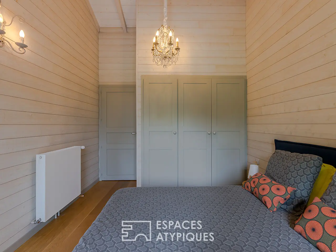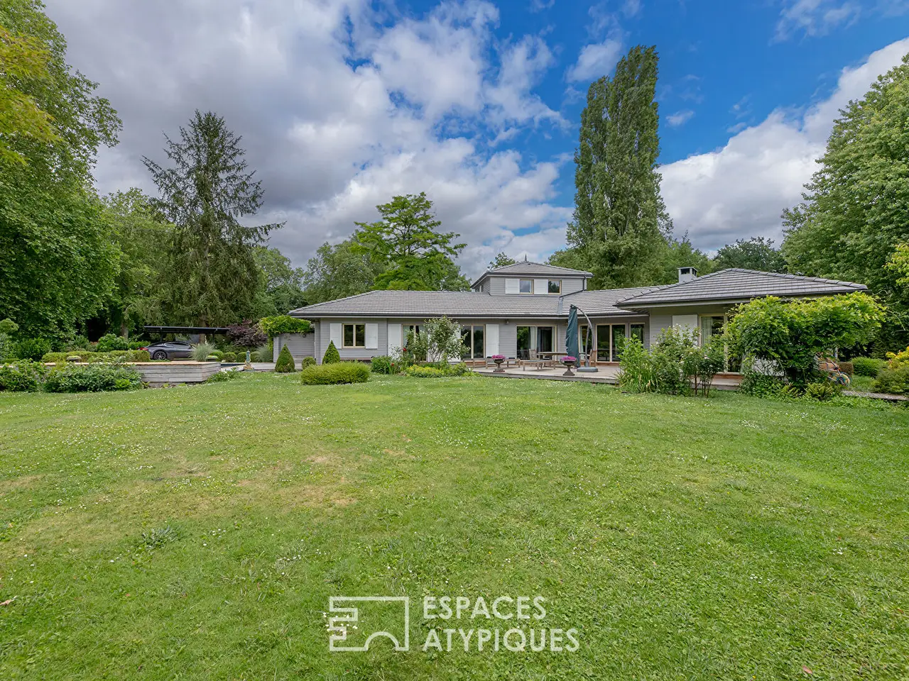 Like an air of Louisiana in Normandy: such is the promise of this incredible house nestled in one of the rare private estates in the Eure valley. Indeed, before accessing the property, you will have to 'show your credentials' at the gates of the Chateau park, a magnificent 70-hectare estate crossed by a river and within which around fifty residences with varied architecture are scattered. Without a doubt, this property is undoubtedly one of the most original and of the highest standard. Born in 2002 from the hand of an inspired architect, the 'V'-shaped architectural house immediately displays a unique character and arouses curiosity thanks to its almond green cladding that is both romantic and contemporary. Continuing, the interior atmosphere is soft and relaxing. A large entrance leads directly to the main room, the large cathedral living room and the adjoining American kitchen. Nearly 65 m2 dedicated to the reception, by the fireplace or by opening the bay windows opening directly onto the beautiful wooden terrace and the swimming pool with counter-current swimming. Each season has its pleasures with only one constant: 'well-being'! The master suite adjoining the living room is no less astonishing: 45 m2 made up of 2 beautiful rooms: one serving as a bedroom and the other which can be transformed into a dressing room or office as desired. An elegant bathroom and a library corridor complete the ensemble. In the other wing of the house, 3 pretty bedrooms, a bathroom, a shower room and separate toilets will welcome family and friends in complete peace and quiet. Upstairs, in the 'turret', 2 additional rooms (bedroom and office) with adjoining shower room and toilet make up almost an independent mini-studio. A pantry and laundry room connect the entrance to the house with the garage, now converted into a workshop and technical room. Heating of the whole is provided by a geothermal heat pump. Outside, the garden designed by a renowned landscaper, who collaborated in the design of the Jardin des Tuileries), is a true enchantment in all seasons; robotic lawn mowers and automatic watering will allow you to enjoy it without constraints and without being overlooked. Double carport with charging station, garage and garden shed complete the premises. For those who find this cocoon too narrow, simply go through the gate to go for a walk in the paths of the estate, near the lake or along the Eure; unless you prefer to perfect your backhand on one of the 3 tennis courts open to the co-ownership. This incredible gem is located 1 hour from Paris and 6km from Pacy-sur-Eure! Louisiana is definitely at your doorstep! CLASSE ENERGIE : C / CLASSE CLIMAT : A Montant moyen estime des depenses annuelles d'energie pour un usage standard, etabli a partir des prix de l'energie de l'annee 2023 : entre 1730€ et 2380€ Les informations sur les risques auxquels ce bien est expose sont disponibles sur le site Georisques : www.georisque.gouv.fr REF. 9232EAE Additional information * 8 rooms * 6 bedrooms * 4 bathrooms * 2 shower rooms * Floor : 1 * 2 floors in the building * Outdoor space : 2635 SQM * Parking : 3 parking spaces
