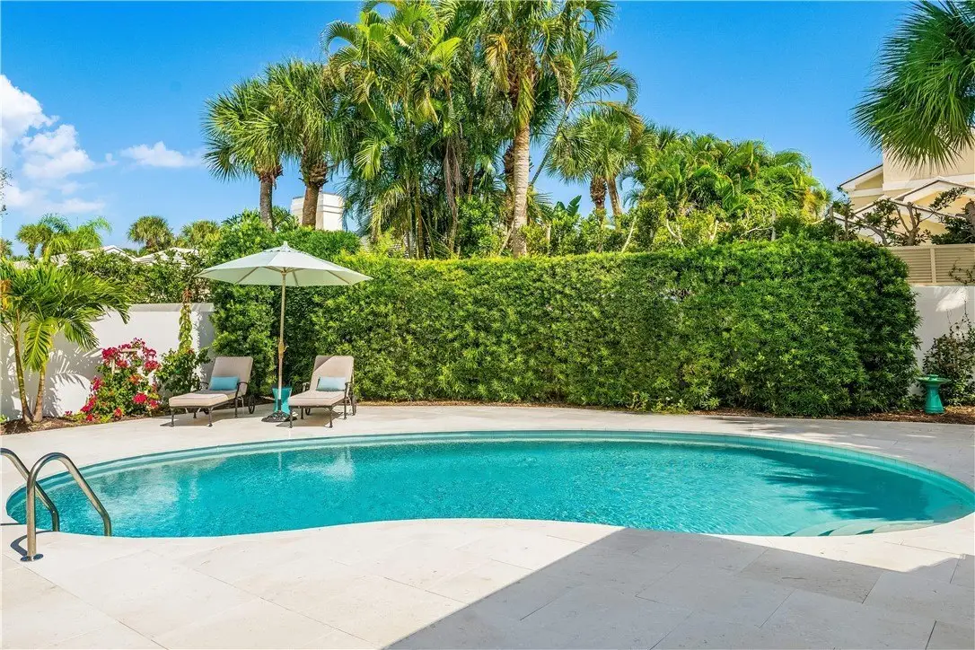Ideally situated east of A1A, the established gated enclave of Sea Forest Court is graced with majestic live oaks and lush tropical landscaping. Just a short walk to private beach access, this charming Old Florida Bermuda-style CBS home offers 2 bedrooms, 2.5 baths, plus a den overlooking the pool and garden. Interior features include vaulted ceilings, impact French doors, and classic pickled Saltillo tile floors. A two-car AC garage completes the plan. Brand new pool deck. Close proximity to boutique ships, restaurants and community beach pavilion.