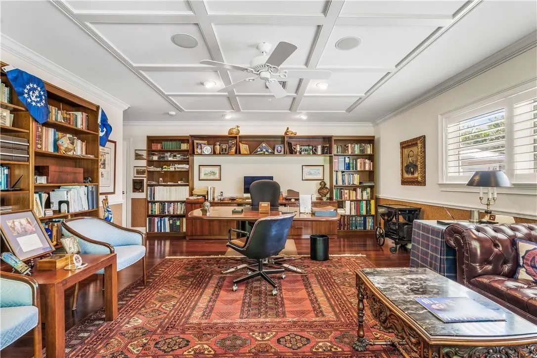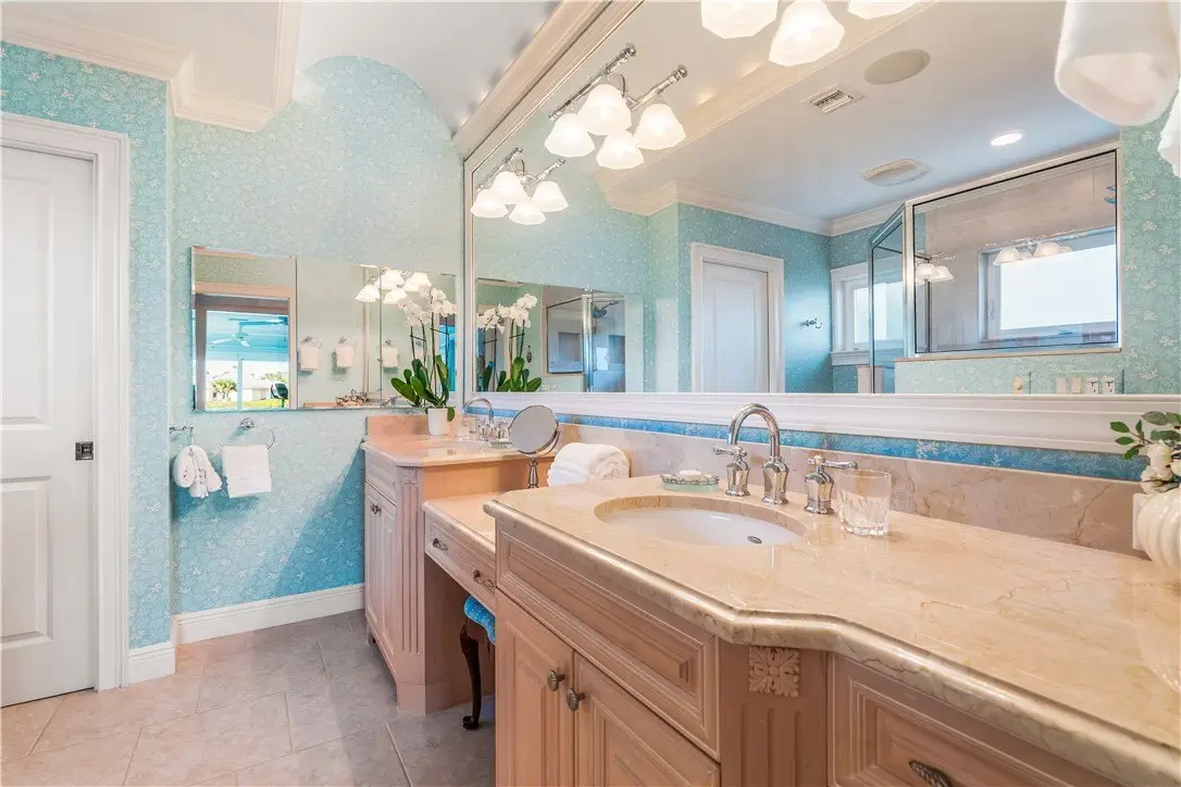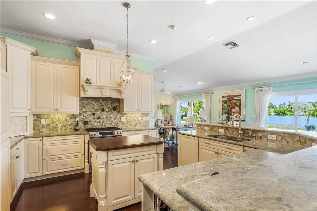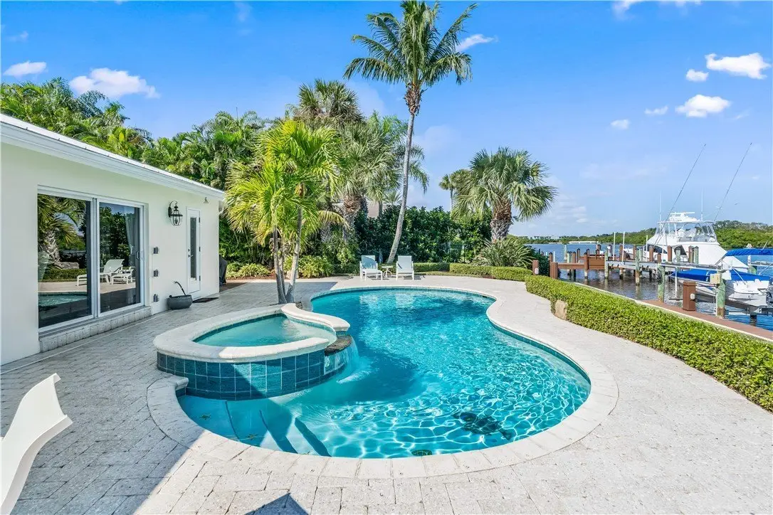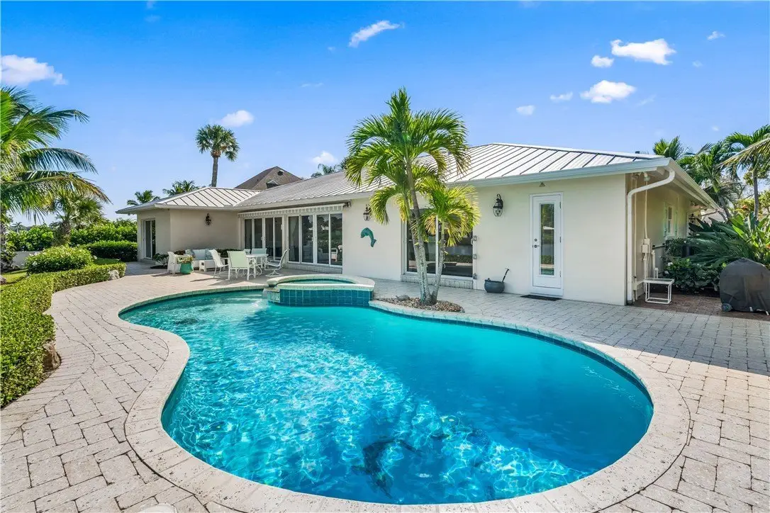 Elegant 3BR/3.1BA home exudes Old-Florida charm at the end of a cul-de-sac in Riomar Bay. Approach the residence via a circular drive. The tray-ceilinged entry foyer with rich wood floors opens to a bright and open floor plan. Kitchen has granite countertops, gas range, custom cabinetry. Formal living/dining areas enjoy pool views. A coffered ceiling and wall to wall built in accentuate the distinguished den. A retractable awning creates lovely poolside gathering area. Private dock/lift, impact glass, generator, pool bath, central vac, garden fountain, and panoramic Intracoastal views.