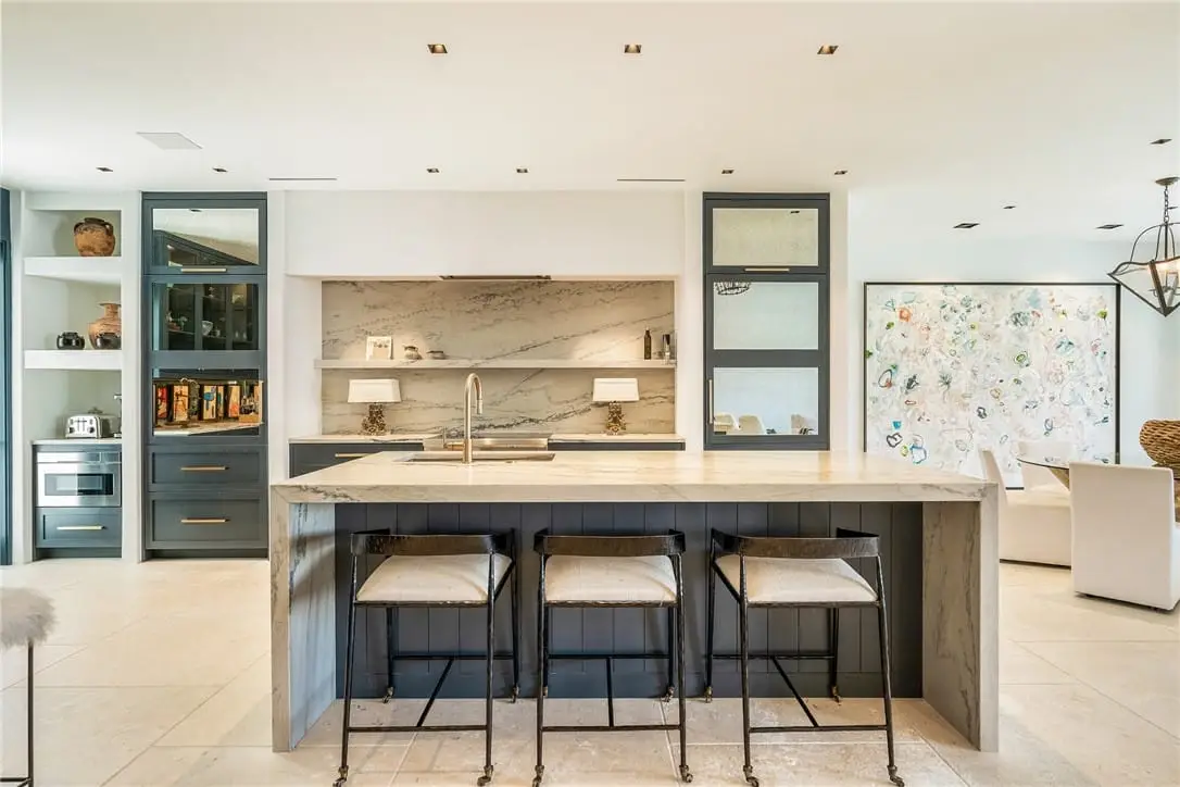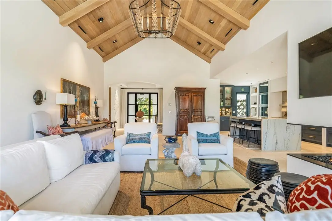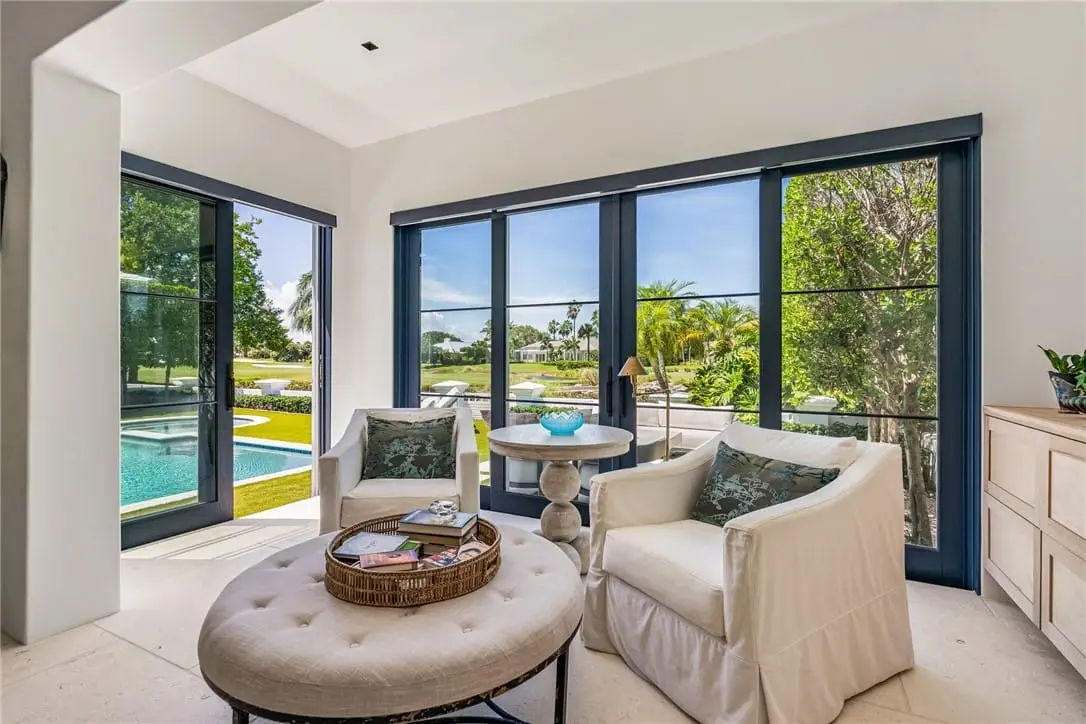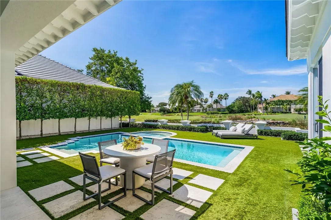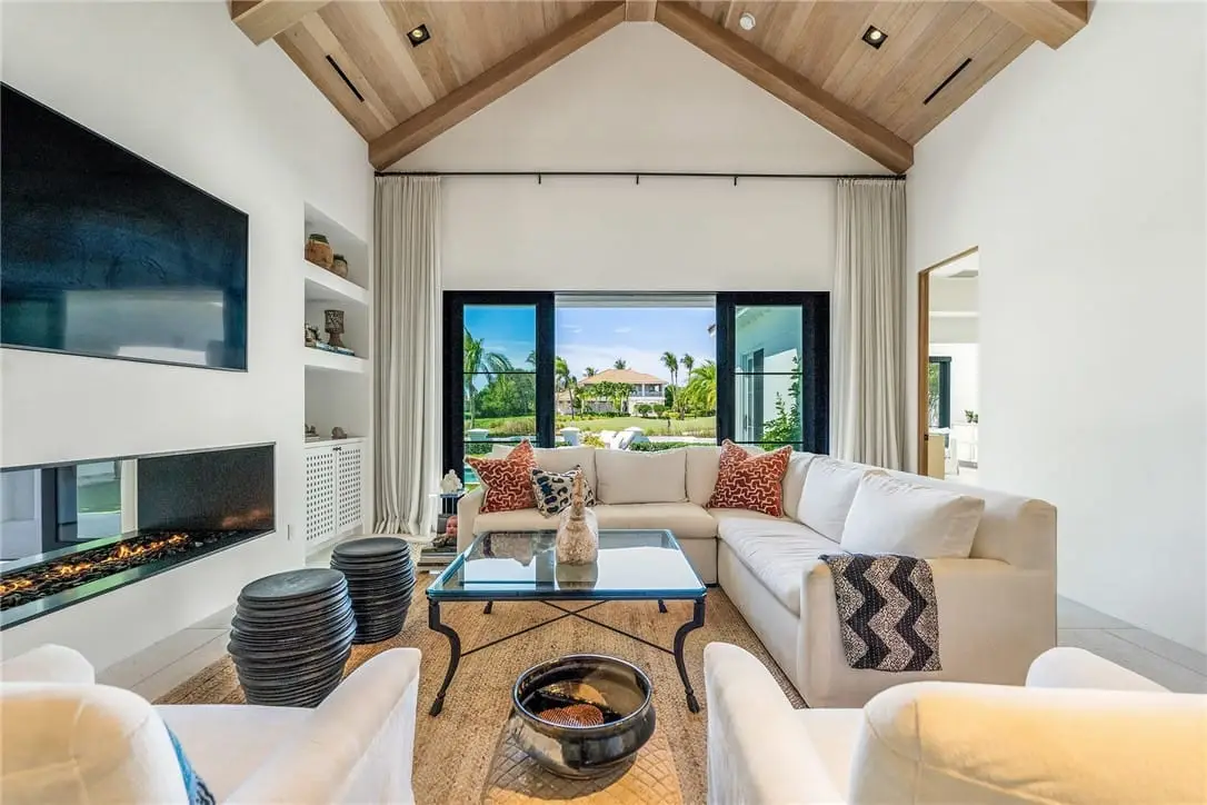 Stunning Orchid Island home with beautiful golf view of the 14th fairway. Remodeled updates include impact glass, Imported Turkish limestone floors throughout, oak interior doors and an open kitchen with top-tier appliances and Quartzite counters. A beautiful cathedral wood ceiling accents the light and airy living room and a modern gas fireplace opens to the living and dining rooms. The spacious primary suite offers golf views. An expansive electric-heated pool with new spa, built-in grill adjoins a shaded patio and gas firepit perfect for entertaining and relaxing at home. Sizes approximate/subject to error.