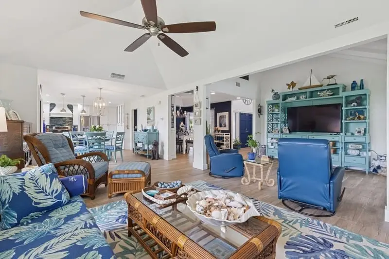 Thoughtfully designed 4BR/3BA coastal retreat where no detail is overlooked. Elegant white kitchen, custom cabinetry, and wood plank tile throughout. Resurfaced saltwater pool, gas fireplace, and range, plus exterior gas line for grilling. Spacious fenced yard with new 30-year metal roof (completion mid-Nov). Walk or cart to deeded beach access with private parking, lanais, showers, grill & tortoise habitat. Near Moorings Yacht & CC with rare Social Club Membership opportunity.
