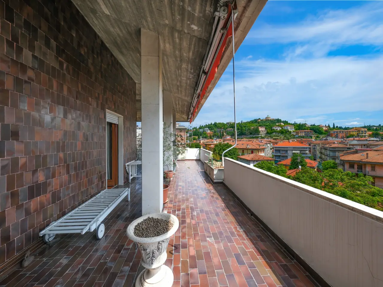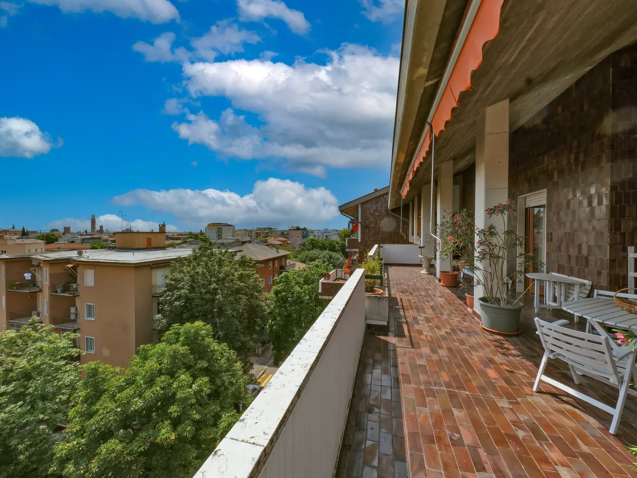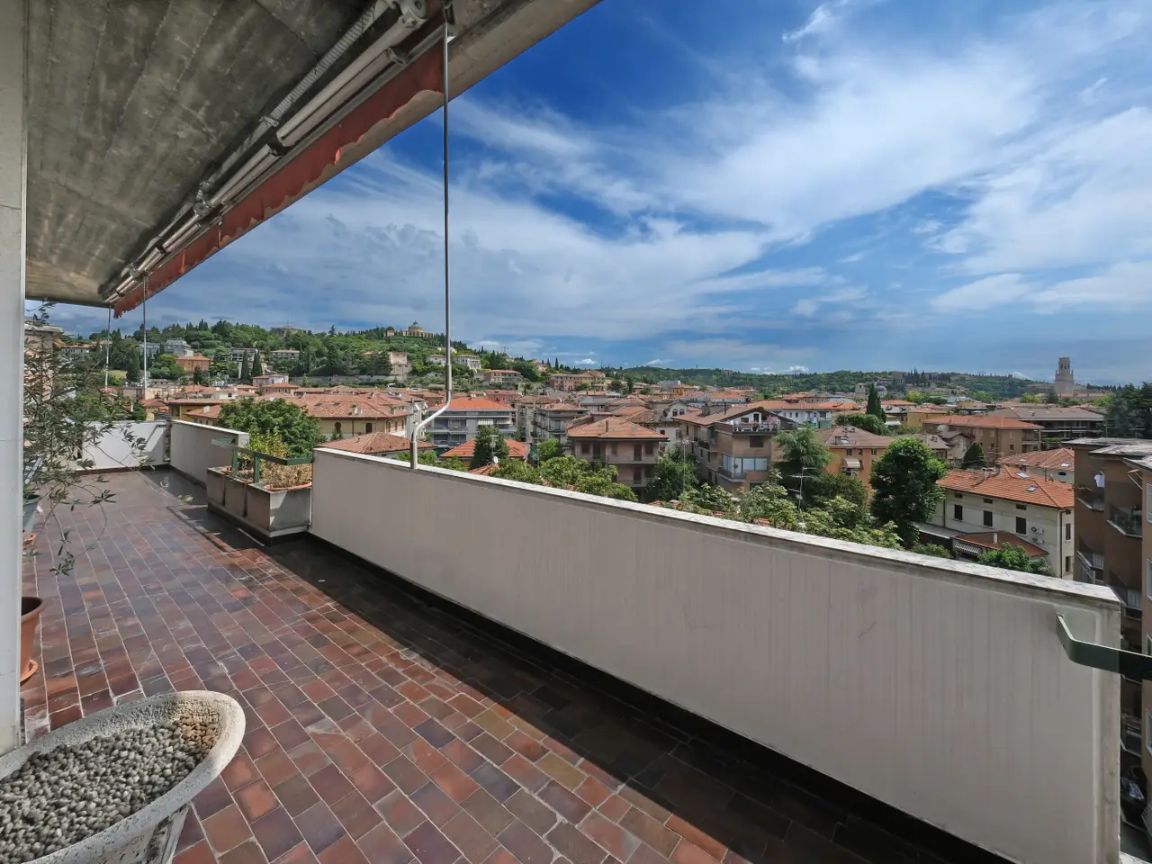 Very rare opportunity of spacious apartment FOR SALE, on the top floor of an exclusive building served by elevator, in Vittorio Veneto square area of Borgo Trento, few minutes by walk from historical center and Verona's main shopping streets, with marvellous big panoramic TERRACE, accessible from living room and bedrooms, viewing the city and Torricelle hills. Entrance hall, livingroom with large windows and access to the splendid terrace, three bedrooms, two bathrooms with windows, eat-in kitchen with additional terrace; on the upper floor, accessed by an open wooden stair, a room/study with balcony, bathroom, another bedroom for guests, office and hobbies' room. The apartment needs renovation. In the basement there's a garage for two cars.