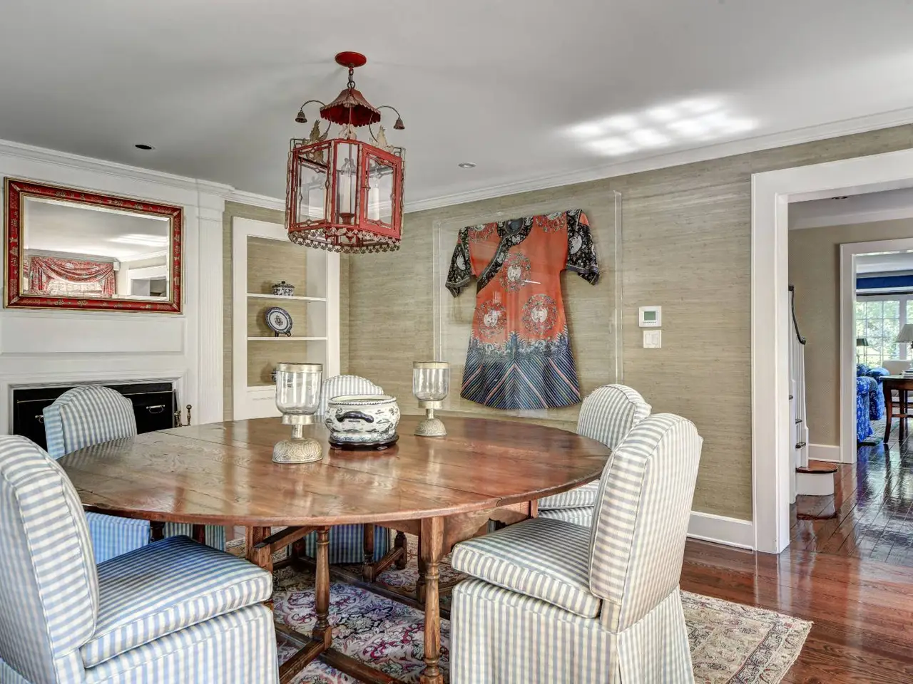 Fireplace in bright blue living room