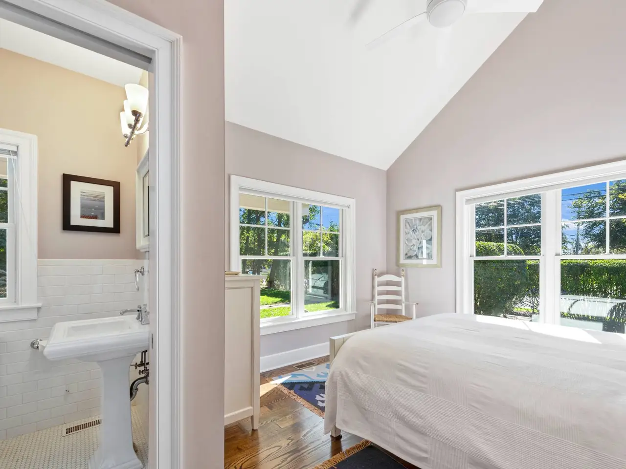Nestled in the heart of Sag Harbor's Historic Whaling Village, this 3 bedroom 3 and 1 half bath house seamlessly blends charm and elegance. Bathed in natural light, the property boasts a modern kitchen perfect for gatherings, and a cozy living room featuring a wood-burning fireplace and cathedral ceiling. The first floor offers two bedrooms, including an en-suite, a shared hall bath, and a versatile den space with pocket doors. Ascending to the second floor, you'll discover a loft-like primary bedroom complete with a generous walk-in closet and bathroom, showcasing a double vanity and tasteful design. Step outside onto the expansive deck, ideal for entertaining, which overlooks the heated gunite pool and a serene wildlife reserve. Set on a .42-acre lot, this home provides a sense of seclusion and tranquility while being mere moments from the vibrant heart of Sag Harbor Village.