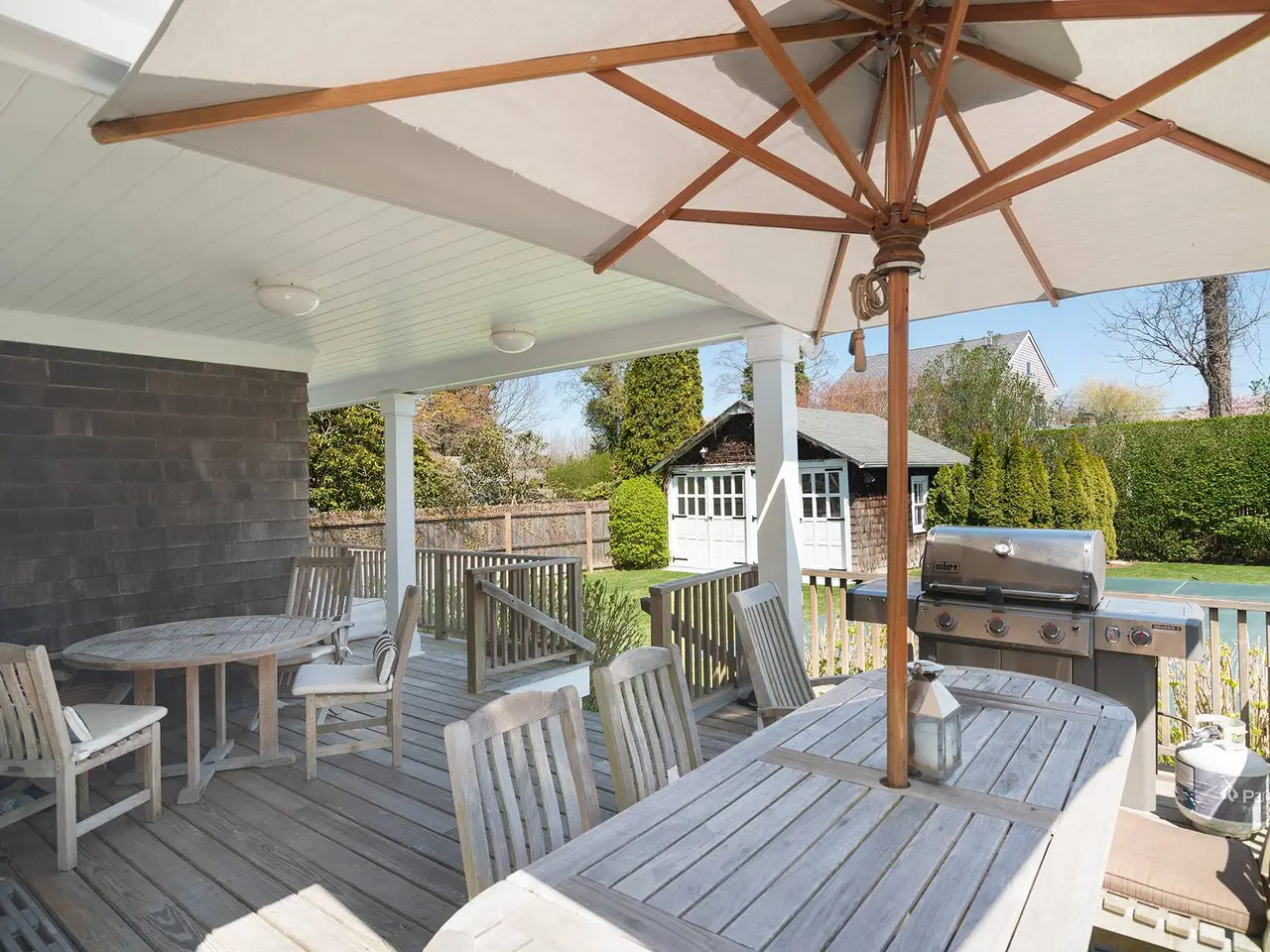 New to the rental market, this completely renovated Village Traditional Beach Cottage is available for the Fall 2023 season. A classic shingled-style home with a Dutch Gambrel gabled roofline, this property is a short distance from the Village center. A four-bedroom, 3.5 bath home on three levels, this is the perfect spot for the summer. There is also a heated gunite pool sequestered behind high hedges providing privacy. Completing the property is a wonderful summer porch in the front of the house and a detached two-car garage, with its cathedral ceiling, exposed beams and finished walls that can double as a charming cabana adjacent to the pool. Your opportunity to enjoy the Fall in Southampton Village.