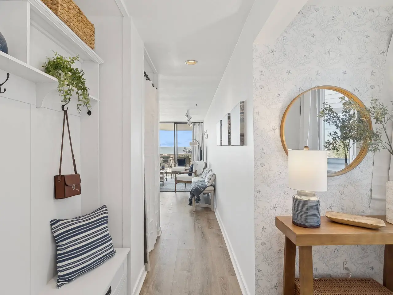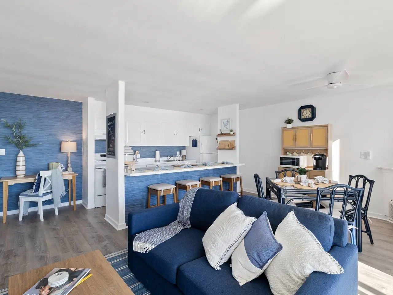 Open sun-lit living room, dining room, and kitchen