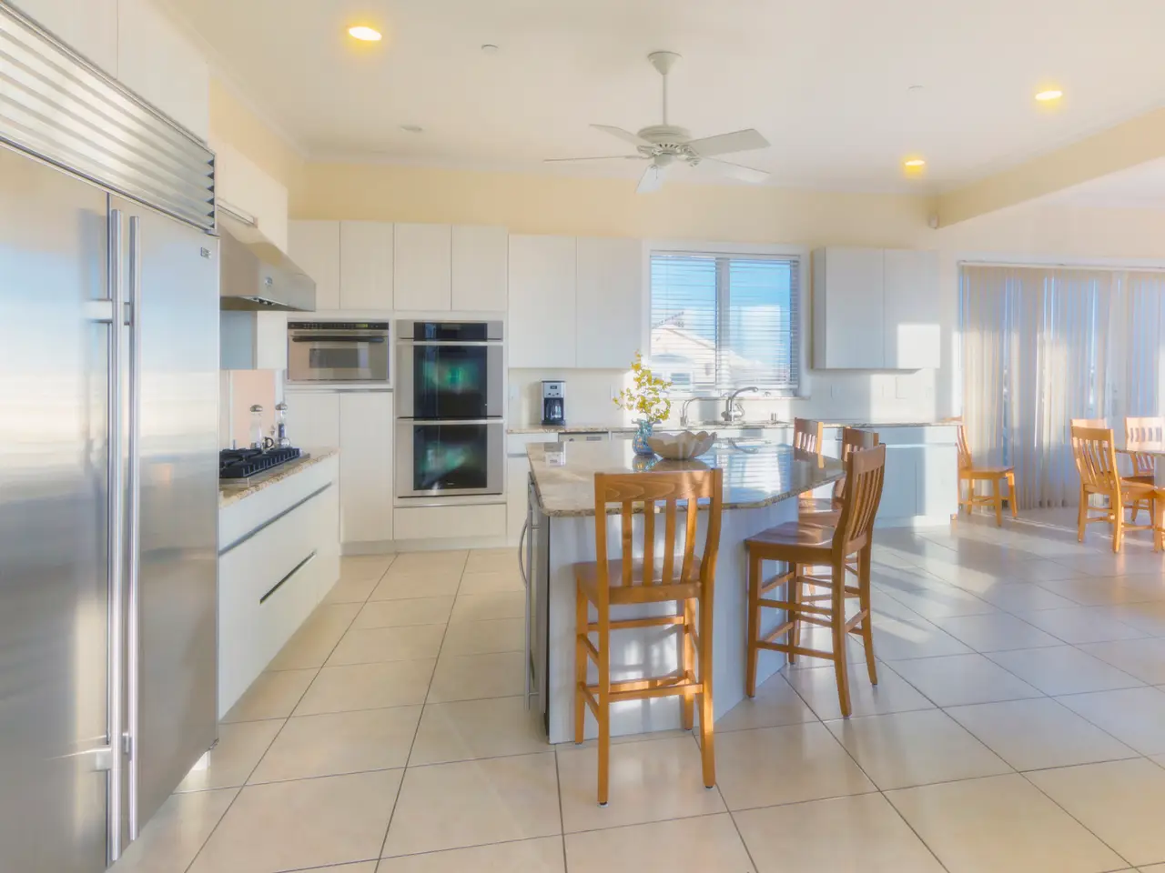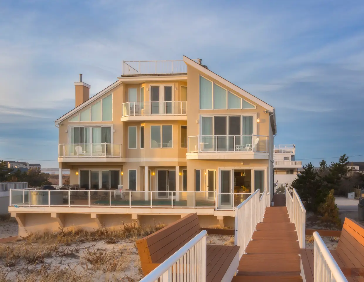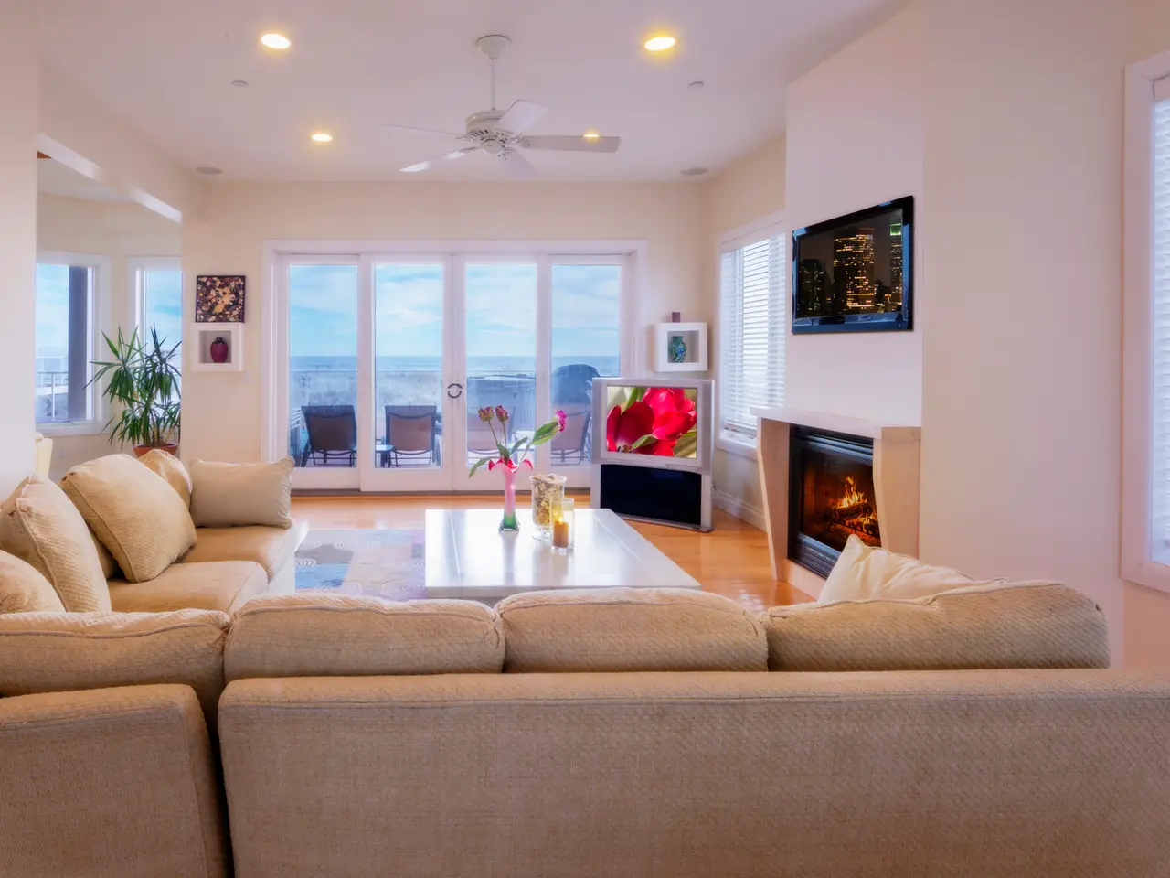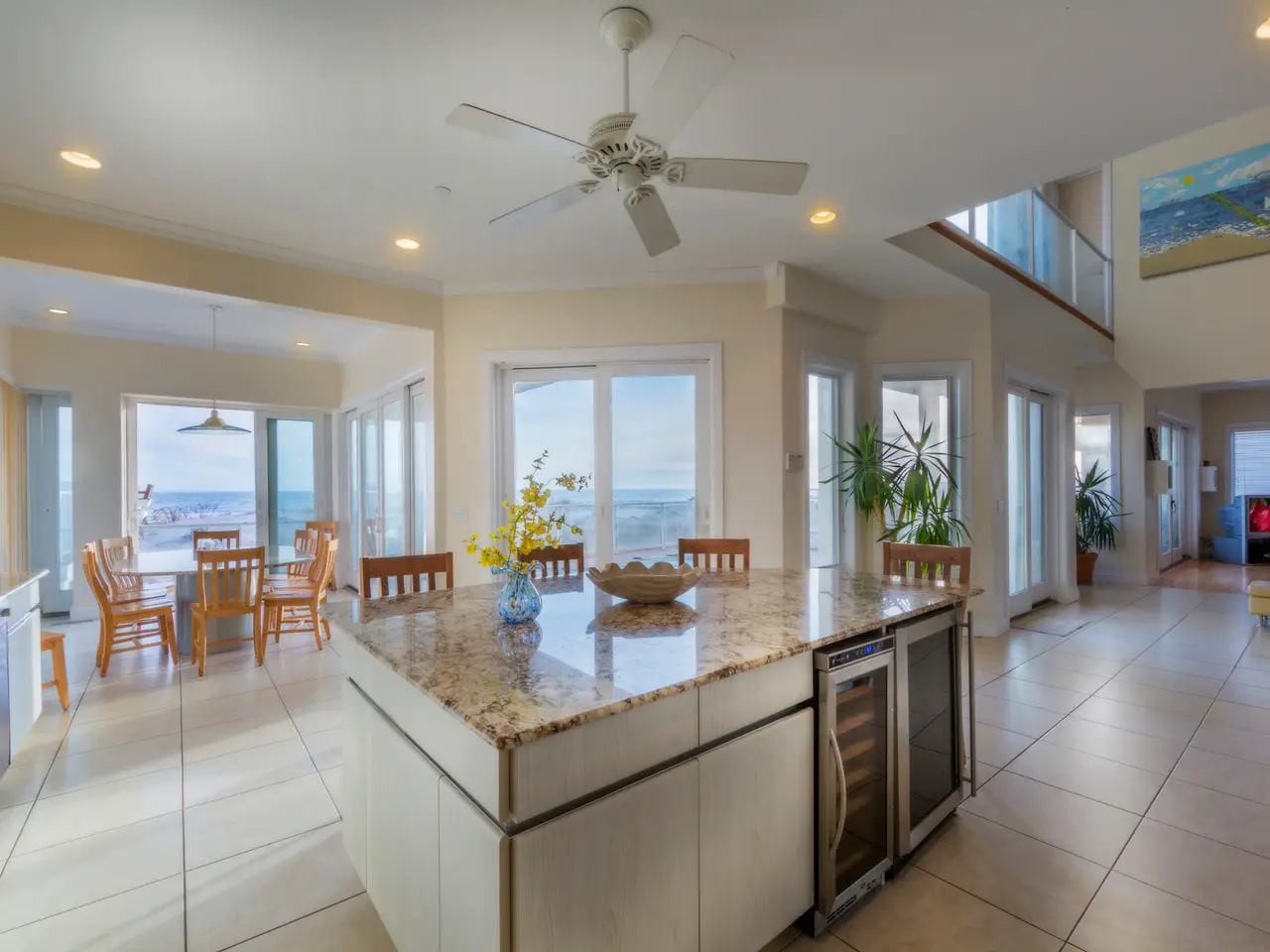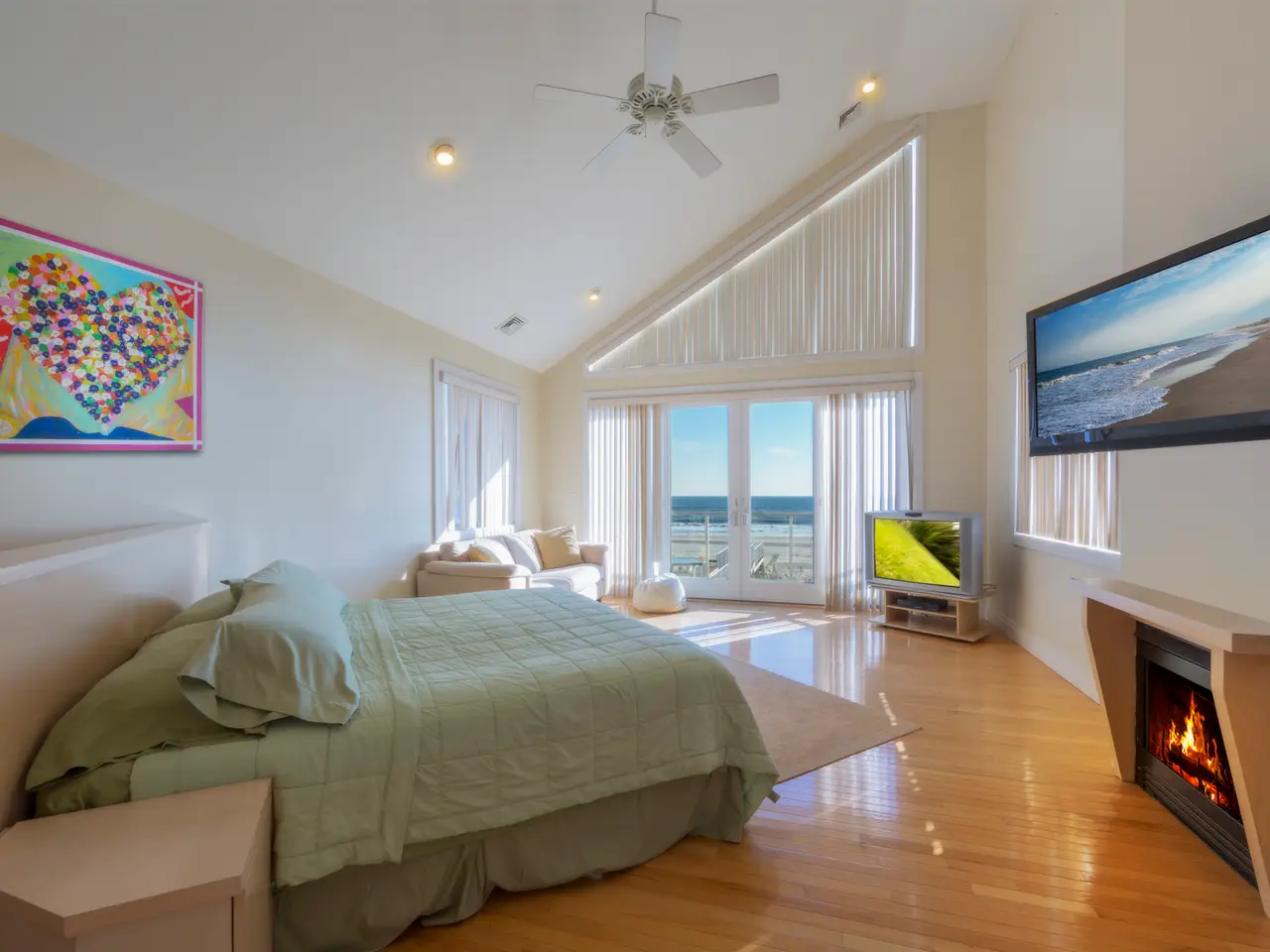 Fabulous ocean views from almost every room in this contemporary style home featuring eight bedrooms, six full and one-half baths. Spacious open living areas showcase dramatic ocean views through oversized windows and sliding glass doors. Amenities include a large gourmet kitchen, two dining areas, multiple balconies, marble bathrooms, central air, and two fireplaces. Outdoors there's a large deck that is great for entertaining, and a heated pool on the ocean side with a private walkway to the beach.