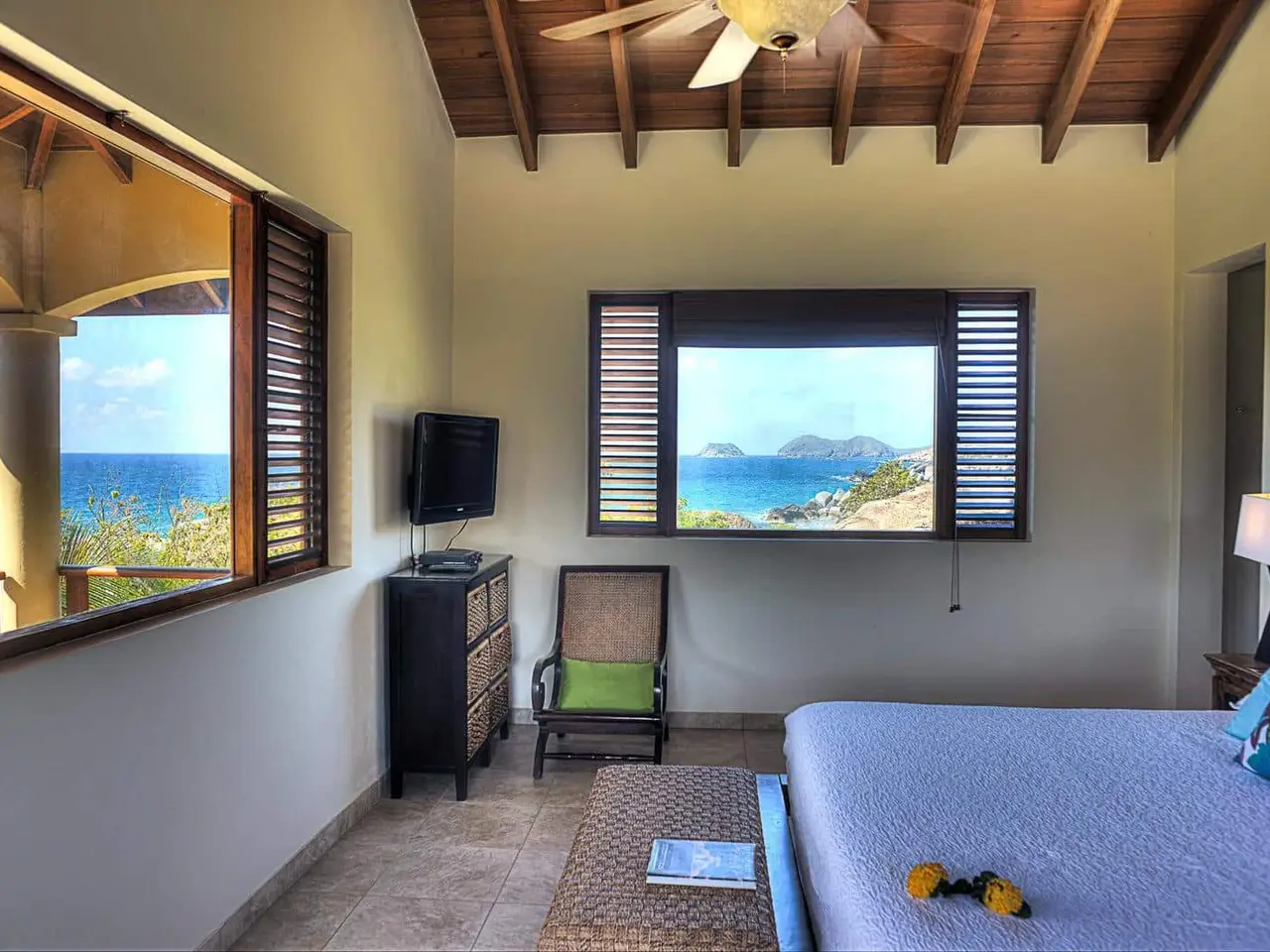 <iframe src="https://my.matterport.com/show/?m=CYJ1ds1XgV6" width="853" height="480" frameborder="0" allowfullscreen="allowfullscreen"></iframe><br /> <br /> <iframe src="https://my.matterport.com/show/?m=hQyUWGdqvtw" width="853" height="480" frameborder="0" allowfullscreen="allowfullscreen"></iframe><br /> <br /> ‘Calypso Villa’ is one of Virgin Gorda’s finest luxury villas; fully renovated in 2018. Quietly nestled among magnificent boulders and beautiful vegetation, the property is very private and welcoming. Built on a large land lot, the property is very private and peaceful.<br /> <br /> The house was designed and situated on the property to take advantage of prevailing trade winds and to maximize the panoramic views of the Caribbean Sea. Calypso’s thoughtful design provides numerous shaded porches where guests can escape the mid-day heat as well as a sun drenched pool deck that is the ideal spot for fun in the sun.<br /> <br /> Calypso’s living spaces feature walls of folding glass doors that allow for the very best in Caribbean indoor-outdoor living. Calypso’s outdoor spaces feature high quality teak furniture with plenty of seating options. As you soak up the sun or relax in the shade you will be surrounded by the villa’s mature tropical gardens filled with flowers, cacti, and fruit trees. A few hours spent chilling in Calypso’s pool is the perfect way to take in all this incredible property has to offer.<br /> <br /> Calypso Villa has a fully equipped chef’s kitchen with granite countertops and stainless steel appliances. You can also enjoy gas and charcoal BBQ grills on the pool deck. This house is particularly well equipped and as a result makes for a truly comfortable vacation experience.<br /> <br /> Calypso Villa is a 3-bedroom, 3½ bathroom house featuring large interiors and expansive outdoor decks and patios.<br /> Each bedroom has it’s own private bathroom and outdoor spaces feature high quality teak furniture with plenty of seating options.<br /> <br /> This house is great for sharing because each bedroom is like a master suite. Two of the bedrooms feature king-sized mattresses and two of the bathrooms have additional outdoor showers. The third bedroom has two queen-sized beds. This configuration offers lots of flexibility for families with children. All of the bedrooms are equipped with air conditioning and have flat panel televisions.<br /> <br /> Calypso Villa is a fenced and gated property located in the exclusive residential neighborhood of Crooks Bay near the Baths in Virgin Gorda. The house is a short walk to the beach at Crook’s Bay. This villa is ideally located within a 5 minutes drive from a dozen restaurants, the Virgin Gorda Yacht Harbor, all of the island’s grocery stores, and a ½ dozen world-class beaches including The Baths, Spring Bay, and Little Trunk Bay. The location is ideal for enjoying the very best of Virgin Gorda. We know you will love it at Calypso Villa!!