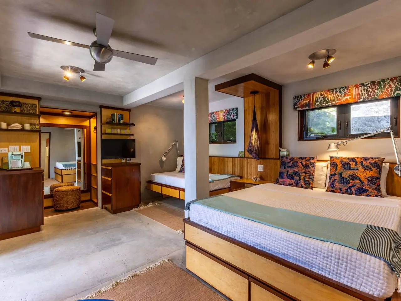 Symbio Villa exists in perfect symbiotic harmony with the natural elements of Virgin Gorda. Rich exotic timbers, lush tropical trees, vast ocean views, gigantic boulders, and gorgeous sunsets create the splendour of this beautiful home. Symbio is minutes away from pristine white beaches, The Baths and the historic Coppermine. It is set within Princess Quarters, a private estate less than a five minutes’ drive to the airstrip, yacht harbour and ferry terminal. Symbio, built with three levels, has a sunny salt-water swimming pool surrounded by tropical palms and flowering plants. On the entry level is the sophisticated Great Room that unites modern elegance and traditional Caribbean charm. Elegant dining and entertainment areas, a fully equipped kitchen with Viking appliances, and a secondary screened-in grill kitchen are on the main level. Wide open verandas, with clusters of couches surround this main level. Also on the entry level is an ensuite bedroom with open-air shower, and a covered patio, furnished for privacy and relaxation. Occupying the entire upper level of this Virgin Gorda villa is the luxurious master suite. With an open floor plan, the king bedroom flows seamlessly into the spacious bath with alfresco shower. A secluded lounge area with views of the neighbouring islands makes this suite private and inviting. On the lowest level of the villa is the third bedroom. Strolling across the arched wooden bridge, and the sheltered porch is this beautiful bedroom with a sunken bathroom done in a nautical theme. Symbio Villa is an exclusive retreat perfect for the discerning buyer seeking a private oasis in one of the world’s most desirable vacation destinations. Additional Details: Electricity-Generator: Main power is provided by BVI Electricity Corporation. Back-up power provided by 45KW Propane Generator. Air Condition: The three bedrooms and Great Room have air-conditioning and are each controlled separately. Landscaping: Professionally designed and landscaped with a multi-zone drip irrigation system provides generously for gardens. Water Supply: Government mains and cistern (approximately 15,800 gallons.
