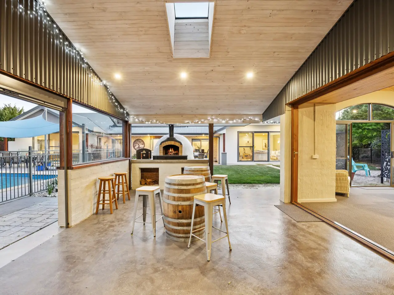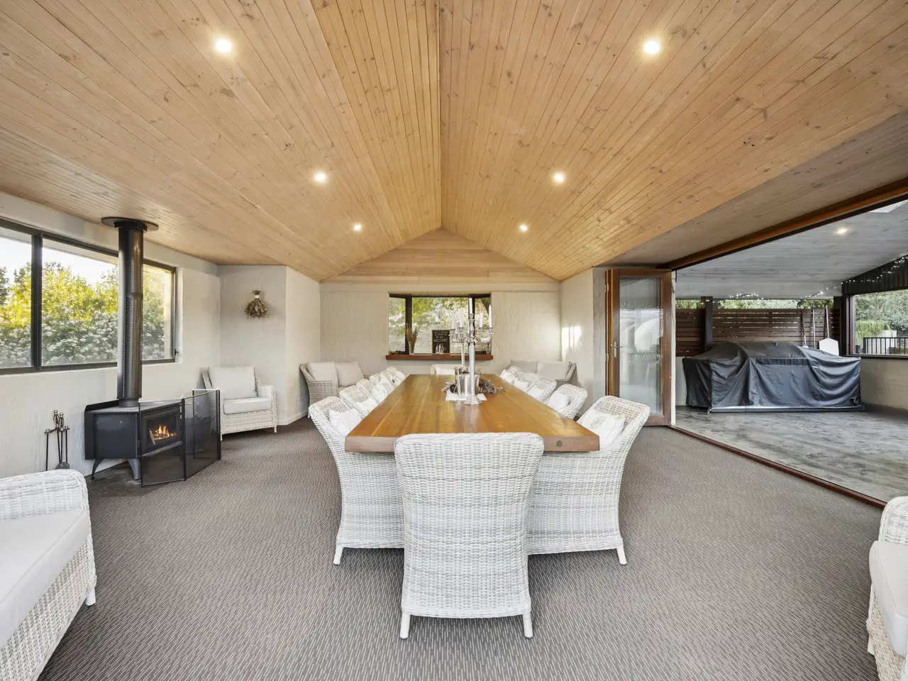 Outdoor dining room with cathedral timber ceiling and slow combustion fireplace