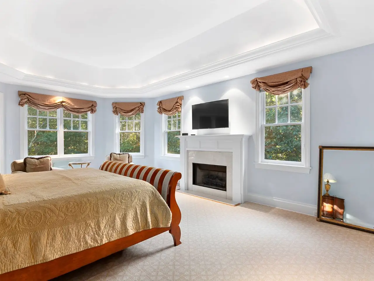 Upstairs master suite with fireplace and balcony