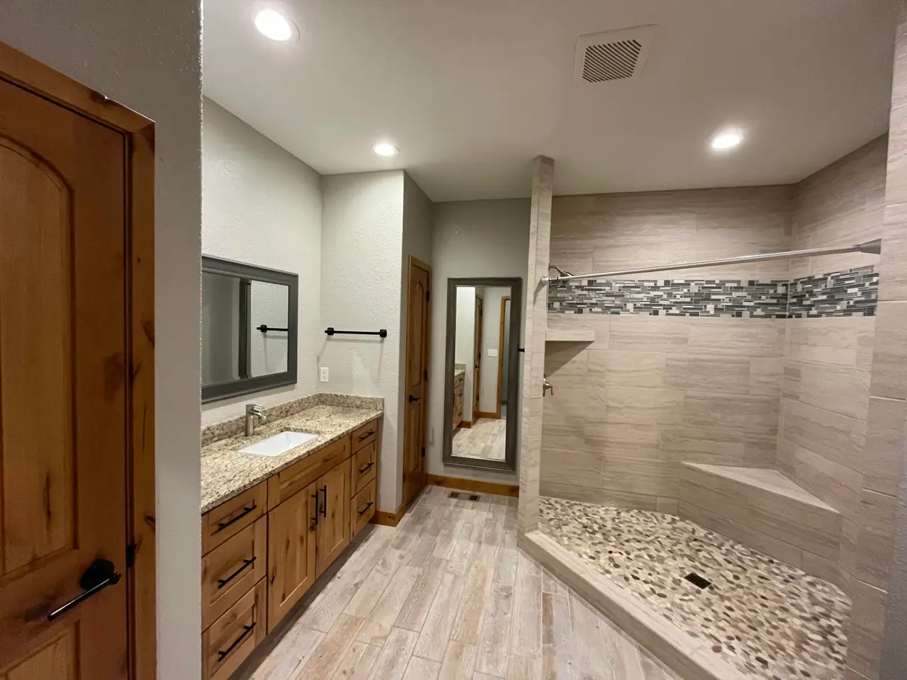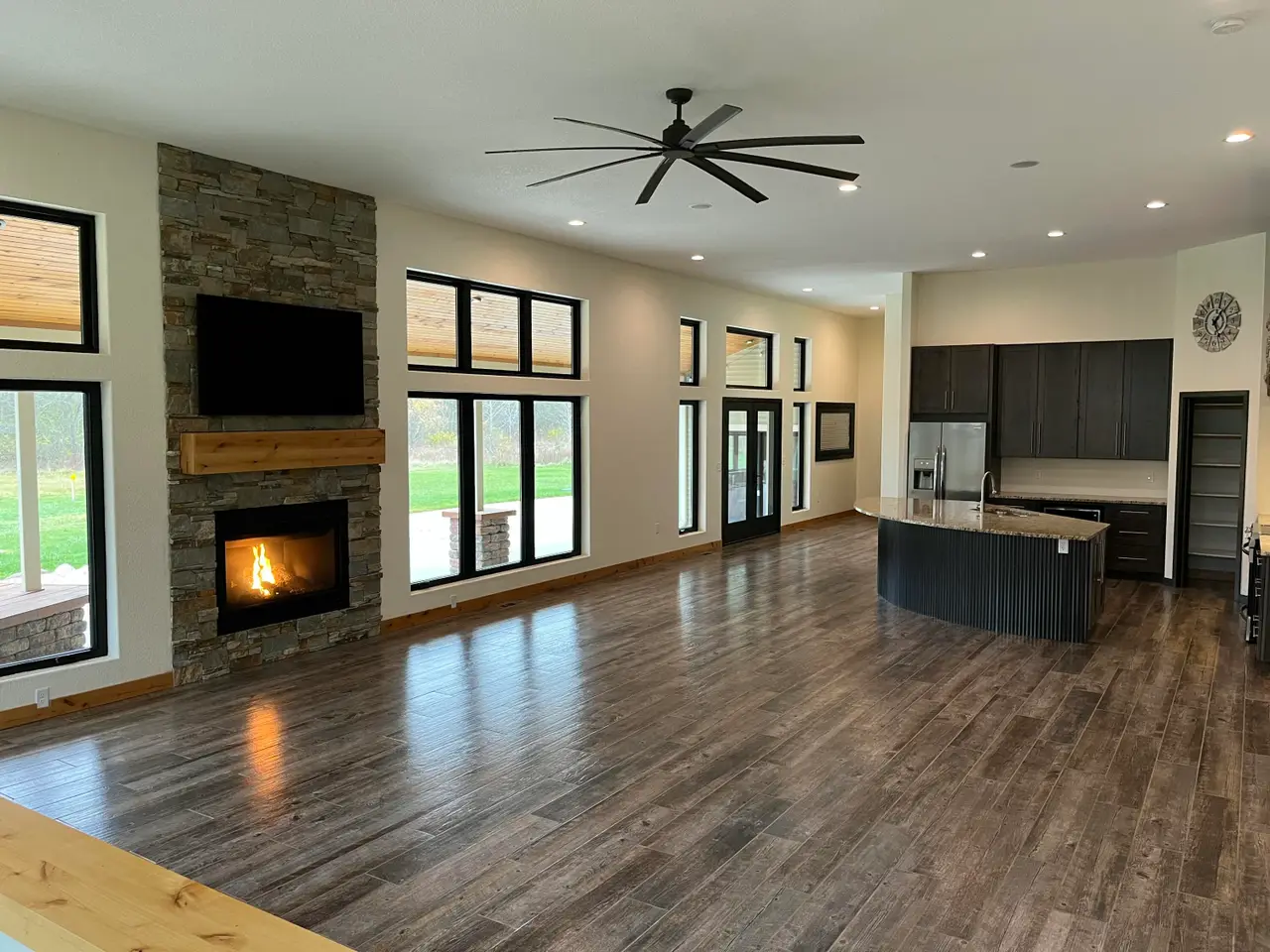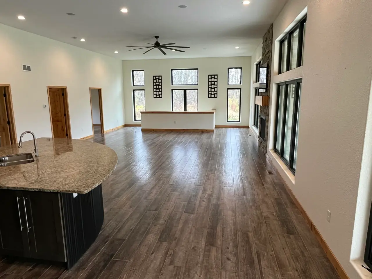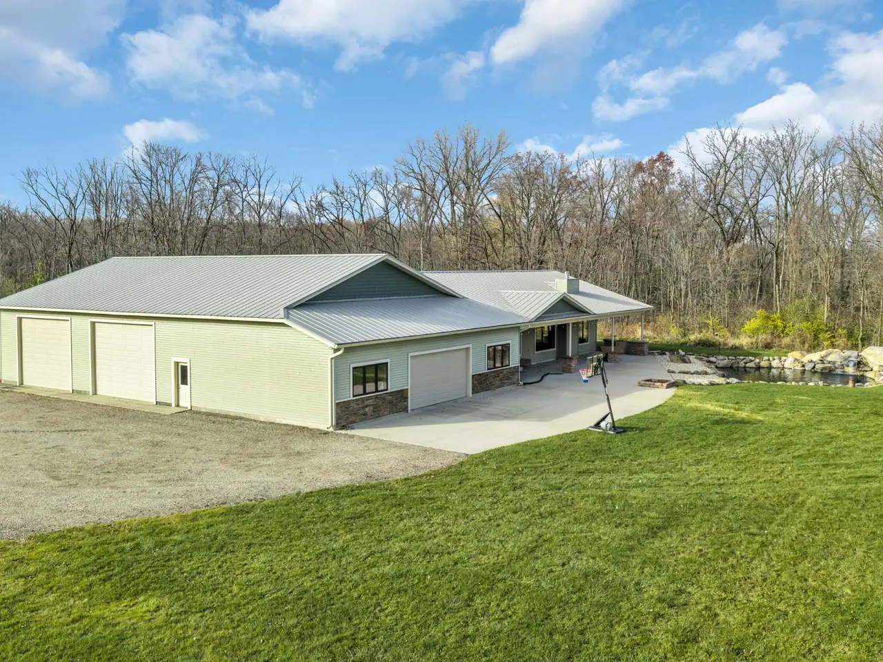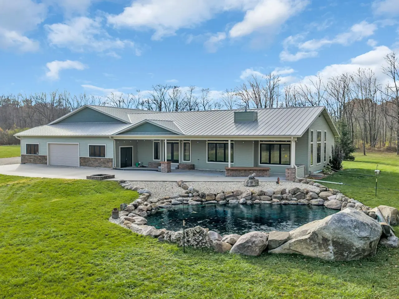 Discover the epitome of refined country living in this stunning estate, with 2x6 construction and perfectly set back off the road on 27 acres of pristine, secluded woodland. Every inch of this residence has been thoughtfully designed to harmonize modern sophistication with natural beauty, offering a sanctuary that is both inspiring and serene. The open-concept interior features 12-ft ceilings, LVP flooring, and warm modern finishes showcasing comfort and craftsmanship. A spacious finished downstairs is ready for your dreams to take shape. Two impressive attached outbuildings offer exceptional versatility with 14-ft ceilings, 12-ft doors, and reinforced 8-inch concrete floors, including a heated workshop with car lift, half bath, and premium lighting. Outdoors, immerse yourself in your own private sanctuary complete with a waterfall pond, winding ATV and walking trails, and breathtaking views in every direction. Whether entertaining guests, pursuing passions, or unwinding in complete solitude, this remarkable property delivers luxury, comfort, and freedom without compromise. All furry friends welcome!