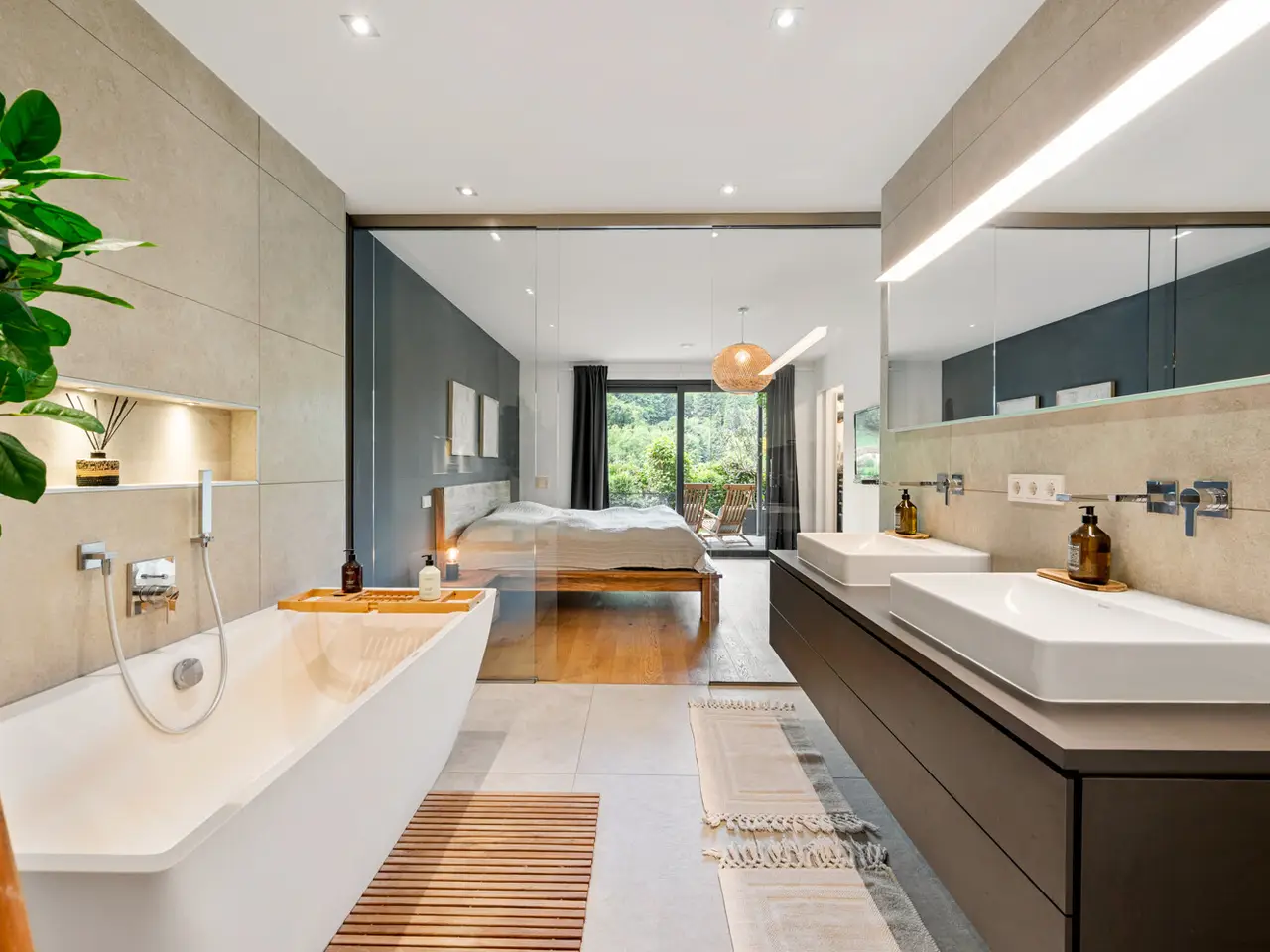 • Luxurious bathroom with glass wall separation