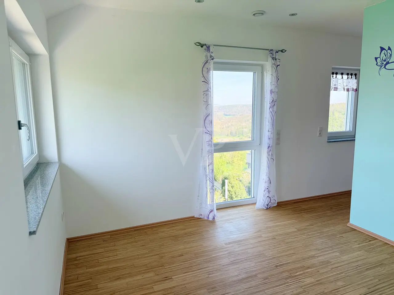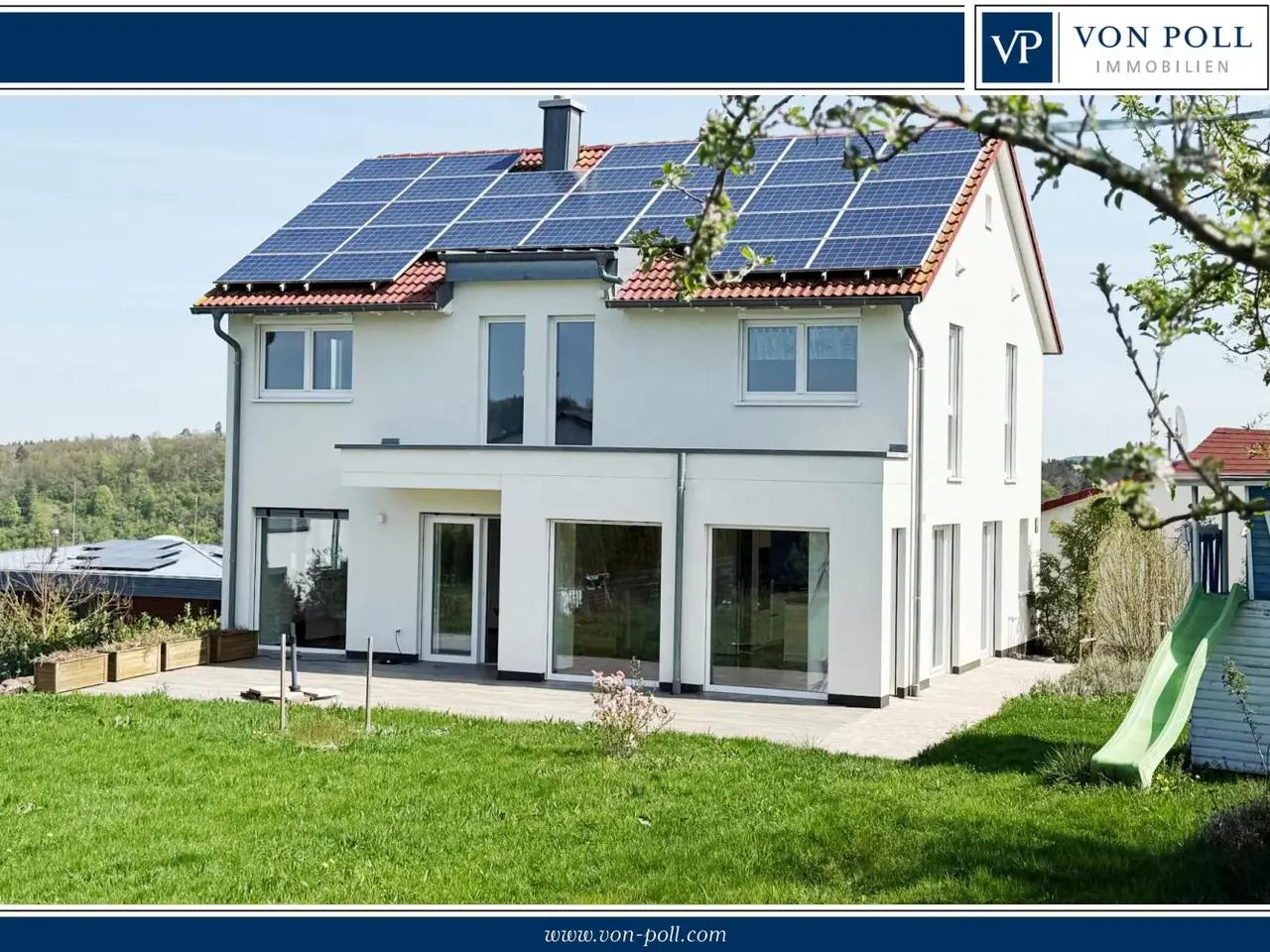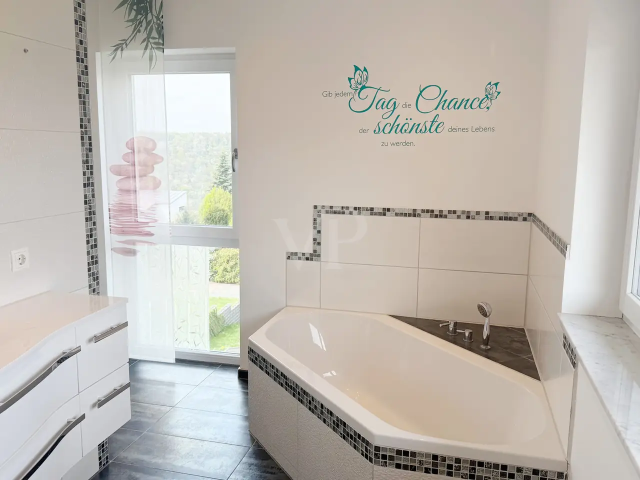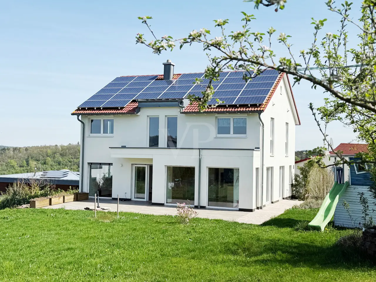 Are you looking for a modern home in a privileged location in Wertheim, with breathtaking views and a large plot of land with 2 separate plots? Then this property will make your heart beat faster. Built in 2016, the house with 2 full storeys and a basement is technically up to date. The ground floor and second floor have approx. 225 m² of living space and leave nothing to be desired. In the entrance area on the first floor, you are first greeted by a spacious hallway with a guest bathroom on the left and a room (office) on the right, before entering the spacious living and dining area. Here, the numerous floor-to-ceiling windows create a bright and friendly atmosphere and also offer several access points to the natural stone terrace. The modern L-shaped kitchen with cooking island has an open design and fits perfectly into the picture. High-quality Doussie parquet flooring was laid on the first floor. This wood has a particularly elegant, warm appearance and is very durable and hard-wearing. The triple-glazed windows are fitted with electric aluminum exterior blinds. A chimney flue built into the living area offers the option of installing a wood-burning stove with little effort. The folding staircase made of solid beech wood leads to the upper floor, which is fitted with high-quality Fineline parquet flooring. A highlight of this floor is the light-flooded gallery, which has 2 floor-to-ceiling windows and therefore invites you to read and relax. The 2 bright, large children's bedrooms, the master bedroom with dressing room and the daylight bathroom with shower and corner bath complete the offer on this floor. The house has a full basement with a cellar room, a technical room, a utility room and a separable apartment/office unit with a shower room in the shell, which can still be designed according to your ideas. The apartment/office unit has a separate entrance and a terrace. The underfloor heating installed throughout the house provides pleasant, even warmth, with the air heat pump standing for energy efficiency! Most of the electricity for heating and the house is generated by the installed photovoltaic system (approx. 20 kWp) and is also made available at night by the built-in electricity storage units (approx. 19 kWh). A controlled ventilation system with heat recovery also ensures energy efficiency and a pleasant indoor climate. The separate double garage with electric sectional door has a power connection where a wall box can be installed for charging electric cars. The outdoor area to the entrance areas on the ground floor and basement was designed with great attention to detail. A great house in a prime location with fantastic views awaits you here!