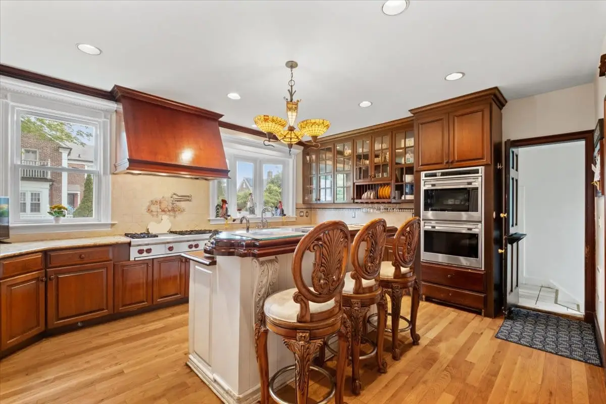 Welcome to 225 Pennsylvania Avenue, an elegant Center Hall Colonial nestled in the heart of Mount Vernon’s Chester Hill Park. Step into a grand marble foyer that sets the tone for this stately seven-bedroom, three and a half bath residence. Rich parquet wood floors flow seamlessly throughout, enhancing the warmth and sophistication of each room. The exquisite custom kitchen is a chef's dream, featuring top-of-the-line Wolf appliances, a custom paneled Sub-Zero refrigerator, a farmhouse sink, and impeccable cabinet and counter design details. Entertain in style in the spacious formal living and dining rooms, anchored by an oversized marble fireplace. The sunroom is bathed in natural light through newly installed thermal windows and framed with beautiful crown molding. Upstairs, generously sized bedrooms offer comfort and flexibility for any lifestyle. Outside, pristine landscaping surrounds a koi pond and trellis, creating a private outdoor oasis. A true blend of classic architecture and modern luxury- this home is not to be missed.