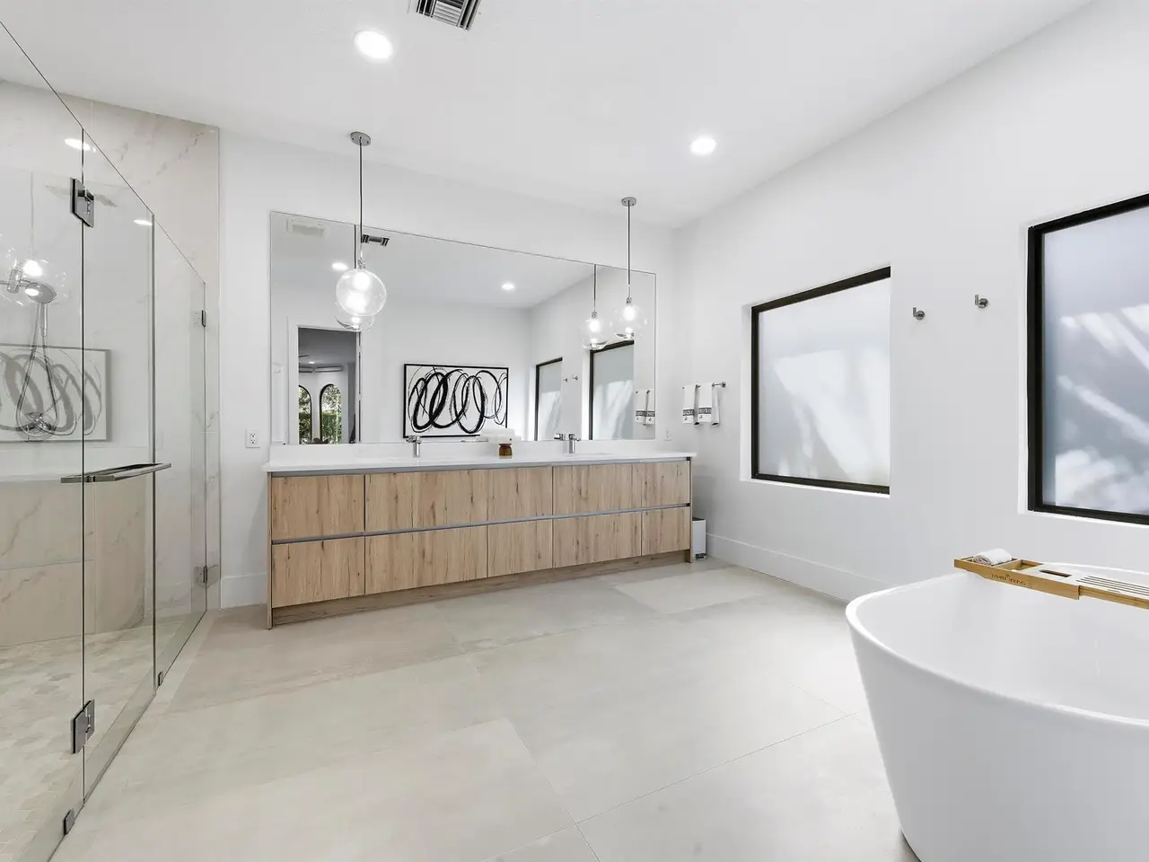 Effortless Modern Luxury in Bear Lakes. Experience the pinnacle of modern design and South Florida living in this fully reimagined one-story residence, nestled on a quiet cul-de-sac within the prestigious gated community of Bear Lakes on Seminole Circle. Meticulously renovated and curated for those who value minimalism, refined comfort, and open-concept living, this 4-bedroom plus flex room (optional 5th bedroom), 4.5-bath home offers 4,505 square feet of luxurious living space designed for both everyday ease and grand entertaining.Step inside through a 15-foot foyer illuminated by a designer chandelier, leading into an expansive great room with 13-foot ceilings and sliders that open to a serene marble courtyard--creating a seamless indoor-outdoor connection.