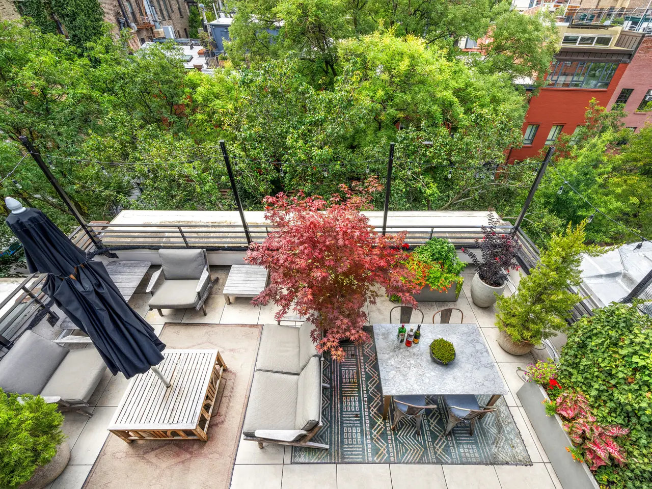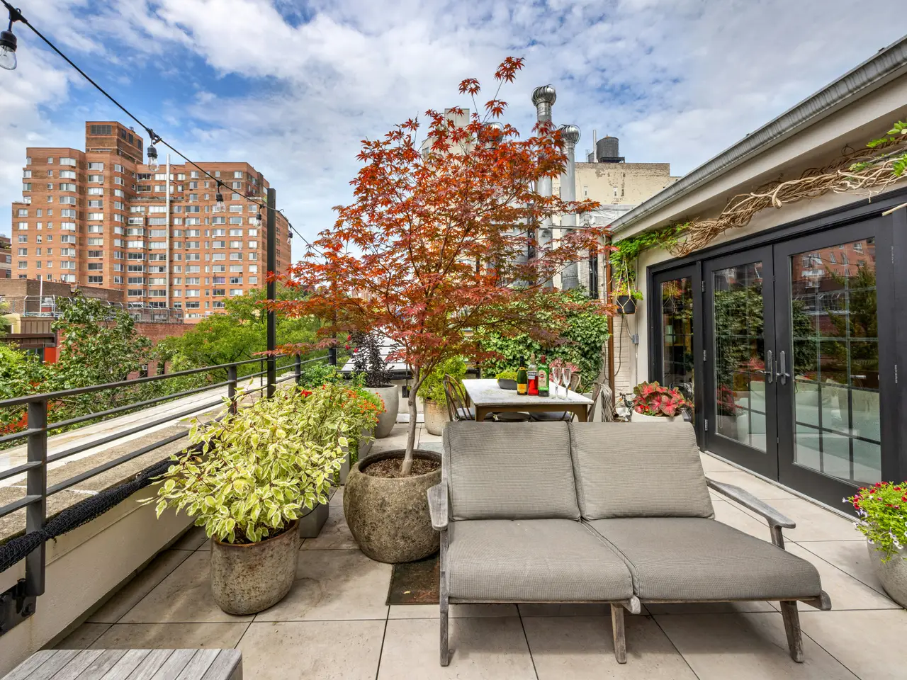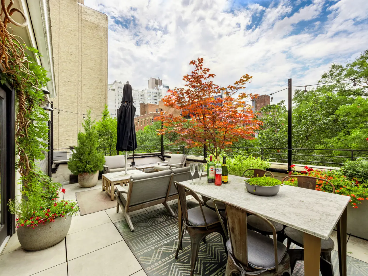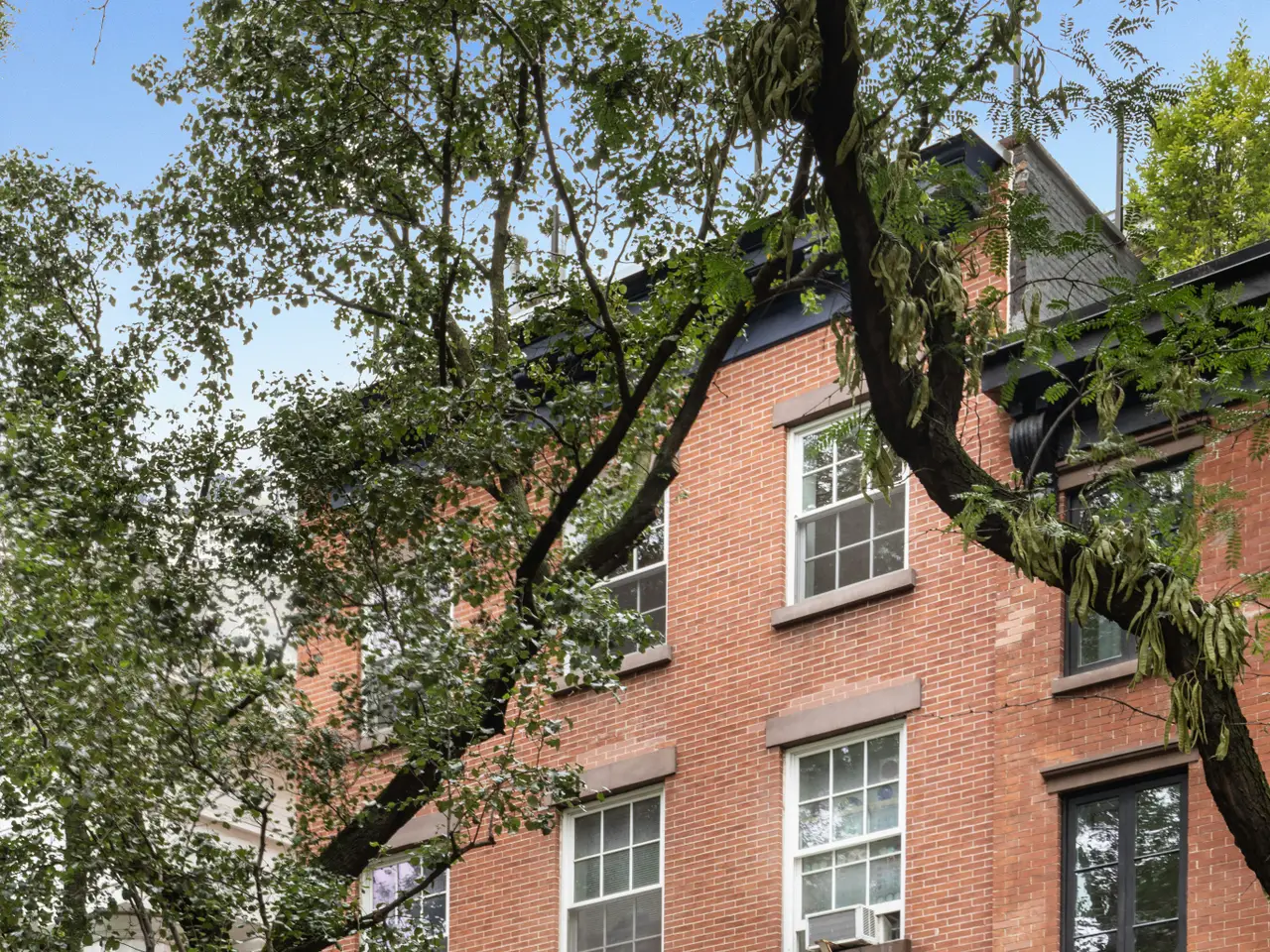 Unit 4 at 139 West 13th Street is a rarely available penthouse duplex perched atop a charming, tree-lined block, offering a serene escape in one of Manhattan's most coveted neighborhoods. Once featured in Architectural Digest, this three-bedroom, two living area, two-bathroom home has been thoughtfully renovated and designed to respect the history of the 25'-wide, 19th-century Greek Revival brick building that it sits in. As you enter unit 4, you are welcomed into a large and open kitchen, living, and dining set-up. This inviting space has three large south-facing mullioned picture windows that overlook West 13th Street as well as a wood-burning fireplace with an electric extractor fan. Just a step away, the windowed kitchen adds a layer of warmth thanks to its Brazilian marble waterfall island, matching backsplash and black farmhouse sink, rich in color. There are brand new high-end Miele appliances, including a refrigerator, oven with vented hood, five-burner stovetop, and dishwasher. One could not ask for a more ideal entertaining space. Nestled towards the back of the home on this same level is the primary bedroom which was renovated to include a new built-in headboard and drapery. A full bathroom is located right off of this bedroom in addition to a dedicated closet housing the high-capacity in-unit washer and vented gas dryer. A second bedroom, currently serving as a dedicated dressing room for the primary bedroom complete with a high-capacity custom built in closet, puts the finishing touches to this wing. The upper level of this charming pre-war duplex residence consists of a second living room space, a guest bedroom, home office with built in shelving and desk, walk in closet and full bathroom. The living room features new millwork complemented by a stunning carved alabaster lighting fixture, a built-in media unit with complementary shelving, and beautiful south facing glass French doors leading straight onto the 300SF private roof deck, a truly defining feature of this unique property. This open, south-facing landscaped outdoor space comfortably allows for a split lounge and dining arrangement. There is automatic water reticulation of all of the lush planter boxes and pots. This idyllic retreat overlooks countless trees and the neighboring picturesque townhomes lining West 13th Street, and is simply a delight for the eye. Additional recent upgrades done to the home include new dimmable LED lighting and A/C units throughout as well as new HiFi speaker wiring, privacy blinds, carpeting, ambiently backlit handrail along the stairs and installation of clever storage. Please note that any incoming purchaser may have the rare opportunity to transform the upper rooftop into an additional private deck and garden oasis, with board approval. 139 West 13th Street is an intimate and well-run co-op originally built in 1910. Right in the heart of the West Village, you are just a stone's throw away from top dining and shopping, cultural institutions, and several public transportation lines. Pied-a-terre ownership is permitted, and pets are welcome on a case-by-case basis. This is a two-flight walk-up.