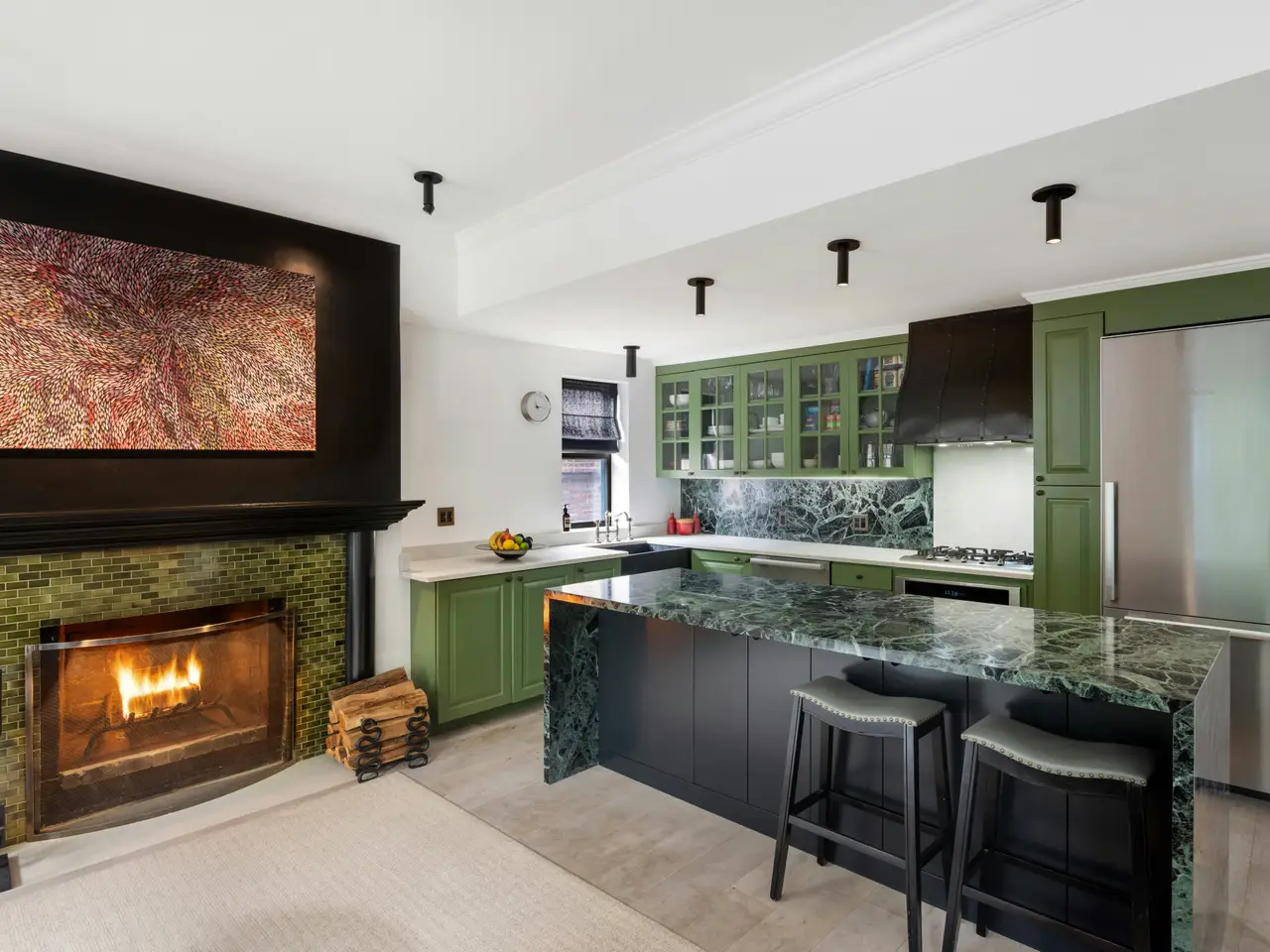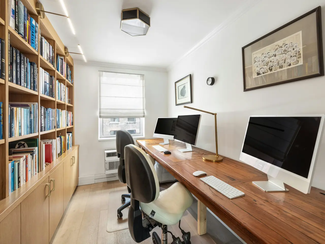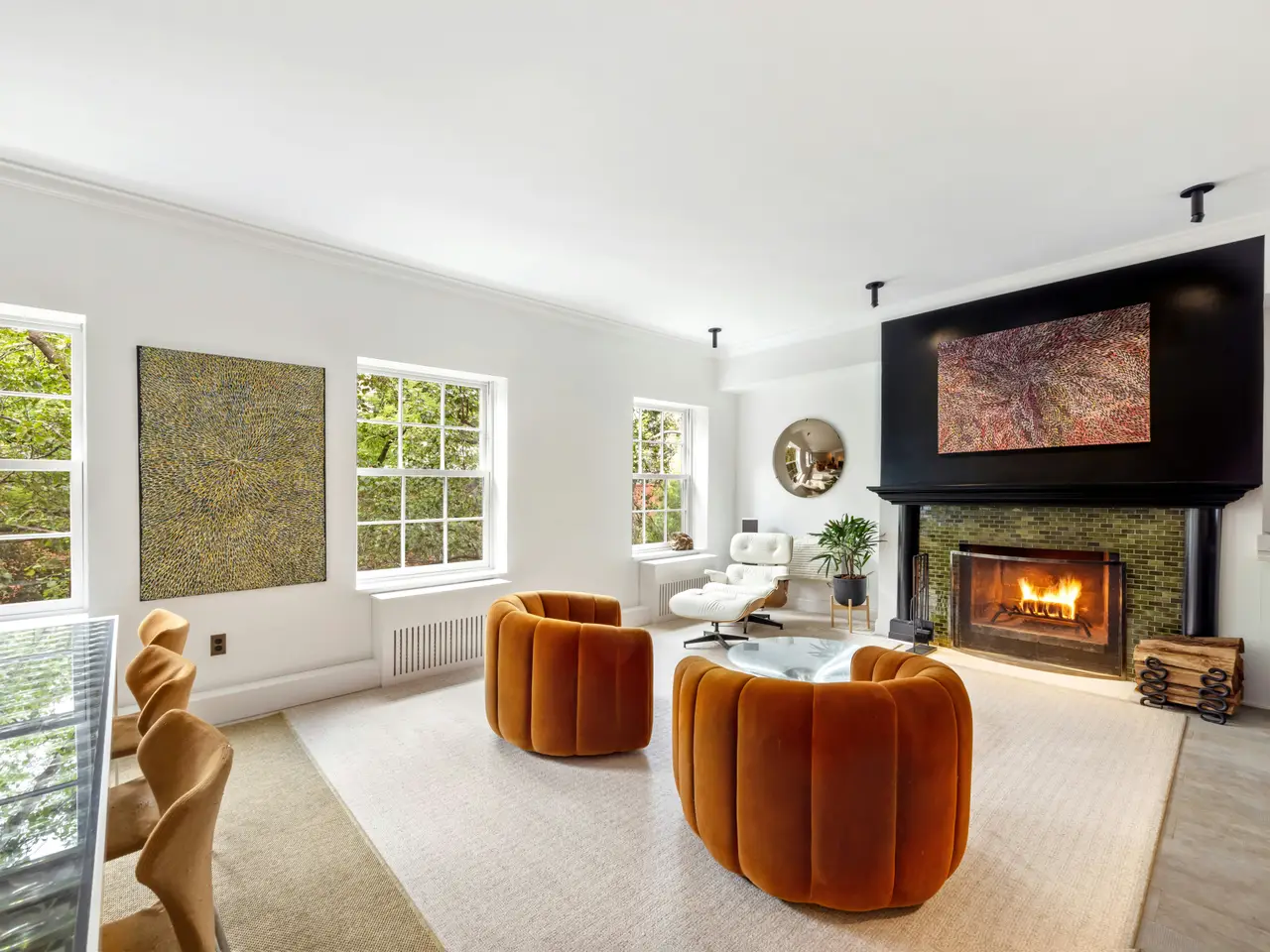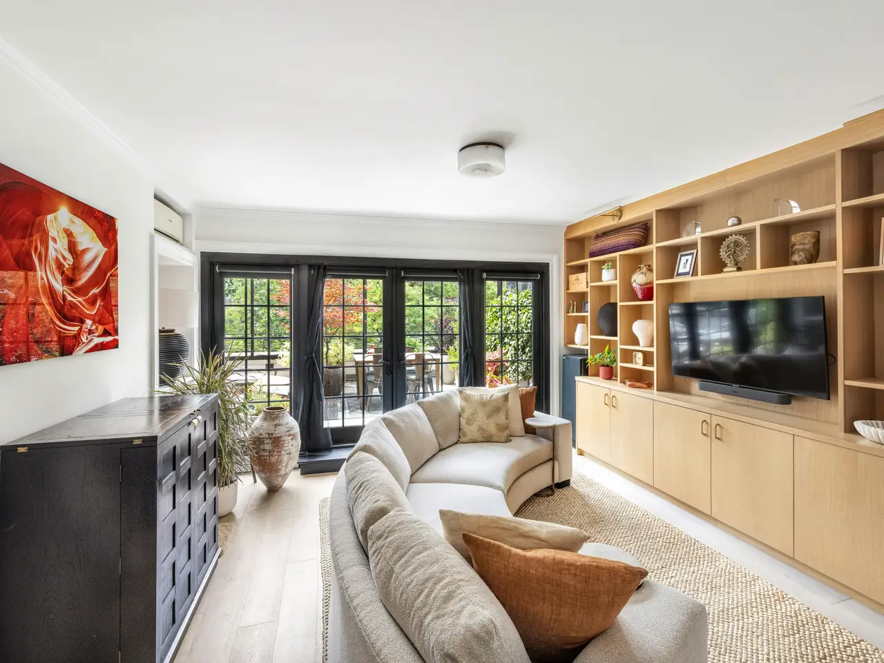 Unit 4 at 139 West 13th Street is a rarely available penthouse duplex perched atop a charming, tree-lined block, offering a serene escape in one of Manhattan's most coveted neighborhoods. Once featured in Architectural Digest, this three-bedroom, two living area, two-bathroom home has been thoughtfully renovated and designed to respect the history of the 25'-wide, 19th-century Greek Revival brick building that it sits in. As you enter unit 4, you are welcomed into a large and open kitchen, living, and dining set-up. This inviting space has three large south-facing mullioned picture windows that overlook West 13th Street as well as a wood-burning fireplace with an electric extractor fan. Just a step away, the windowed kitchen adds a layer of warmth thanks to its Brazilian marble waterfall island, matching backsplash and black farmhouse sink, rich in color. There are brand new high-end Miele appliances, including a refrigerator, oven with vented hood, five-burner stovetop, and dishwasher. One could not ask for a more ideal entertaining space. Nestled towards the back of the home on this same level is the primary bedroom which was renovated to include a new built-in headboard and drapery. A full bathroom is located right off of this bedroom in addition to a dedicated closet housing the high-capacity in-unit washer and vented gas dryer. A second bedroom, currently serving as a dedicated dressing room for the primary bedroom complete with a high-capacity custom built in closet, puts the finishing touches to this wing. The upper level of this charming pre-war duplex residence consists of a second living room space, a guest bedroom, home office with built in shelving and desk, walk in closet and full bathroom. The living room features new millwork complemented by a stunning carved alabaster lighting fixture, a built-in media unit with complementary shelving, and beautiful south facing glass French doors leading straight onto the 300SF private roof deck, a truly defining feature of this unique property. This open, south-facing landscaped outdoor space comfortably allows for a split lounge and dining arrangement. There is automatic water reticulation of all of the lush planter boxes and pots. This idyllic retreat overlooks countless trees and the neighboring picturesque townhomes lining West 13th Street, and is simply a delight for the eye. Additional recent upgrades done to the home include new dimmable LED lighting and A/C units throughout as well as new HiFi speaker wiring, privacy blinds, carpeting, ambiently backlit handrail along the stairs and installation of clever storage. Please note that any incoming purchaser may have the rare opportunity to transform the upper rooftop into an additional private deck and garden oasis, with board approval. 139 West 13th Street is an intimate and well-run co-op originally built in 1910. Right in the heart of the West Village, you are just a stone's throw away from top dining and shopping, cultural institutions, and several public transportation lines. Pied-a-terre ownership is permitted, and pets are welcome on a case-by-case basis. This is a two-flight walk-up.