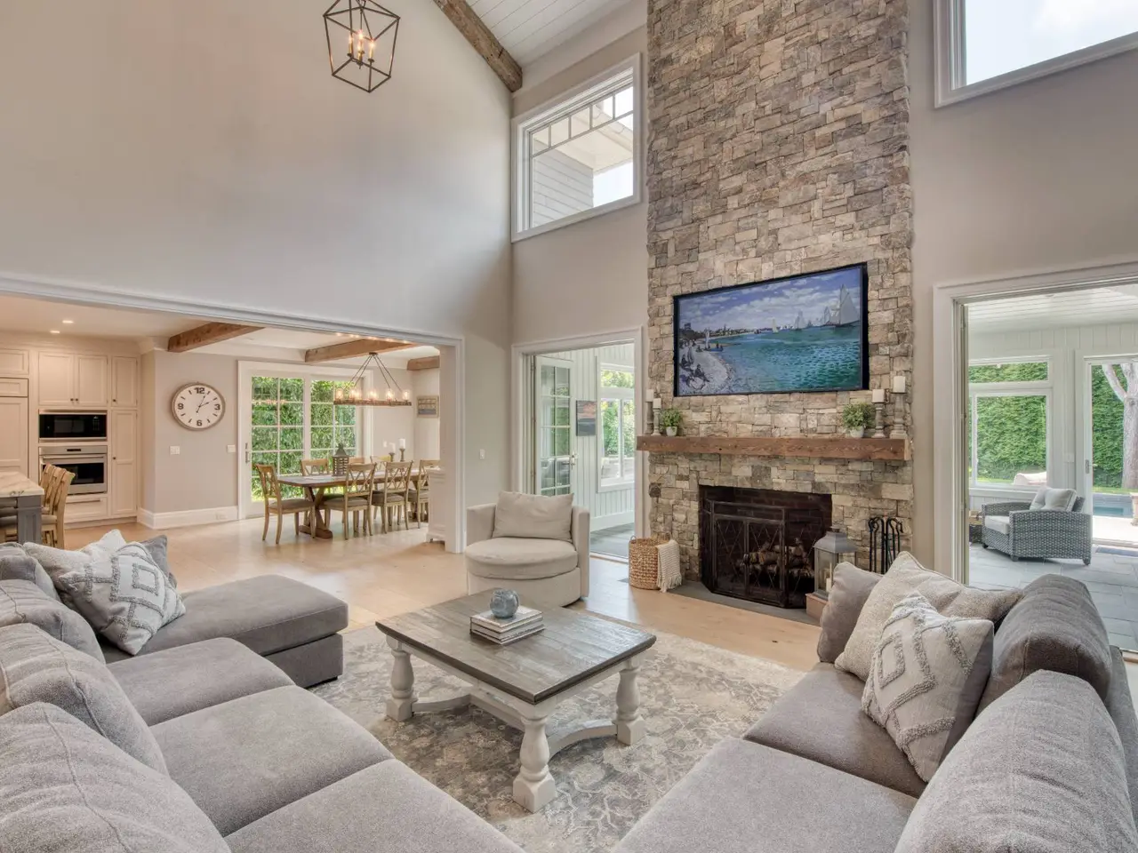 Close to Main Street shops and restaurants including Rogers Beach and the Westhampton Beach Country Club. Excellent quality construction. Three car garage. Professional kitchen with custom built cabinetry and high-end stainless appliances featuring Wolf and Sub Zero. Living room with double-sided wood-burning fireplace to sunroom. Barn style doors. Wire cables, double height ceilings. Hardwood floors. There is custom trim throughout the house, including shiplap. First floor primary with walk-in closet and changing area. Bath with radiant floor heat, separate soaking tub and shower. Spacious yard, heated gunite pool with custom stadium style steps. Finish lower level that includes an exercise area and access to the garage and first floor. Ample exterior entertaining areas, including stone, patio, and built-in barbecue area.