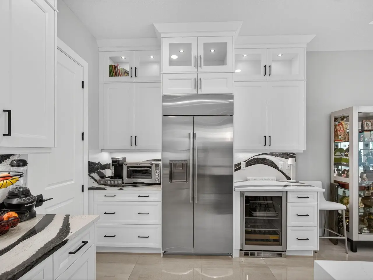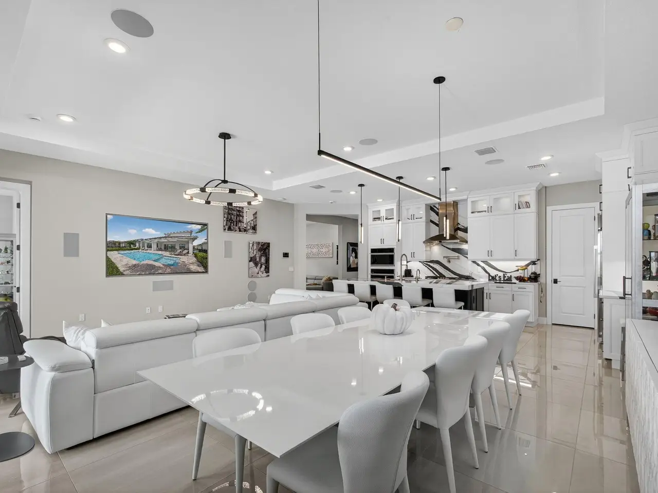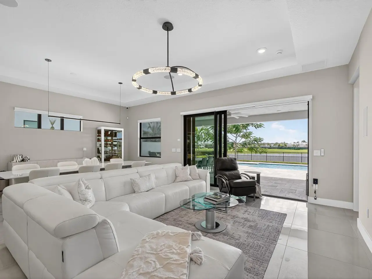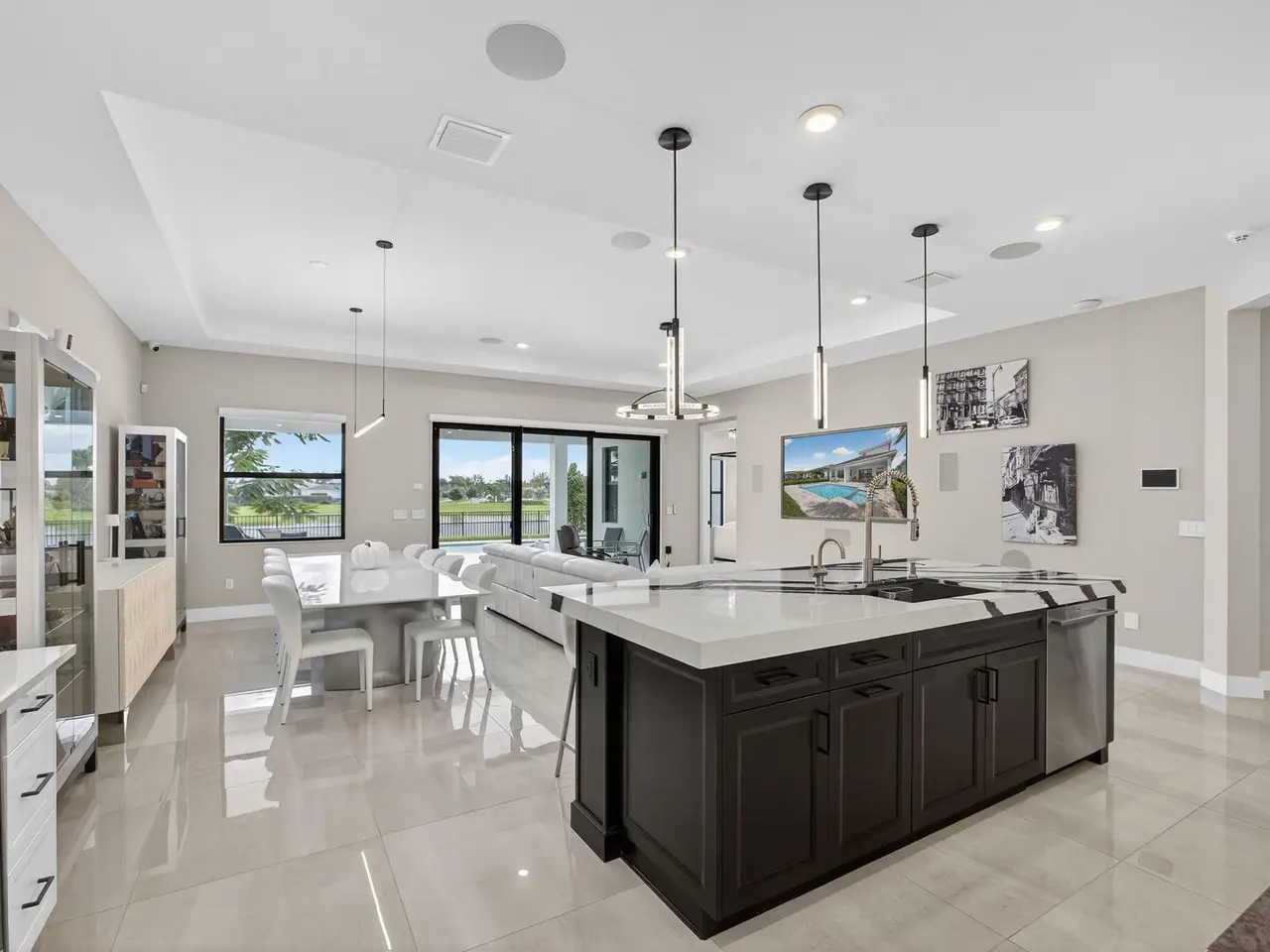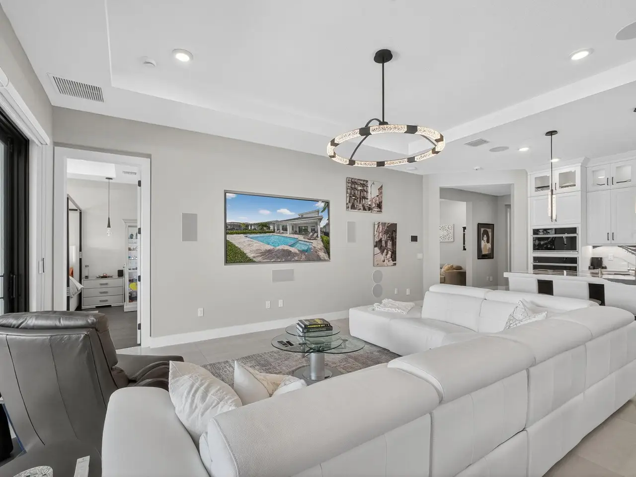This is luxury Florida living at its finest, located on a waterfront lot, this designer styled home has been thoughtfully crafted with limitless upgrades and high-end finishes. The focal point of this home is the gourmet kitchen with waterfall quartz counters, level 7 soft close cabinets, GE Monogram SS appliances, six burner gas stove top, massive island and custom walk in butlers pantry. The luxurious primary suite features hardwood flooring, an oversized his/her walk in closet, smart mirrors and a spa like bathroom. The outdoor space is a true oasis featuring a heated pool surrounded by travertine decking, water views and a storm smart screening system. Also enjoy smart home technology, complete indoor/outdoor surround sound system and modern home theatre.