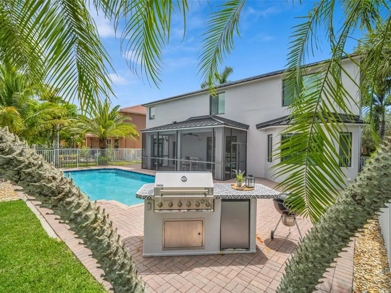 This showstopping, one-of-a-kind home is filled with upscale upgrades and eye-catching style! With 5 spacious bedrooms, a private office, and a flexible loft. all offering stunning lake views Brand-new 2024 metal roof and lush landscaping. Inside, soaring ceilings, a statement staircase, and sleek modern flooring create a grand welcome. The gourmet kitchen wows with a wine display, premium appliances, double ovens, and an oversized island. The primary suite offers a relaxing sitting area and spa-like bath with soaking tub. Enjoy the Florida lifestyle outdoors with a screened patio, summer kitchen, sparkling pool, & cabana bath. Located in the prestigious gated Isles at Weston, with a renovated clubhouse, resort-style amenities, and top-rated schools.