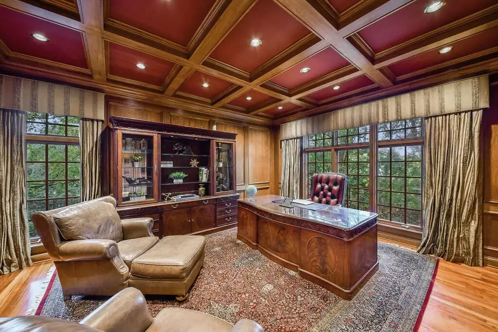 Richly paneled main floor library with coffered ceilings