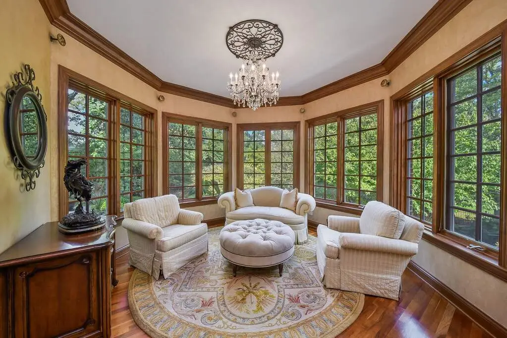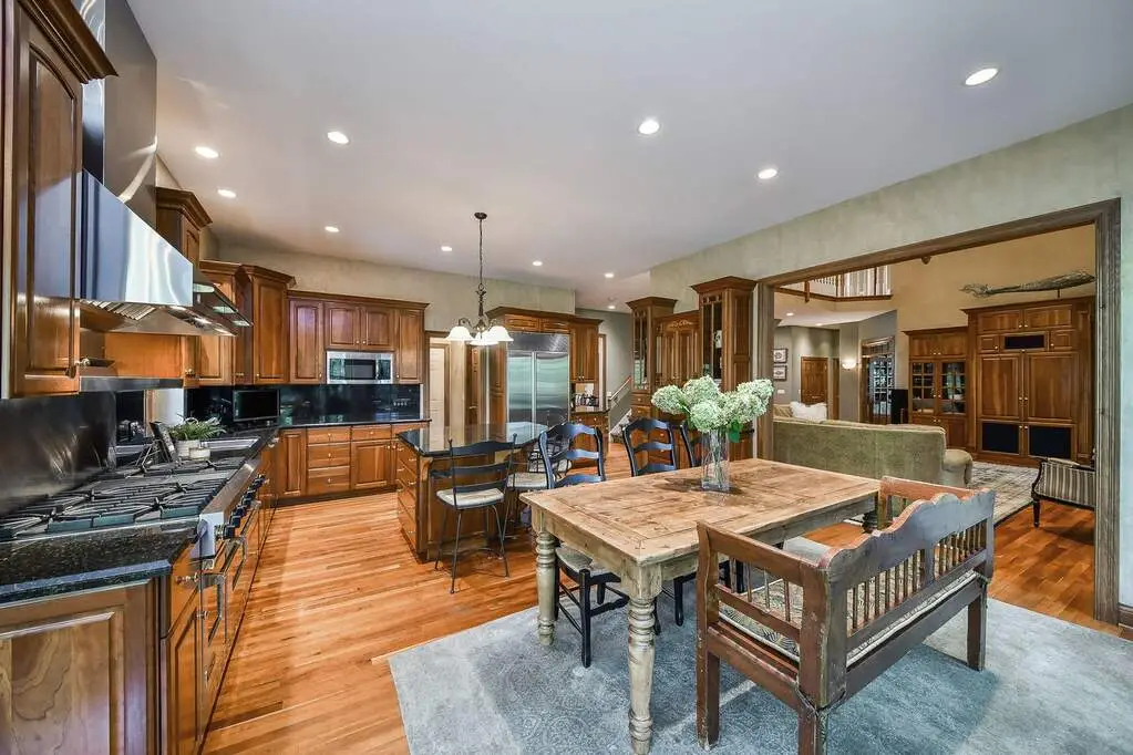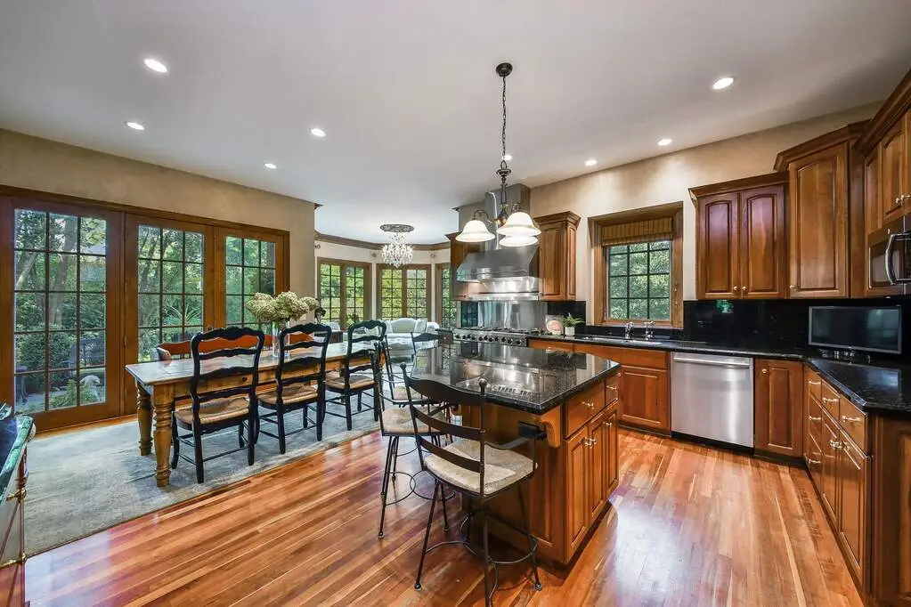 Gourmet kitchen with high-end appliances and sunlit sitting area