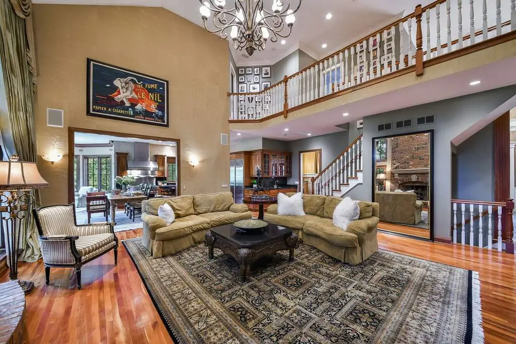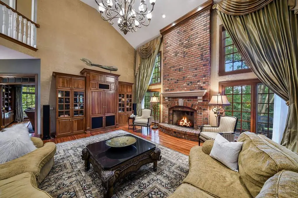 Expansive family room with vaulted ceiling and brick fireplace