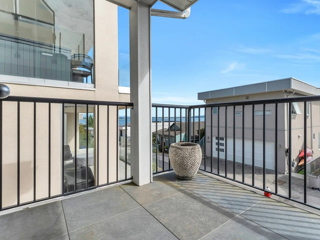 Ocean view updated 3 bedroom hillside home with 2 bedroom legal suite with separate access & laundry and great parking. Quality built home with hot water radiant heat for all 3 levels with 5 zones, low maintenance hardie plank siding. wood metal clad windows & sliding doors, 9' ceilings, tiled floors on the main floor with double 4' sliding doors leading to spacious ocean view deck featuring 2 cm porcelain tiles complimented with topless railings & privacy screens both sides of the deck. Some extra feature include wood interior doors and trims, tall baseboards, crown and detailed ceilings, gorgeous updated kitchen with cabinets to the ceiling complimented with stainless steel appliance package, quartz countertops, backsplash & matching island/breakfast bar with storage. Bonus media room!