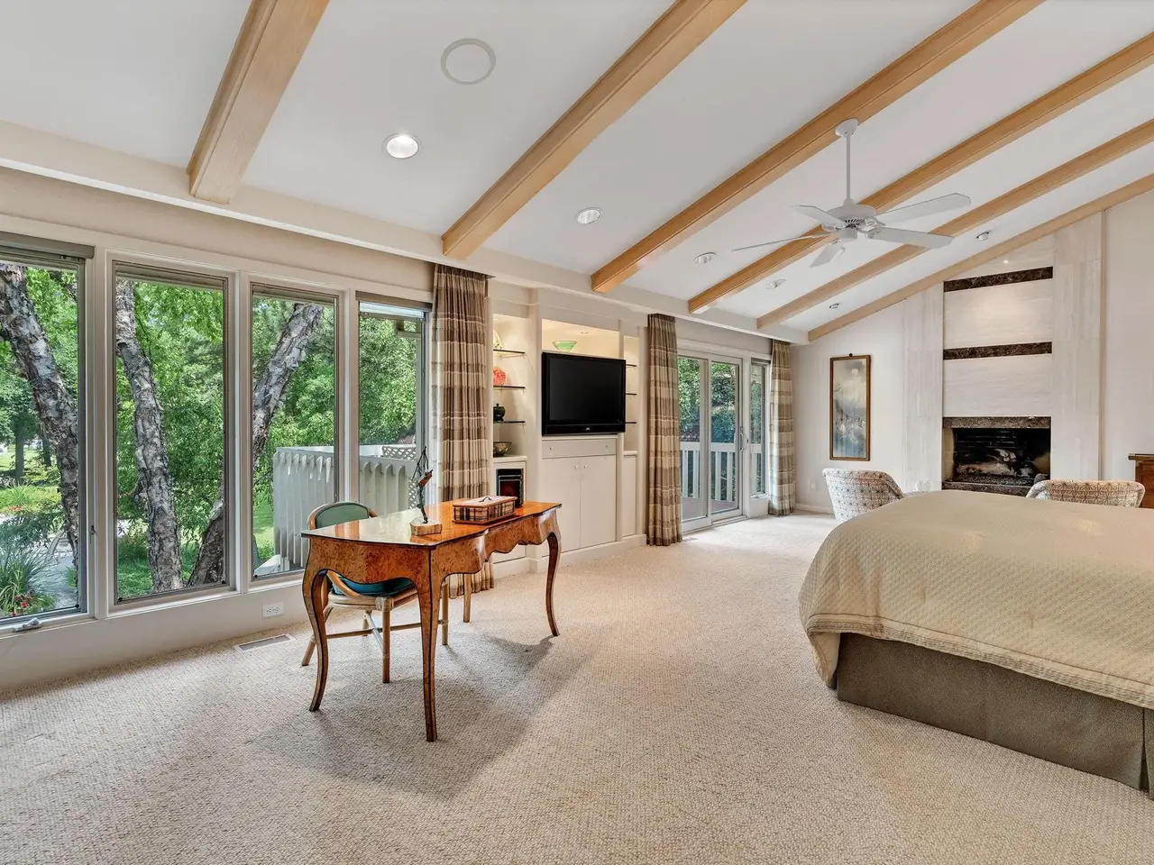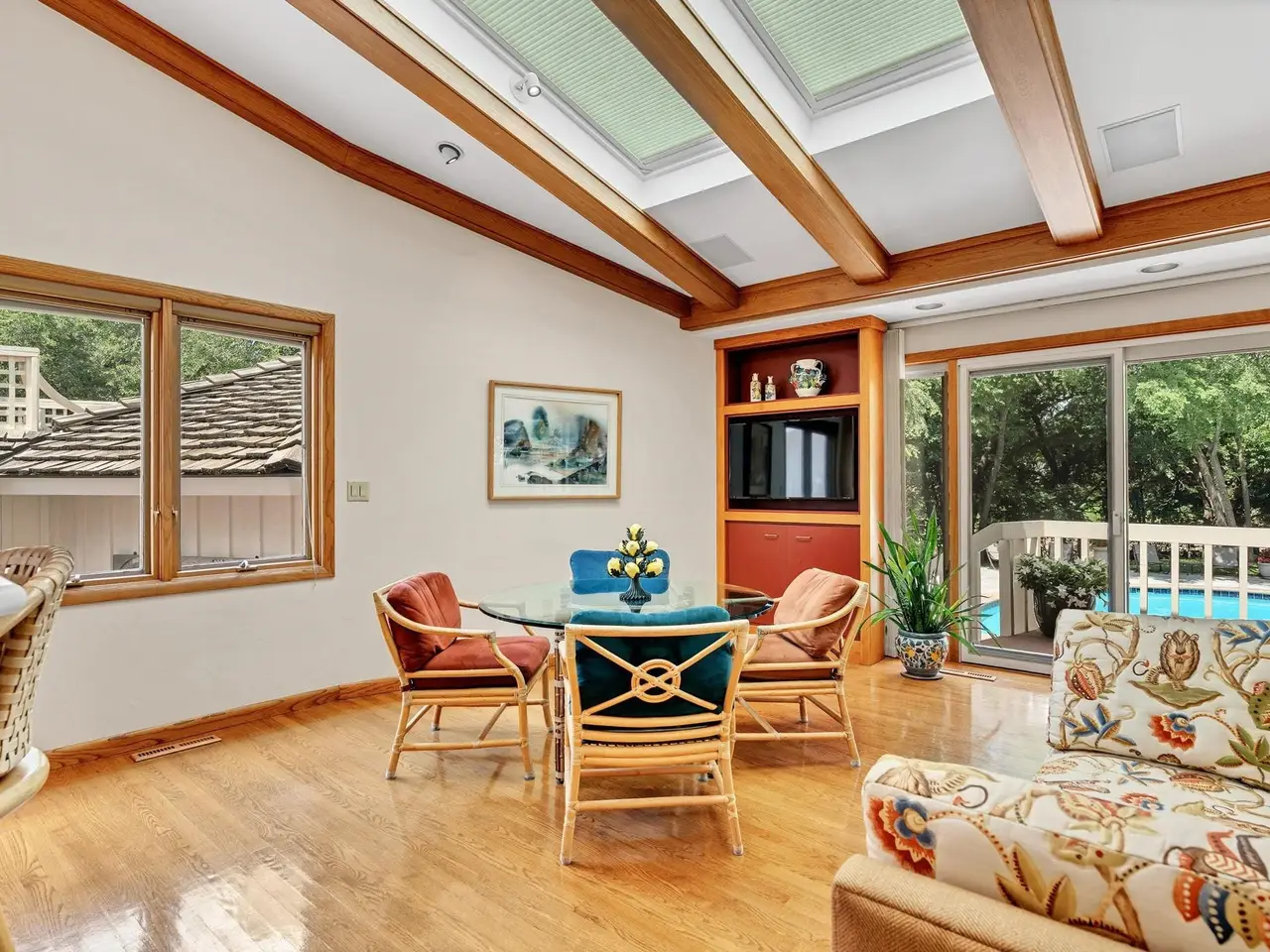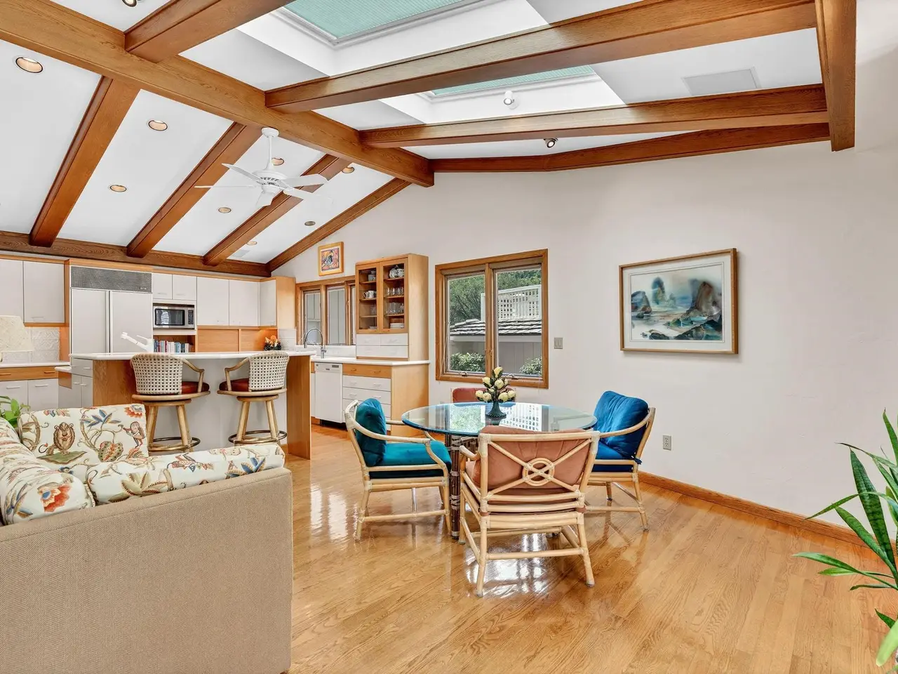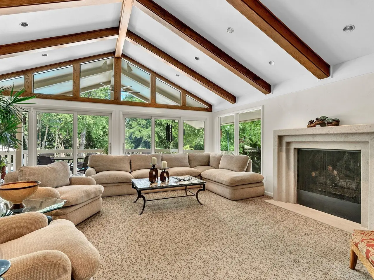 • Vaulted wood-beamed ceilings with cozy fireplace