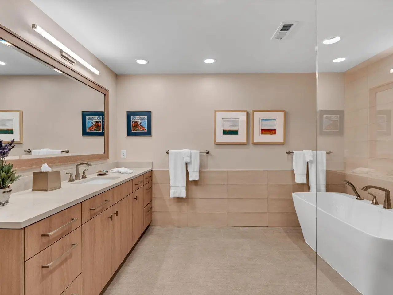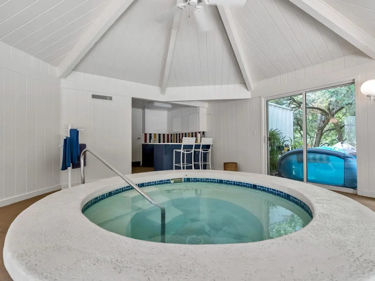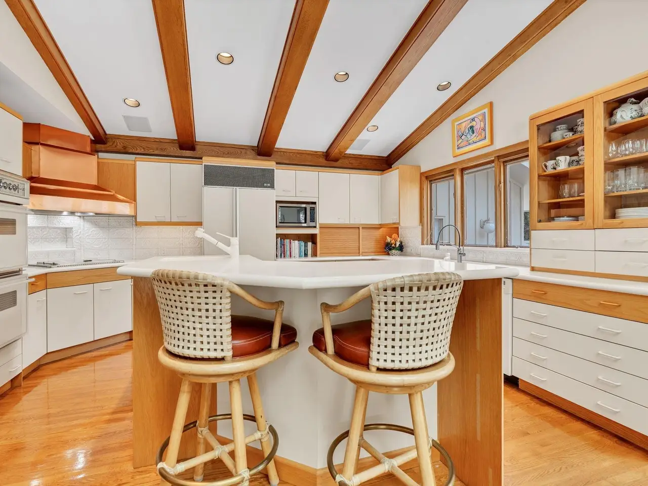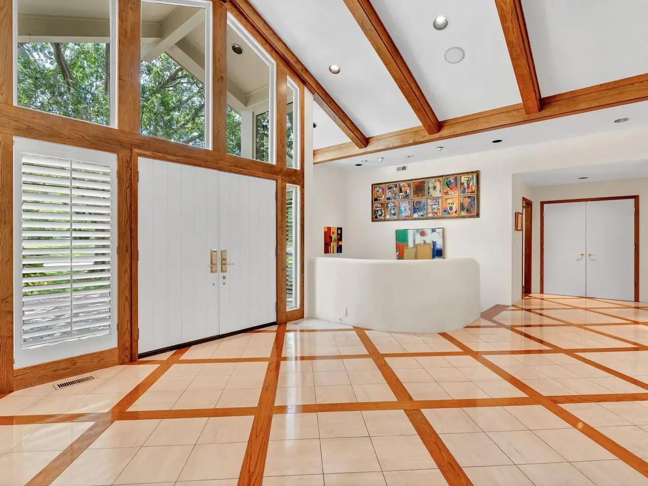 • Vaulted wood-beamed ceilings with cozy fireplace