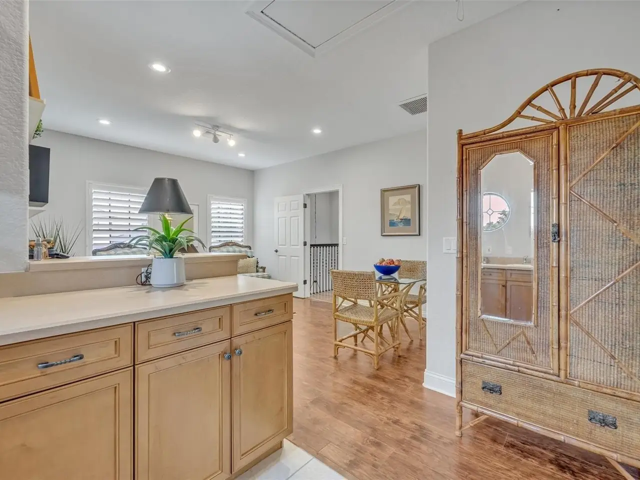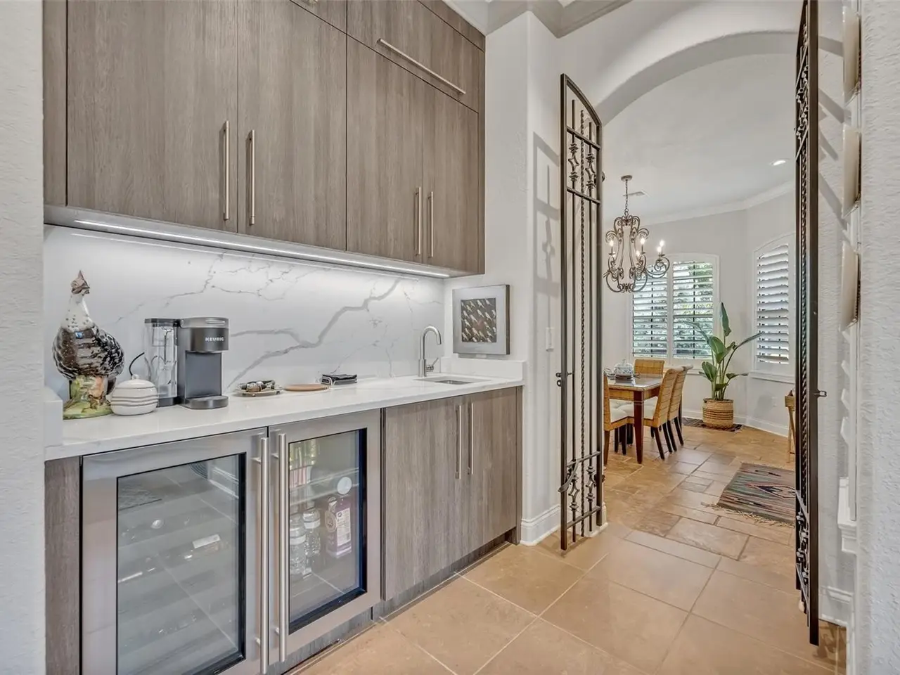 • Wine refrigerator at charming wet bar nook