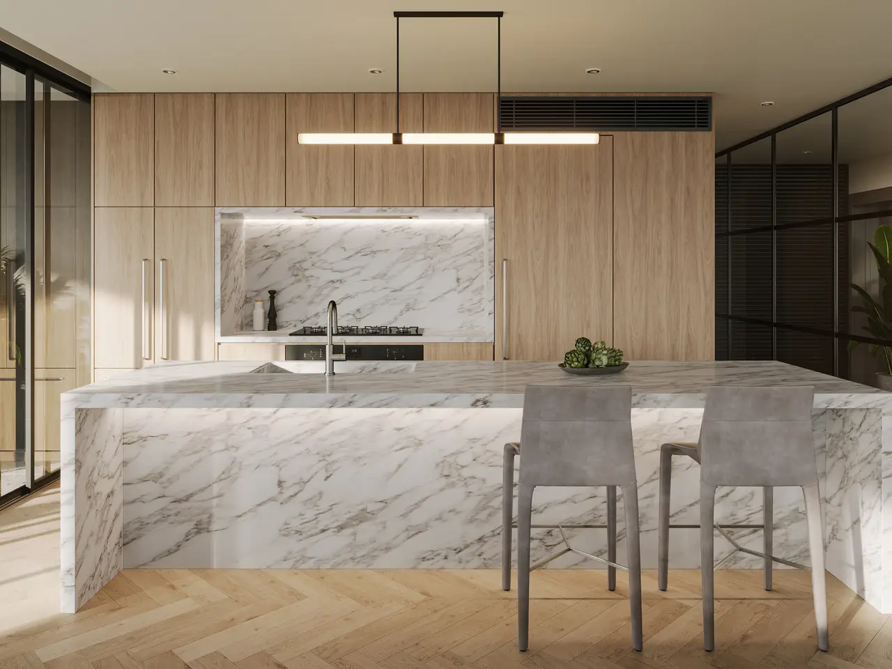 Sleek stone kitchens with butler's pantry