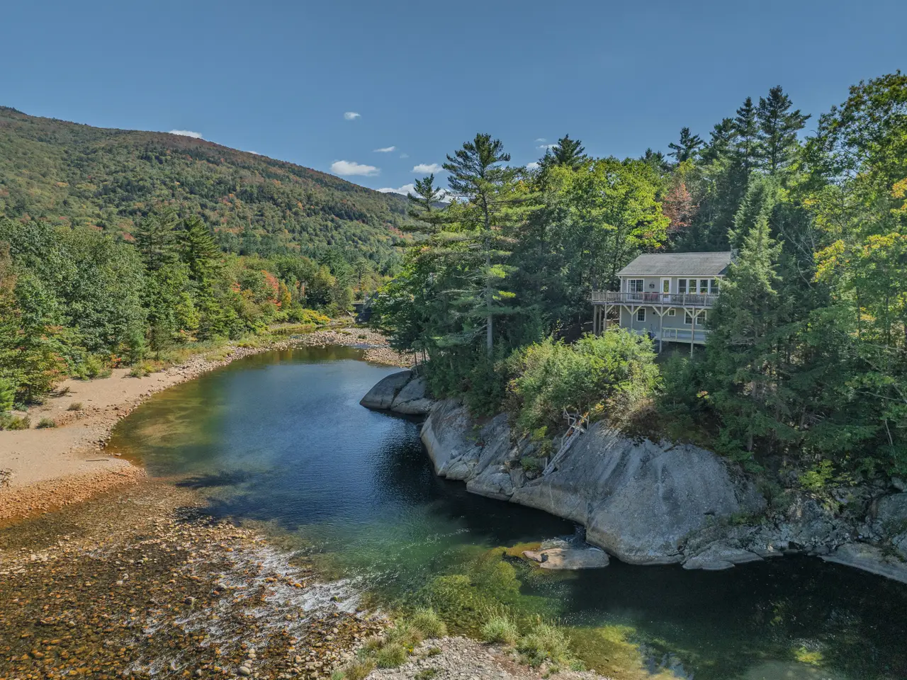 Rare Riverfront Retreat with Unmatched Views in the Heart of the White Mountains. A luxurious riverfront escape offering the best of both worlds: approximately 400 feet of prime, accessible frontage on the Pemigewasset River and stunning views down the mouth of Franconia Notch. Perched atop a scenic granite ledge on just under an acre, this remarkable property provides the perfect blend of nature, privacy, and convenience. Located less than a mile from Main Street in Lincoln, just three miles to Loon Mountain, and 10 miles to Cannon Mountain, you’re right in the heart of all the White Mountain region has to offer. Inside, the home features a bright and open layout, with a variety of rich hardwood floors and elegant tile throughout. The upper level boasts a spacious open-concept kitchen and living area, centered around a beautiful fireplace and flowing seamlessly out to a large deck—perfect for entertaining or soaking in the view. The primary suite occupies the top level, complete with a large walk-in closet and private access to the upper deck. Multiple stairways lead from the home to the yard, riverbank, and a cozy fire pit area. This home is being sold fully furnished, with an established rental history and professional property management in place for a seamless investment opportunity or private retreat. Private showings only—please do not enter the property without a scheduled appointment. Currently used as a four-bedroom home (with a three bedroom septic system).