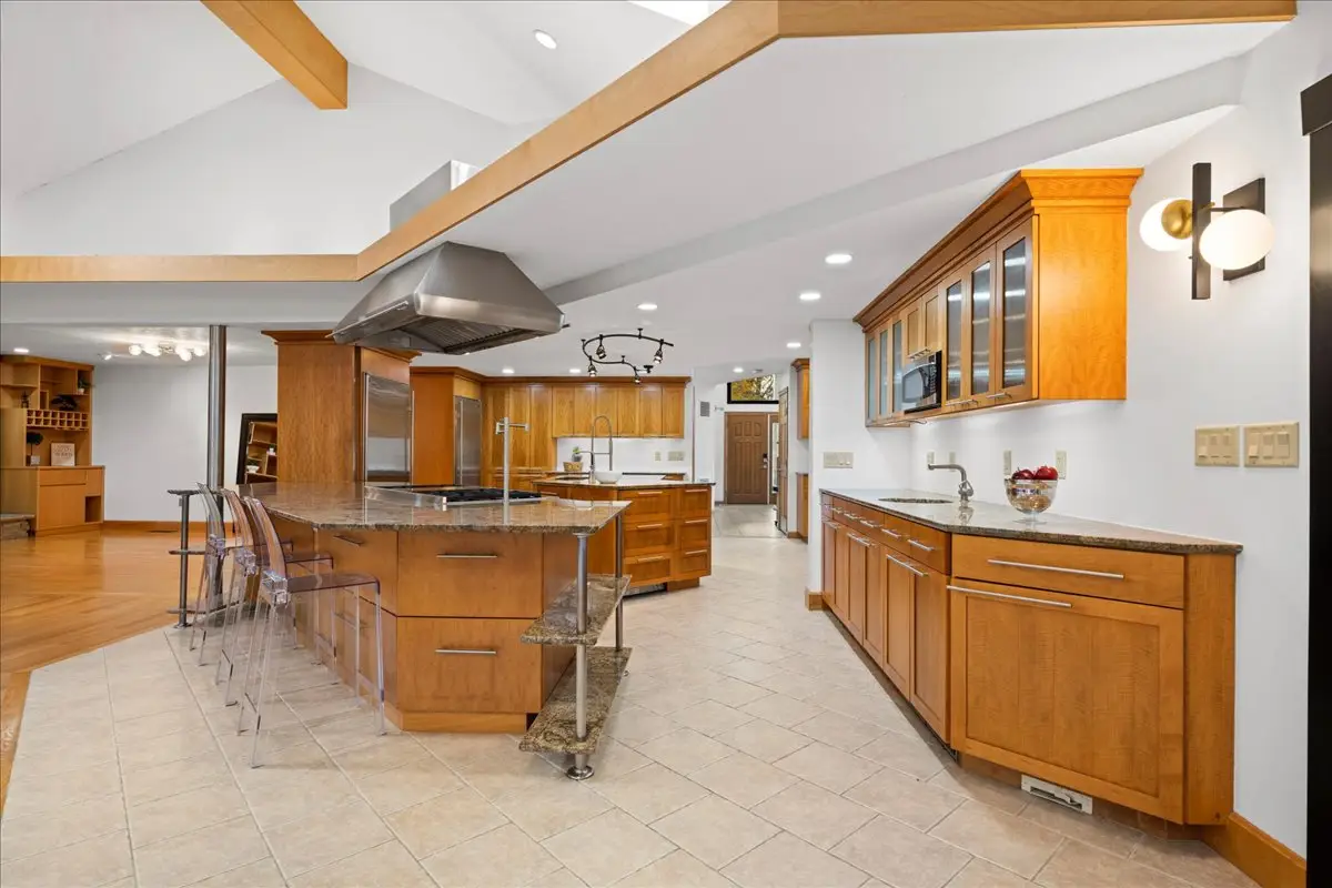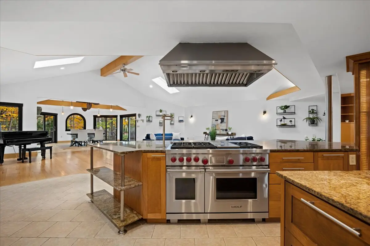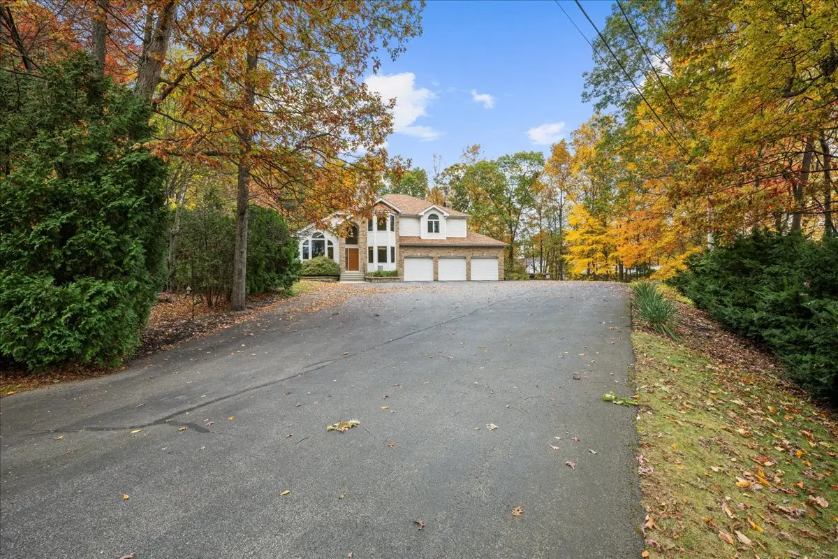 Set back for ultimate privacy - this stunning estate-style property is surrounded by mature trees and features a long, elegant driveway leading to an enchanting modern masterpiece. Inside, an impressive vaulted Great Room with skylights opens to a chef’s Kitchen with top-of-the-line appliances, while the vaulted Living and Dining area showcases beautiful maple floors. The Primary Suite offers hardwood floors, a bay window, and a spa-style bath with soaking tub, separate shower, and double sinks. Step outside to enjoy the heated in-ground pool, expansive patio, and outdoor entertainment area overlooking sweeping lawns. The finished lower level provides exceptional in-law potential with a bonus kitchen, full bath, media room, living room, den, and two additional flexible rooms ideal for offices, guest space, or a fitness area. A truly special property in a fantastic location—private yet convenient, with easy access to amenities.
