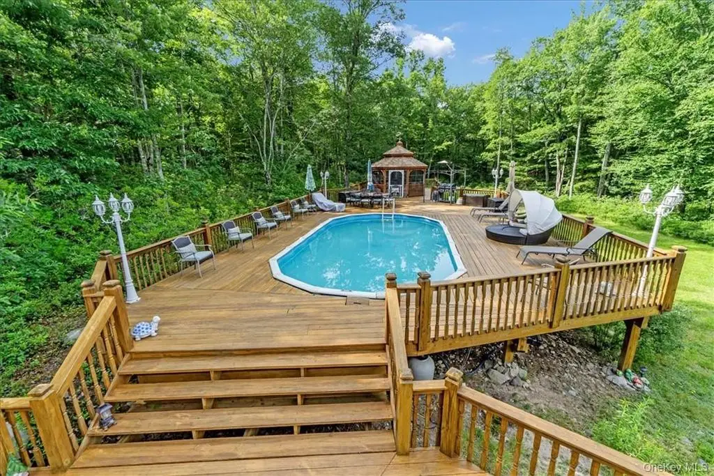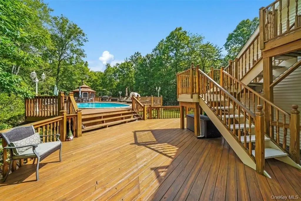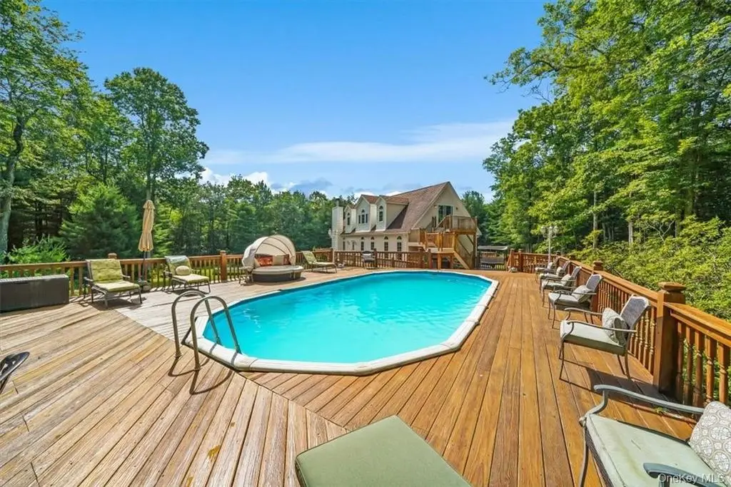 Welcome to this exquisite home nestled in a serene natural setting. This peaceful abode is surrounded by lush trees offering an idyllic retreat from daily life. The home has large windows throughout the house allowing for natural light to flood the living spaces and for breathtaking views of the surrounding natural beauty, greeting you at every turn. Home features an inviting above-ground pool for refreshing swims surrounded by a wrap-around deck providing ample space for outdoor dining, lounging and entertainment. Not a pool day? Make it a lake day!! as this home comes with lake rights to Pine Lake, a short stroll away. This is more than just a home, it's a sanctuary where you can immerse yourself in peace and tranquility surrounded by the timeless beauty of nature.